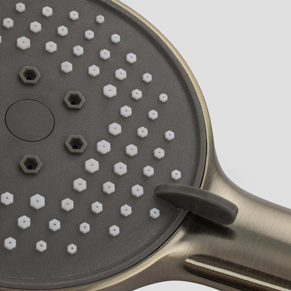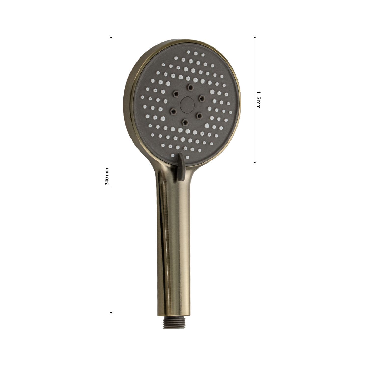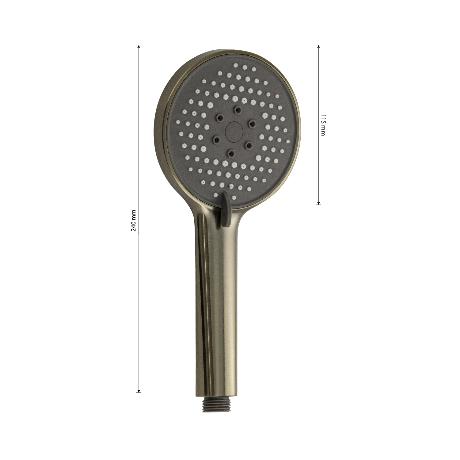 Душевая лейка массажная круглая, отличается современным технологичным дизайном, высокой надежностью, долговечностью. Она изготовлена из влагостойкого пластика АБС и имеет декоративное покрытие бронзового цвета, придающее устройству привлекательный вид и предохраняющее от агрессивного воздействия окружающей среды. Корпус отличается небольшим весом, что исключает повреждение напольной плитки или эмали ванны при случайном падении. Работает в двух режимах с регулируемой интенсивностью: обычная, струйный массаж. Ухаживать за душевой лейкой легко. Матовую поверхность достаточно протереть мягкой салфеткой, она в течение долгого времени не потеряет своего вида. Система помогает мгновенно очистить силиконовые форсунки душевой лейки от известкового налета и загрязнения. Габаритные размеры: высота 240 мм, диаметр лейки 115 мм. Вес - 0,250 кг, объём - 0,00160 м3.