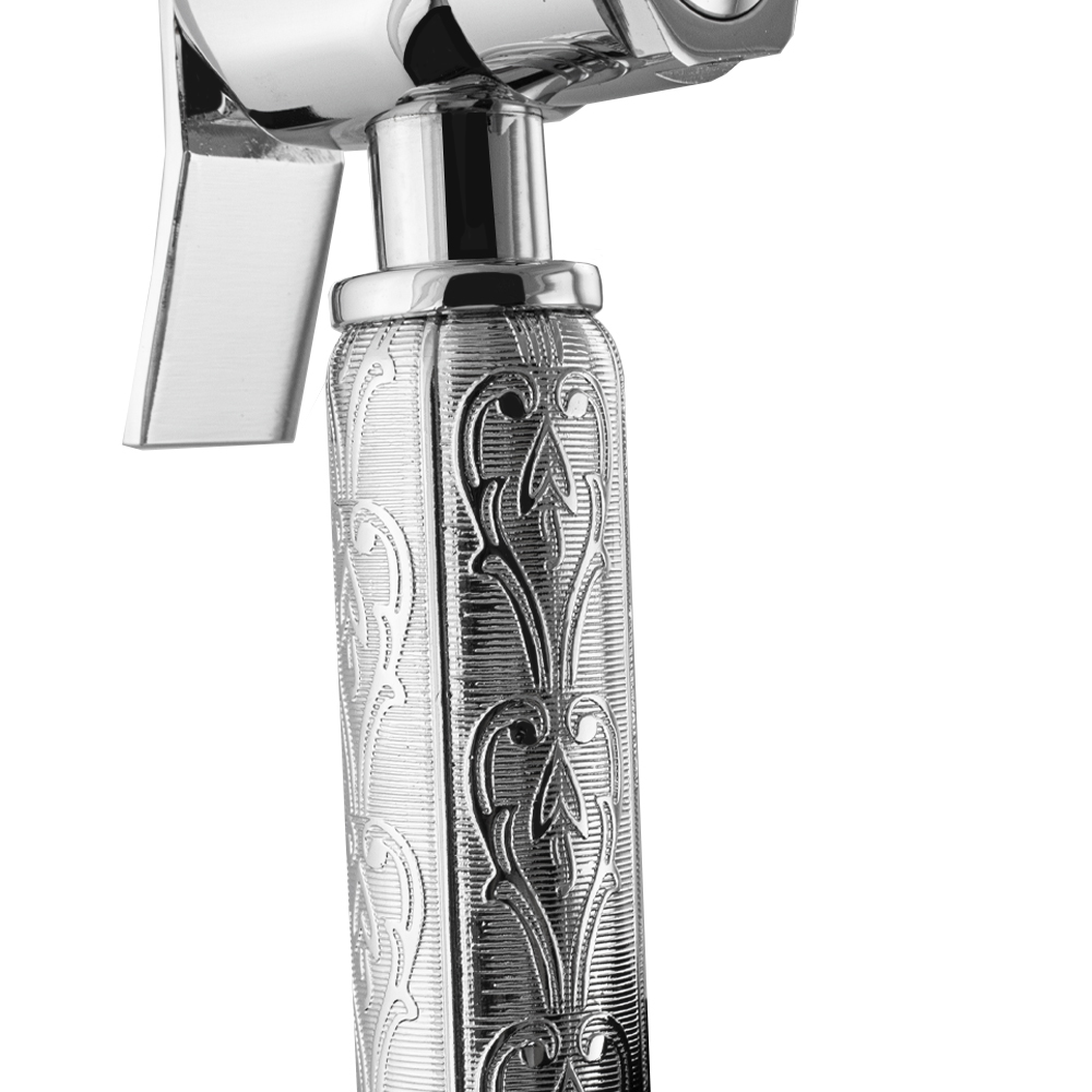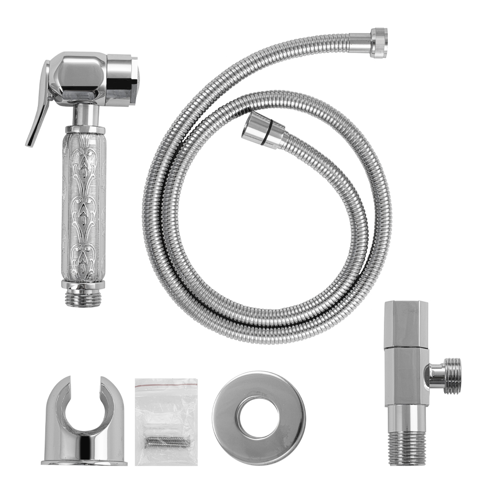 Гигиенический душ, металлический, от торговой марки MAGNUS – удобное и безопасное устройство для проведения гигиенических процедур. Корпус лейки с классическим узором. Лейка изготовлена из прочного материала, обеспечивающего великолепные эксплуатационные свойства изделия. Подача воды осуществляется нажатием клавиши управления. Хромированное покрытие придает модели изящный внешний вид и позволяет легко вписать в современный интерьер ванной и туалетной комнаты. Угловой кран металлокерамика 1/2. Габаритные размеры: высота 160 мм, ширина лейки 70 мм, длина краника 70 мм, диаметр посадочного седла 50 мм, длина шланга 120 мм. Вес - 1,200 кг, объём - 0,00325 м3. В комплекте лейка, шланг, угловой кран м/к 1/2, кронштейн, комплект креплений.