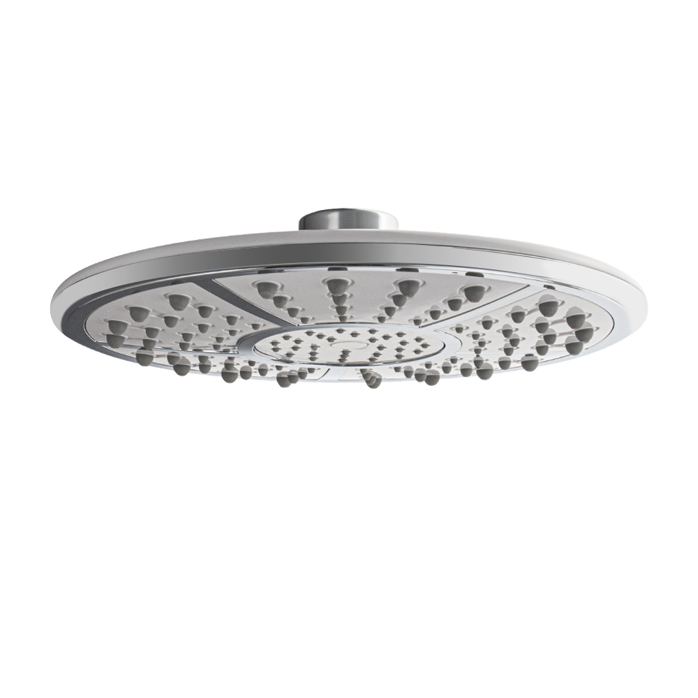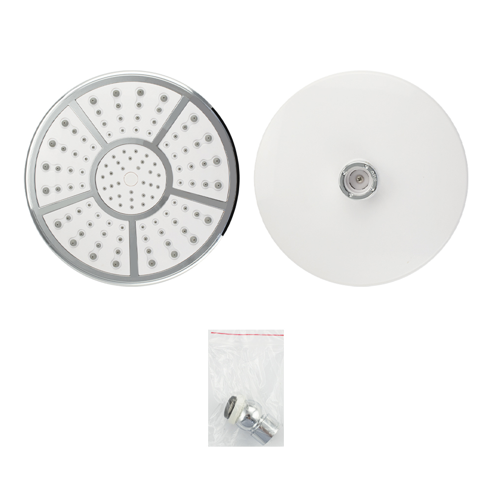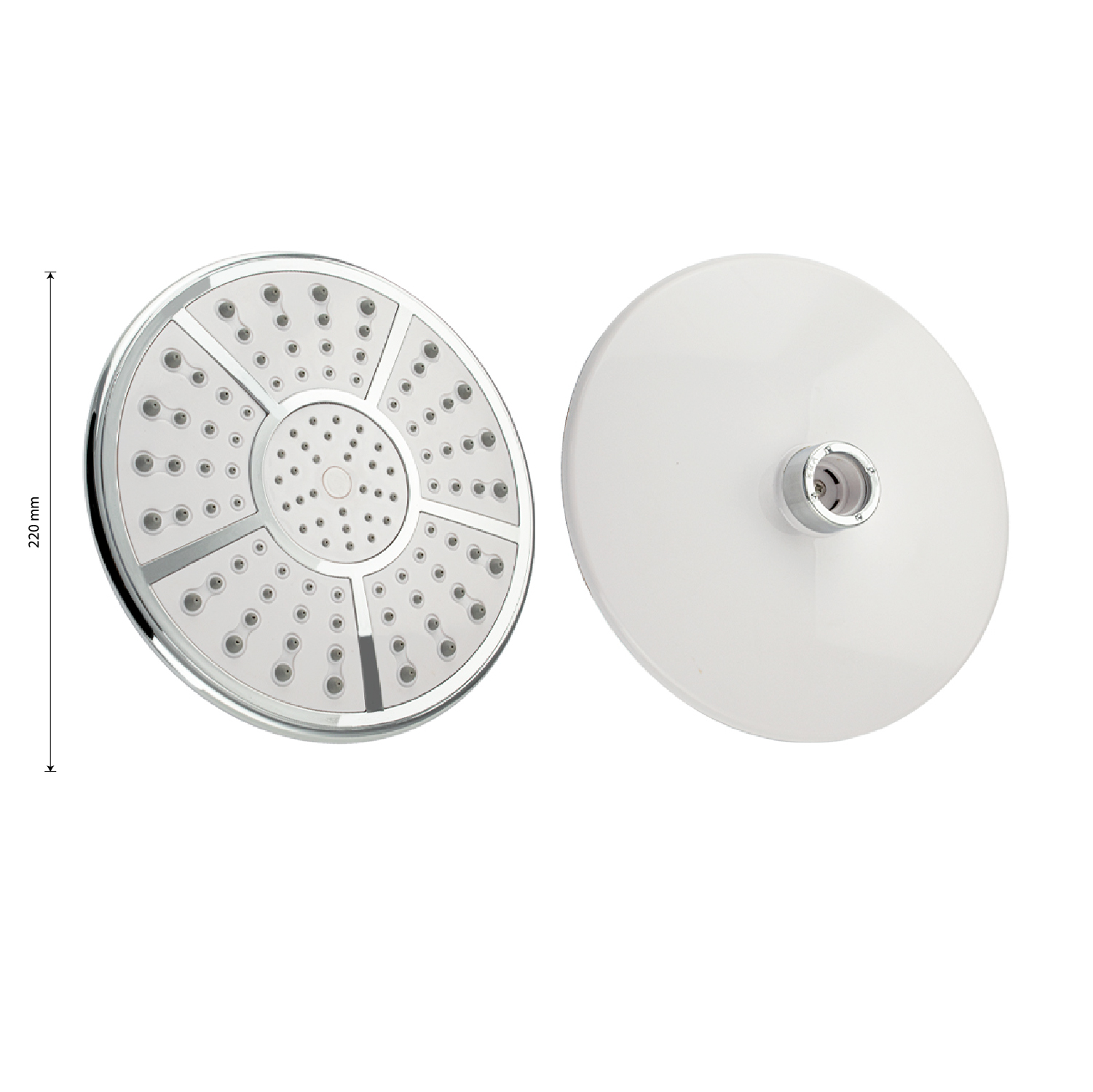 Душевая лейка тропический душ круглая с белой вставкой, отличается современным технологичным дизайном, высокой надежностью, долговечностью. Она изготовлена из влагостойкого пластика АБС и имеет декоративное покрытие цвета «хром», придающее устройству привлекательный вид и предохраняющее от агрессивного воздействия окружающей среды. Корпус отличается небольшим весом, что исключает повреждение напольной плитки или эмали ванны при случайном падении. Лейка крепится к штанге при помощи шарнирного соединителя, внутрь которого встроен сетчатый аэратор для равномерного распределения воды. Также шарнирный соединитель позволяет менять угол наклона душевой насадки от 0° до 22°. Конструкция душа создает эффект тропического ливня, делая водные процедуры приятными и комфортными. Ухаживать за душевой лейкой легко. Глянцевую поверхность достаточно протереть мягкой салфеткой, она в течение долгого времени не потеряет своего блеска. Система помогает мгновенно очистить силиконовые форсунки душевой лейки от известкового налета и