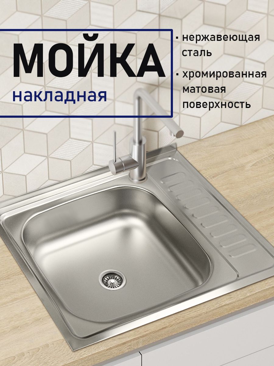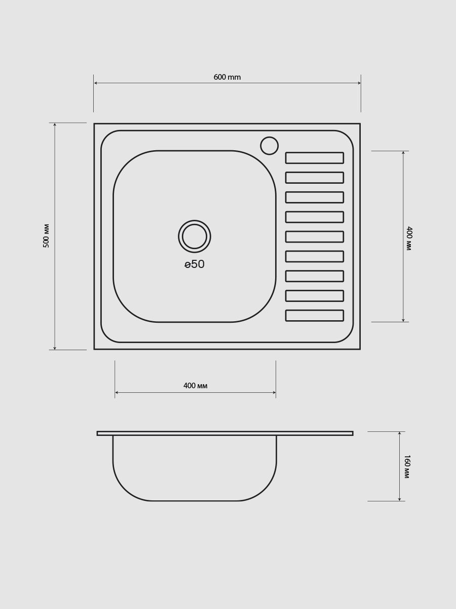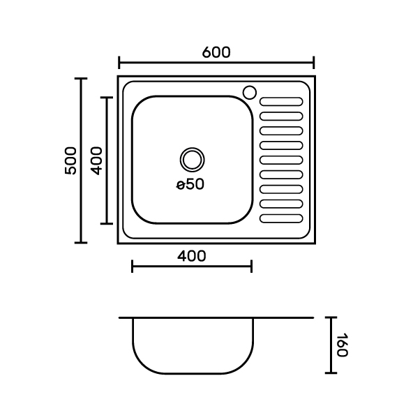 Мойка накладная 50х60 см, левая, толщина 0,4 мм, глубина 160 мм, без сифона
