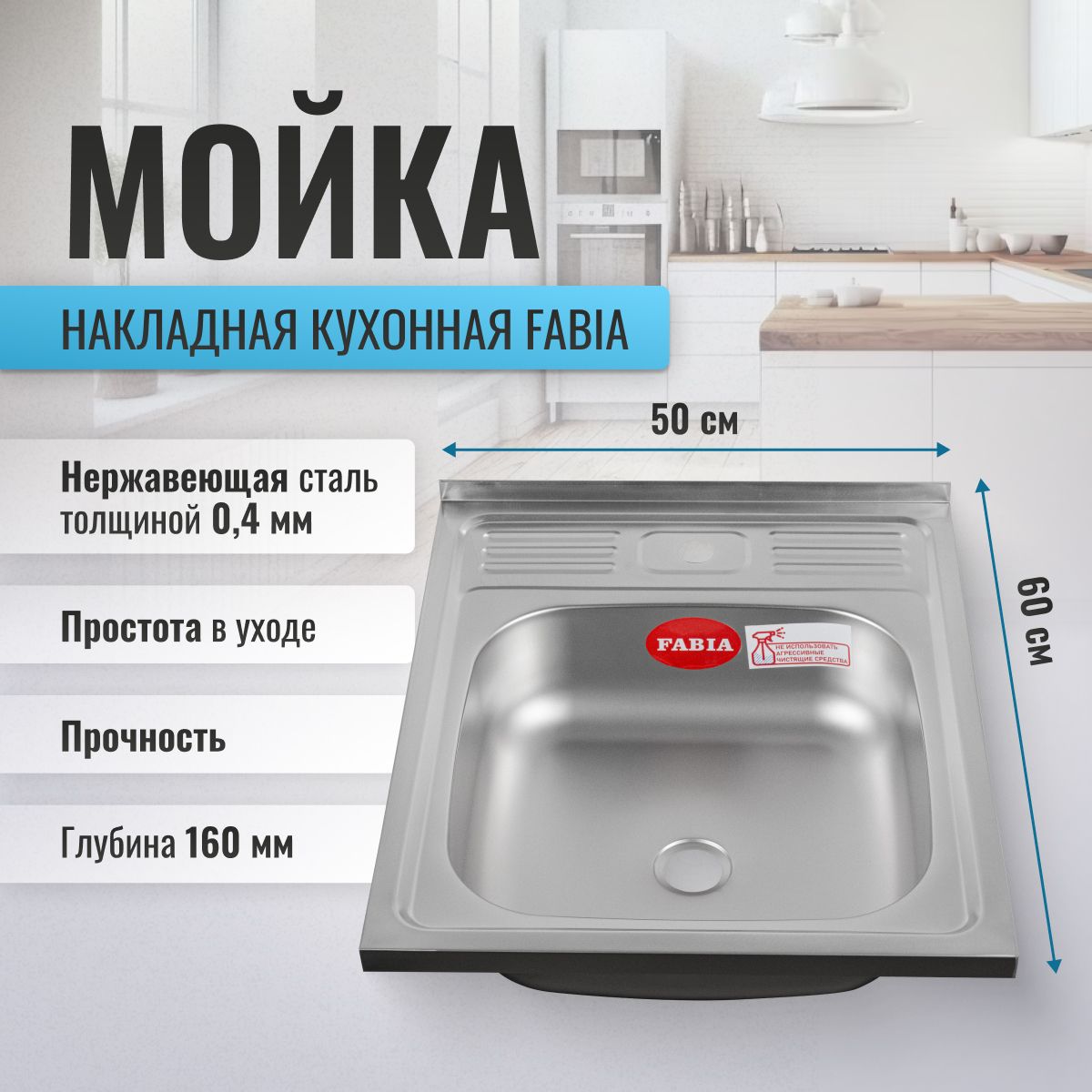 Накладная мойка FABIA из нержавеющей стали отличный вариант для кухни в стиле «эконом», она прослужит многие годы. Классическая форма и матовый цвет «хром» гармонично впишутся в любой интерьер и никогда не выйдут из моды. Оптимальный размер позволяет свободно мыть посуду, без страха её разбить. Мойка устанавливается на тумбочку. Практичная площадка, расположенная по центру, даёт возможность вмонтировать любую понравившуюся модель смесителя. Габаритные размеры: ширина 500 мм, длина 600 мм, глубина 160 мм, толщина стали 0,4 мм. Вес - 1,500 кг, объём - 0,01225 м3.
