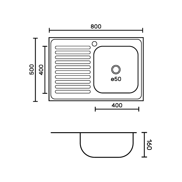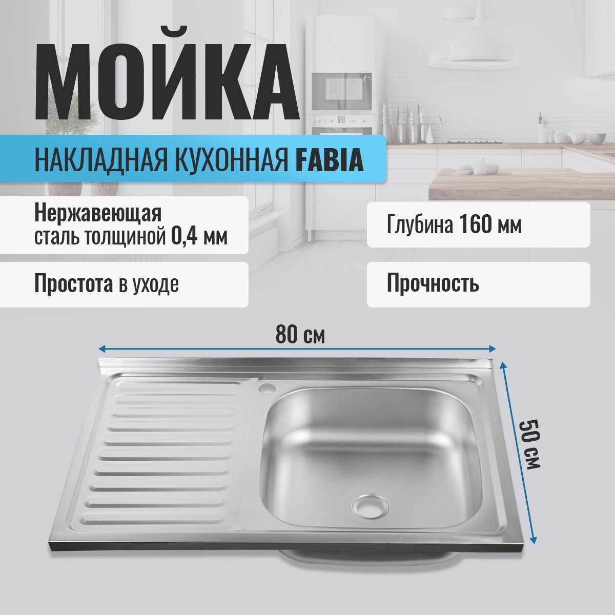 Накладная мойка FABIA из нержавеющей стали отличный вариант для кухни в стиле «эконом», она прослужит многие годы. Классическая форма и матовый цвет «хром» гармонично впишутся в любой интерьер и никогда не выйдут из моды. Оптимальный размер с площадкой для посуды позволяет свободно мыть посуду, без страха её разбить. Мойка устанавливается на тумбочку. Практичная площадка, расположенная по центру, даёт возможность вмонтировать любую понравившуюся модель смесителя. Габаритные размеры: ширина 800 мм, длина 500 мм, глубина 160 мм, толщина стали 0,4 мм. Вес - 1,700 кг, объём - 0,01620 м3.