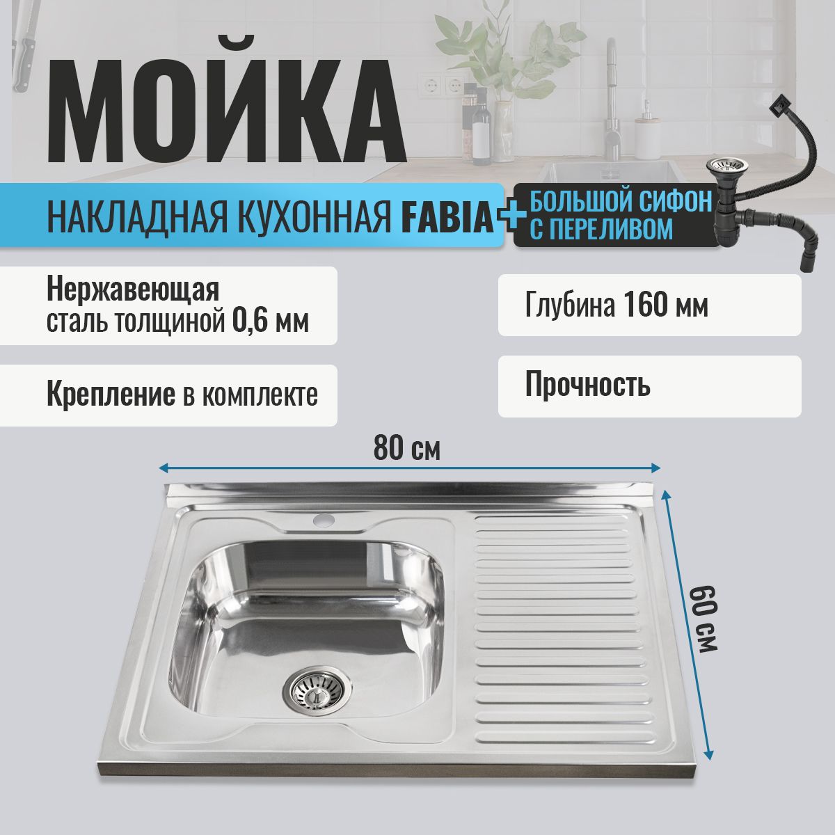Накладная мойка FABIA из нержавеющей стали отличный вариант для кухни, она прослужит многие годы. Классическая форма и хромированный цвет гармонично впишутся в любой интерьер и никогда не выйдут из моды. Оптимальный размер с площадкой для посуды позволяет свободно мыть посуду, без страха её разбить. Мойка устанавливается на тумбочку. Практичная площадка, расположенная по центру, даёт возможность вмонтировать любую понравившуюся модель смесителя. В комплекте сифон с большой горловиной с переливом. Габаритные размеры: ширина 800 мм, длина 600 мм, глубина 160 мм, толщина стали 0,6 мм. Вес - 3,400 кг, объём - 0,02593 м3.