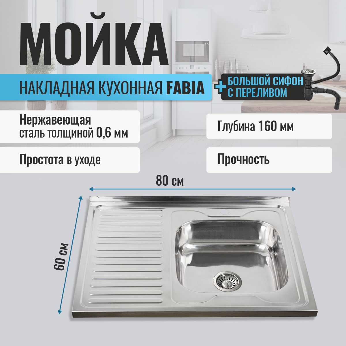 Накладная мойка FABIA из нержавеющей стали отличный вариант для кухни, она прослужит многие годы. Классическая форма и хромированный цвет гармонично впишутся в любой интерьер и никогда не выйдут из моды. Оптимальный размер с площадкой для посуды позволяет свободно мыть посуду, без страха её разбить. Мойка устанавливается на тумбочку. Практичная площадка, расположенная по центру, даёт возможность вмонтировать любую понравившуюся модель смесителя. В комплекте сифон с большой горловиной с переливом. Габаритные размеры: ширина 800 мм, длина 600 мм, глубина 160 мм, толщина стали 0,6 мм. Вес - 3,400 кг, объём - 0,02593 м3.