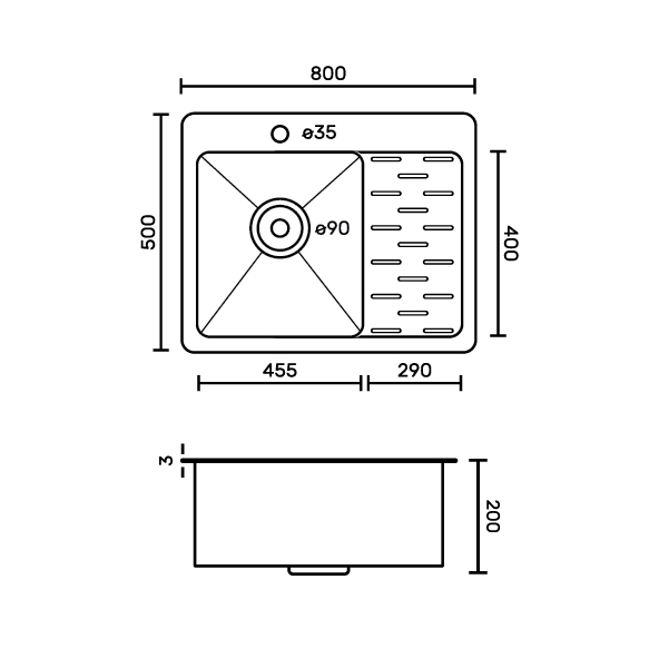 Мойка врезная, левая, матовая, большой сифон с переливом. Сифон с углубленной горловиной, мусоросборником и крышкой. Врезная кухонная мойка произведена из премиальной нержавеющей стали AISI 304, обладает повышенной прочностью. Особенность мойки заключается в конструкции ее дна, имеющего небольшой уклон. Благодаря такой особенности, вода быстрее уходит в слив, не застаивается, что способствует поддержанию гигиеничности в чаше. Скругленные внутренние углы облегчают уход за мойкой, препятствуют скоплению частичек грязи. Тихой в использовании, мойку делает шумоизолирующее покрытие и накладки с обратной стороны мойки. В комплект входит универсальная раздвижная корзина, сифон, мойка, крепёж. Габаритные размеры: ширина 800 мм, длина 500 мм, глубина 200 мм, чаша 455*400 мм, толщина основания 3,0 мм, чаша 0,8 мм. Вес - 10,000 кг, объём - 0,11000 м3.