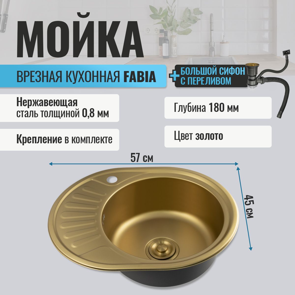 Врезная мойка FABIA из нержавеющей стали отличный вариант для кухни, она прослужит многие годы. Классическая форма и цвет под золото гармонично впишутся в любой интерьер и никогда не выйдут из моды. Оптимальный размер с площадкой для посуды позволяет свободно мыть посуду, без страха её разбить. Мойка врезается в столешницу. Специальное дополнительное антишумовое покрытие, нанесенное на обратную сторону чаш, разработано для снижения шума воды в мойке. Конструкция краев мойки, крепления и специальная уплотнительная прокладка обеспечивает максимально плотное прилегание к столешнице и защищает от протекания. Практичная площадка, расположенная по центру, даёт возможность вмонтировать любую понравившуюся модель смесителя. В комплекте сифон с большой горловиной с переливом, крепёж. Габаритные размеры: ширина 570 мм, длина 450 мм, глубина 180 мм, толщина стали 0,8 мм. Вес - 2,800 кг, объём - 0,01248 м3.