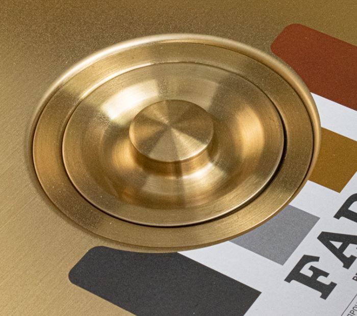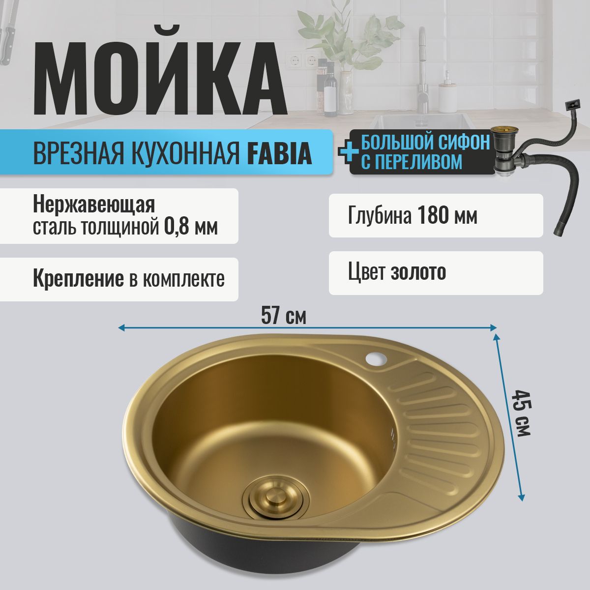 Врезная мойка FABIA из нержавеющей стали отличный вариант для кухни, она прослужит многие годы. Классическая  форма и цвет под золото гармонично впишутся в любой интерьер и никогда не выйдут из моды. Оптимальный размер с площадкой для посуды позволяет свободно мыть посуду, без страха её разбить. Мойка врезается в столешницу. Специальное дополнительное антишумовое покрытие, нанесенное на обратную сторону чаш, разработано для снижения шума воды в мойке. Конструкция краев мойки, крепления и специальная уплотнительная прокладка обеспечивает максимально плотное прилегание к столешнице и защищает от протекания. Практичная площадка, расположенная по центру, даёт возможность вмонтировать любую понравившуюся модель смесителя. В комплекте сифон с большой горловиной с переливом, крепёж. Габаритные размеры: ширина 570 мм, длина 450 мм, глубина 180 мм, толщина стали 0,8 мм. Вес - 2,800 кг, объём - 0,01248 м3.