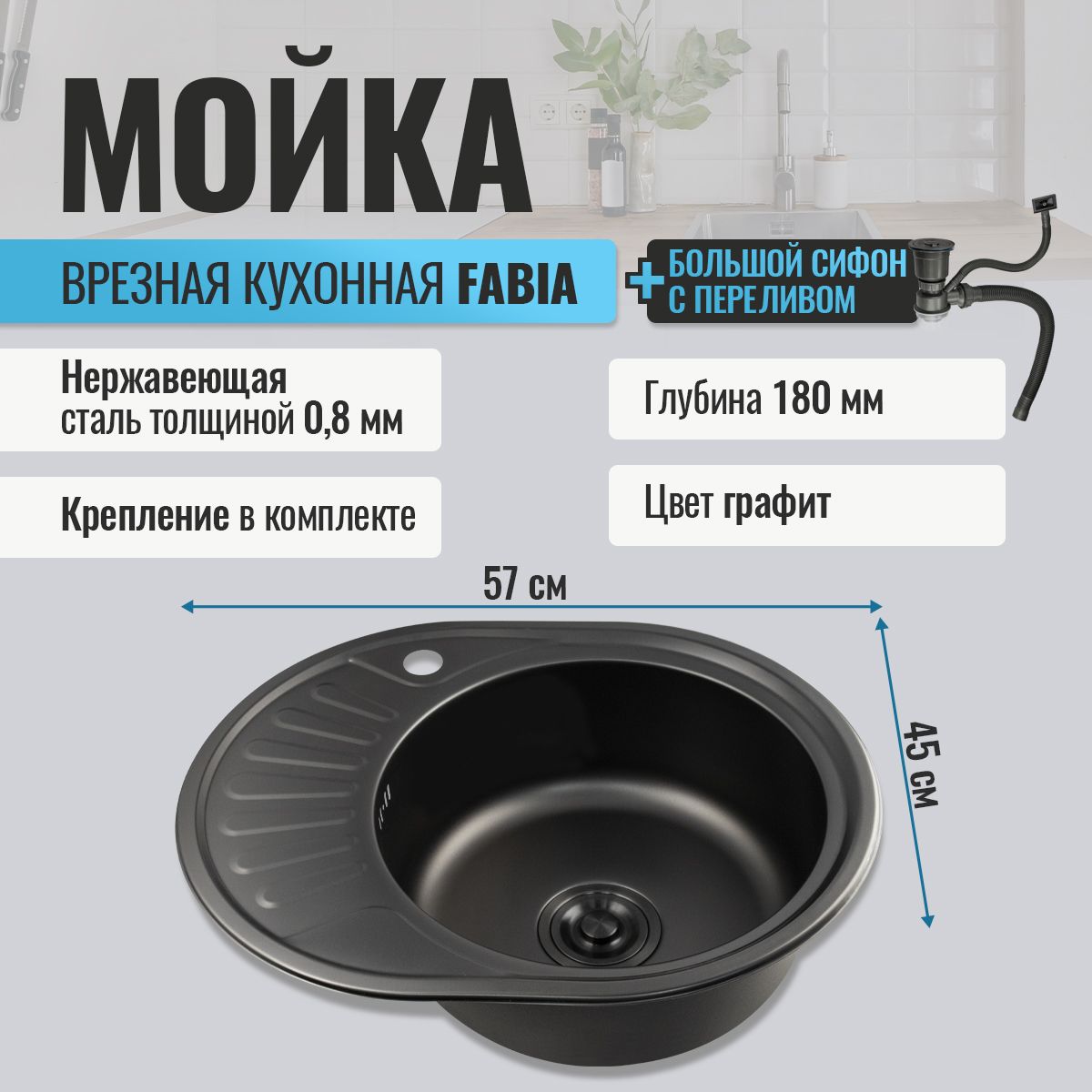 Врезная мойка FABIA из нержавеющей стали, отличный вариант для кухни, она прослужит многие годы. Классическая форма и цвет под графит гармонично впишутся в любой интерьер и никогда не выйдут из моды. Оптимальный размер с площадкой для посуды позволяет свободно мыть посуду, без страха её разбить. Мойка врезается в столешницу. Специальное дополнительное антишумовое покрытие, нанесенное на обратную сторону чаш, разработано для снижения шума воды в мойке. Конструкция краев мойки, крепления и специальная уплотнительная прокладка обеспечивает максимально плотное прилегание к столешнице и защищает от протекания. Практичная площадка, расположенная по центру, даёт возможность вмонтировать любую понравившуюся модель смесителя. В комплекте сифон с большой горловиной с переливом, крепёж. Габаритные размеры: ширина 570 мм, длина 450 мм, глубина 180 мм, толщина стали 0,8 мм. Вес - 2,800 кг, объём - 0,01248 м3.