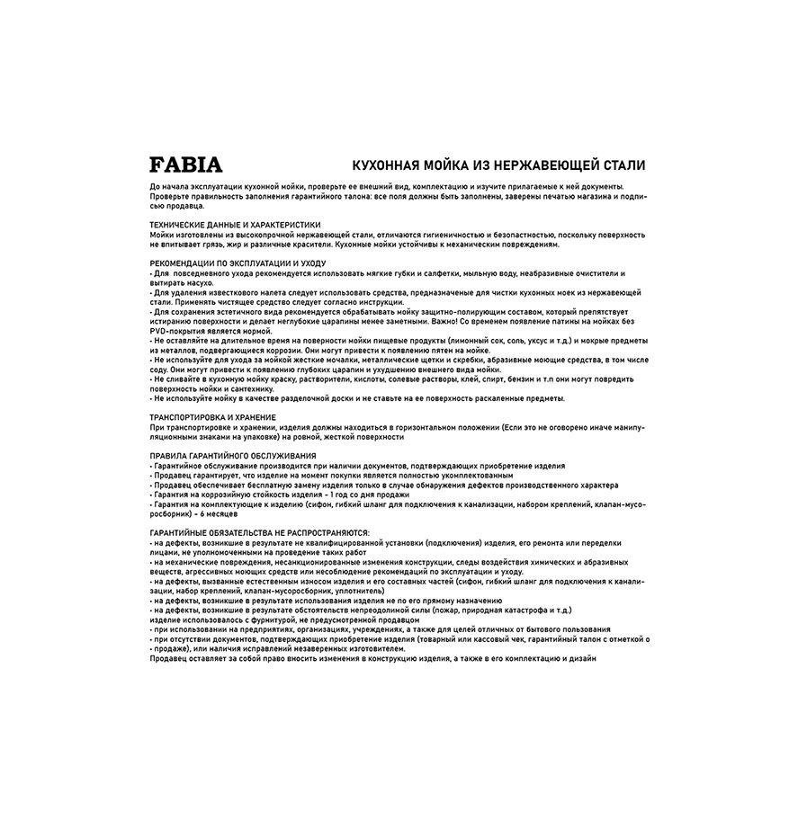 Врезная мойка FABIA из нержавеющей стали отличный вариант для кухни, она прослужит многие годы. Классическая форма и хромированный цвет гармонично впишутся в любой интерьер и никогда не выйдут из моды. Оптимальный размер позволяет свободно мыть посуду, без страха её разбить. Мойка врезается в столешницу. Специальное дополнительное антишумовое покрытие, нанесенное на обратную сторону чаш, разработано для снижения шума воды в мойке. Конструкция краев мойки, крепления и специальная уплотнительная прокладка обеспечивает максимально плотное прилегание к столешнице и защищает от протекания. Практичная площадка, расположенная в углу, даёт возможность вмонтировать любую понравившуюся модель смесителя. В комплекте сифон с большой горловиной с переливом, крепёж. Габаритные размеры: ширина 500 мм, длина 440 мм, глубина 180 мм, толщина стали 0,8 мм. Вес - 2,300 кг, объём - 0,04784 м3.