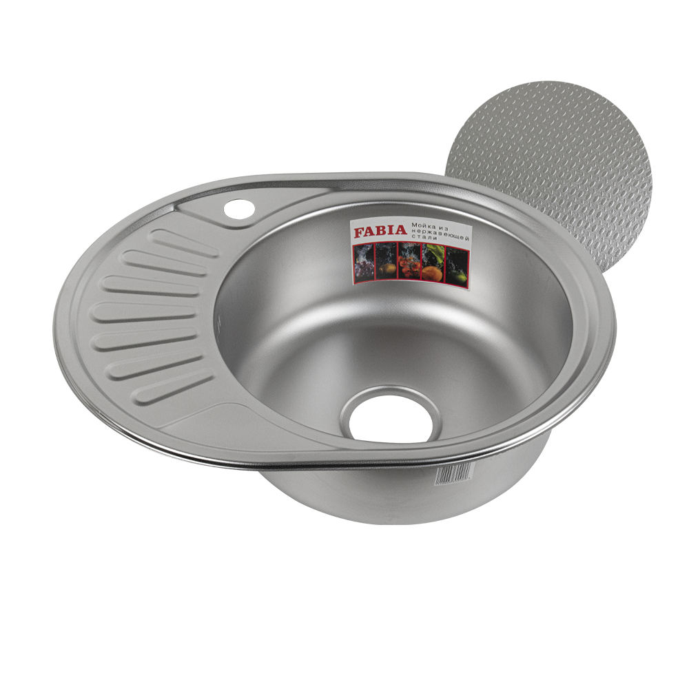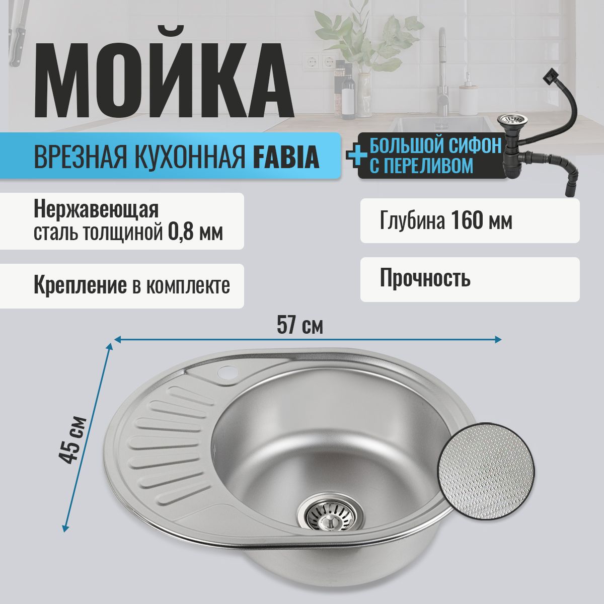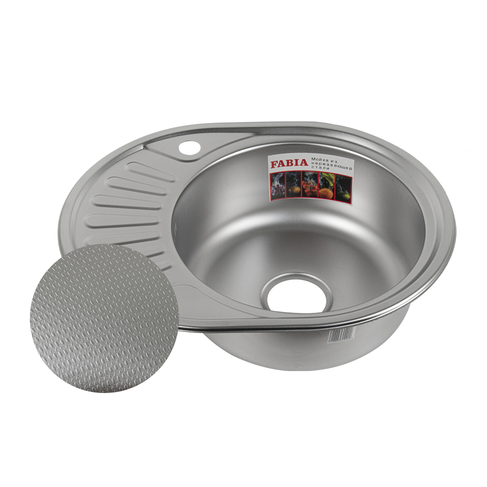 Врезная мойка FABIA из нержавеющей стали, декорированная, отличный вариант для кухни, она прослужит многие годы. Классическая форма и матовый цвет гармонично впишутся в любой интерьер и никогда не выйдут из моды. Оптимальный размер с площадкой для посуды позволяет свободно мыть посуду, без страха её разбить. Мойка врезается в столешницу. Специальное дополнительное антишумовое покрытие, нанесенное на обратную сторону чаш, разработано для снижения шума воды в мойке. Конструкция краев мойки, крепления и специальная уплотнительная прокладка обеспечивает максимально плотное прилегание к столешнице и защищает от протекания. Практичная площадка, расположенная по центру, даёт возможность вмонтировать любую понравившуюся модель смесителя. В комплекте сифон с большой горловиной с переливом, крепёж. Габаритные размеры: ширина 570 мм, длина 450 мм, глубина 180 мм, толщина стали 0,8 мм. Вес - 2,500 кг, объём - 0,01248 м3.