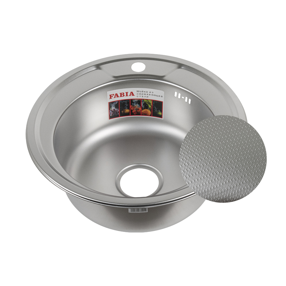 Врезная мойка FABIA из нержавеющей стали, декорированная, отличный вариант для кухни, она прослужит многие годы. Классическая форма и матовый цвет гармонично впишутся в любой интерьер и никогда не выйдут из моды. Оптимальный размер позволяет свободно мыть посуду, без страха её разбить. Мойка врезается в столешницу. Специальное дополнительное антишумовое покрытие, нанесенное на обратную сторону чаш, разработано для снижения шума воды в мойке. Конструкция краев мойки, крепления и специальная уплотнительная прокладка обеспечивает максимально плотное прилегание к столешнице и защищает от протекания. Практичная площадка, расположенная по центру, даёт возможность вмонтировать любую понравившуюся модель смесителя. В комплекте сифон с большой горловиной с переливом, крепёж. Габаритные размеры: d = 490 мм, глубина 180 мм, толщина стали 0,8 мм. Вес - 2,400 кг, объём - 0,01301 м3.