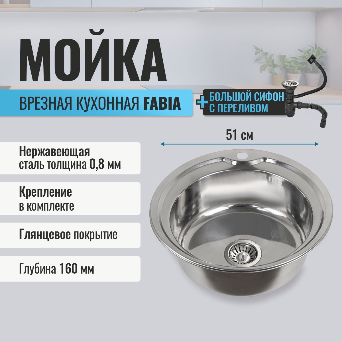 Врезная мойка FABIA из нержавеющей стали, отличный вариант для кухни, она прослужит многие годы. Классическая форма и хромированный цвет гармонично впишутся в любой интерьер и никогда не выйдут из моды. Оптимальный размер, позволяет свободно помыть посуду, без страха её разбить. Мойка врезается в столешницу. Специальное дополнительное антишумовое покрытие, нанесенное на обратную сторону чаш, разработано для снижения шума воды в мойке. Конструкция краев мойки, крепления и специальная уплотнительная прокладка обеспечивает максимально плотное прилегание к столешнице и защищает от протекания. Практичная площадка, расположенная по центру, даёт возможность вмонтировать любую понравившуюся модель смесителя. В комплекте сифон с большой горловиной с переливом, крепёж. Габаритные размеры: d = 510 мм, глубина 180 мм, толщина стали 0,8 мм. Вес - 2,500 кг, объём - 0,01405 м3.