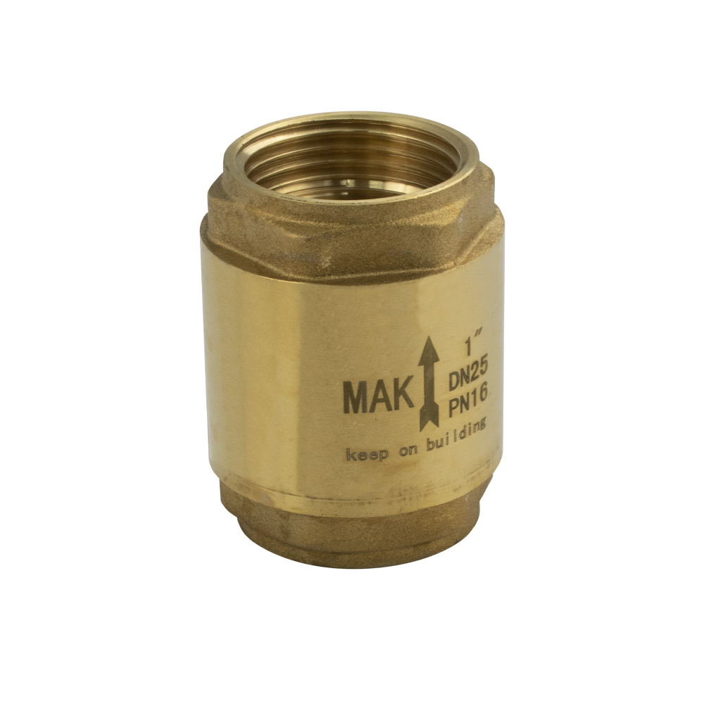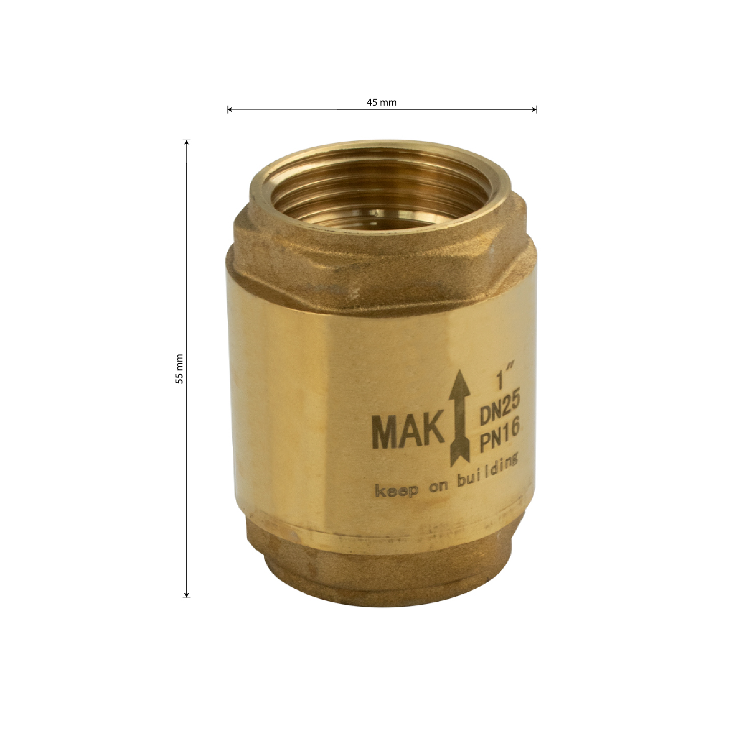 Обратный клапан 1", с латунным штоком предназначен для защиты трубопровода от обратного потока рабочей среды. Применяется в трубопроводах систем питьевого, хозяйственно - бытового и промышленного назначения, трубопроводах систем холодного, горячего водоснабжения, отопления, сжатого воздуха и жидких углеводородов. Данный обратный клапан монтируется в любом положении, а направление потока рабочей среды указано стрелкой на корпусе. Корпус и золотниковый механизм (шток, верхняя и нижняя тарелки) обратного клапана изготовлены из высококачественной горячепрессованной латуни. Габаритные размеры: высота 55 мм, диаметр 45 мм. Вес - 0,300 кг, объём - 0,00015 м3.