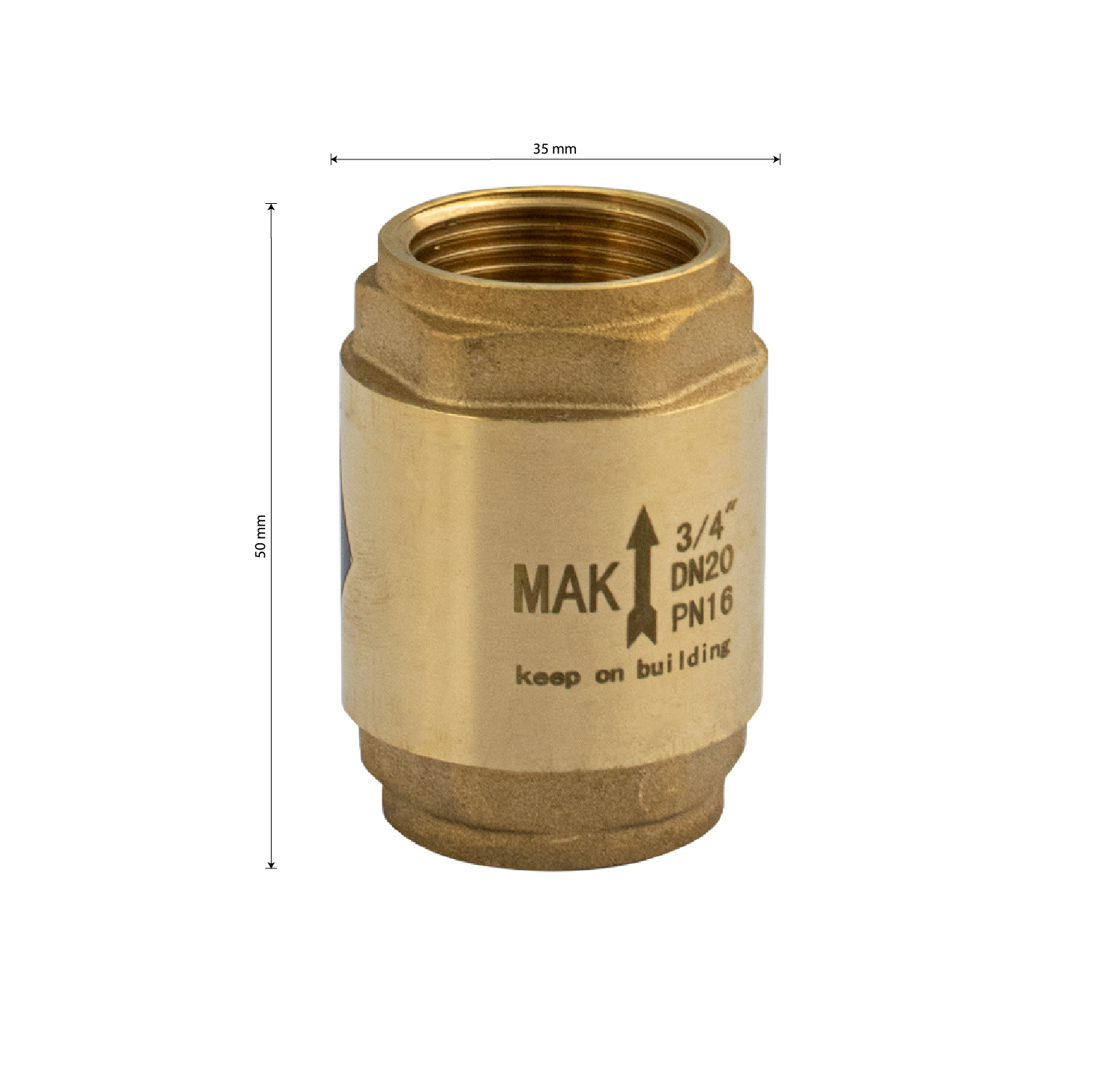 Обратный клапан 3/4" с латунным штоком предназначен для защиты трубопровода от обратного потока рабочей среды. Применяется в трубопроводах систем питьевого, хозяйственно - бытового и промышленного назначения, трубопроводах систем холодного, горячего водоснабжения, отопления, сжатого воздуха и жидких углеводородов. Данный обратный клапан монтируется в любом положении, а направление потока рабочей среды указано стрелкой на корпусе. Корпус и золотниковый механизм (шток, верхняя и нижняя тарелки) обратного клапана изготовлены из высококачественной горячепрессованной латуни. Габаритные размеры: высота 50 мм, диаметр 35 мм. Вес - 0,175 кг, объём - 0,00008 м3.