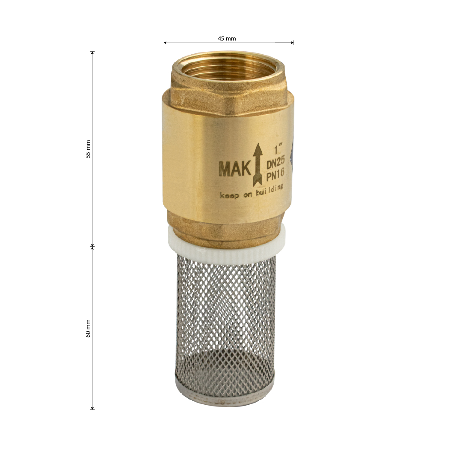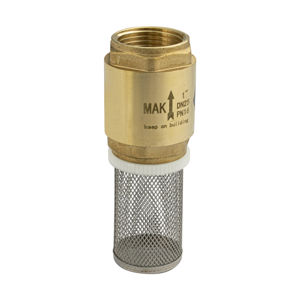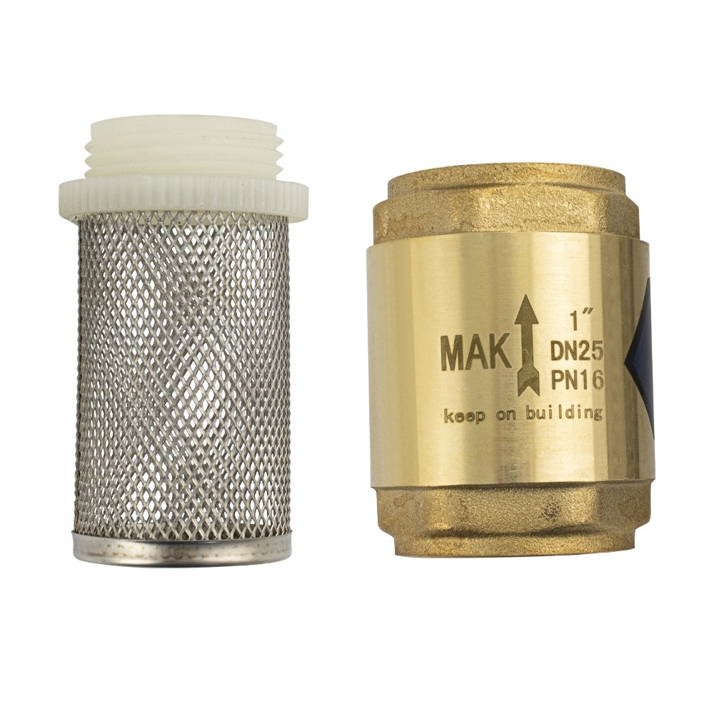 Обратный клапан 1" с сеткой, с латунным штоком предназначен для защиты трубопровода от обратного потока рабочей среды. Применяется в трубопроводах систем питьевого, хозяйственно - бытового и промышленного назначения, трубопроводах систем холодного, горячего водоснабжения, отопления, сжатого воздуха и жидких углеводородов. Данный обратный клапан монтируется в любом положении, а направление потока рабочей среды указано стрелкой на корпусе. Корпус и золотниковый механизм (шток, верхняя и нижняя тарелки) обратного клапана изготовлены из высококачественной горячепрессованной латуни. Габаритные размеры: высота клапана 55 мм, высота сетки 60 мм, диаметр 45 мм. Вес - 0,400 кг, объём - 0,00018 м3.