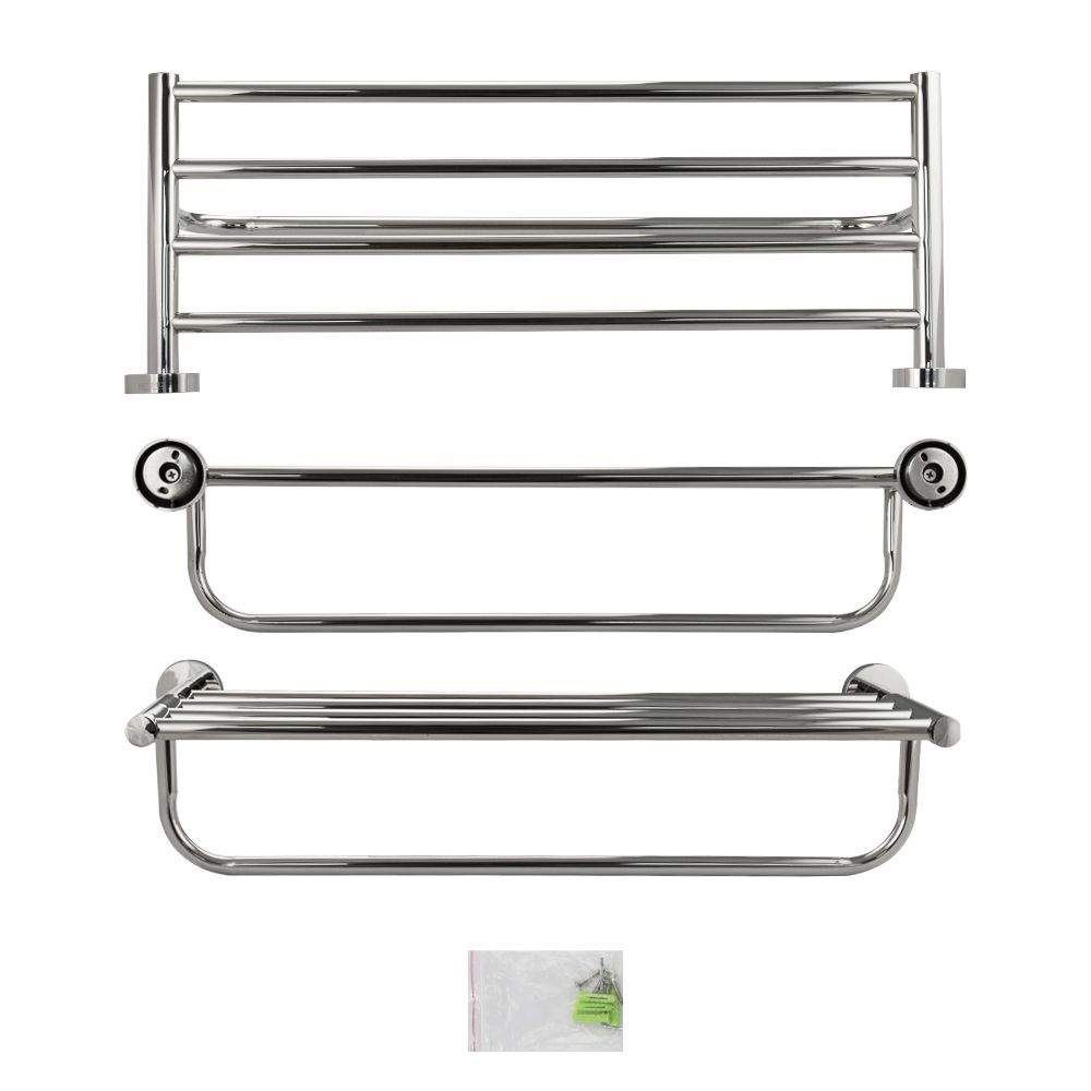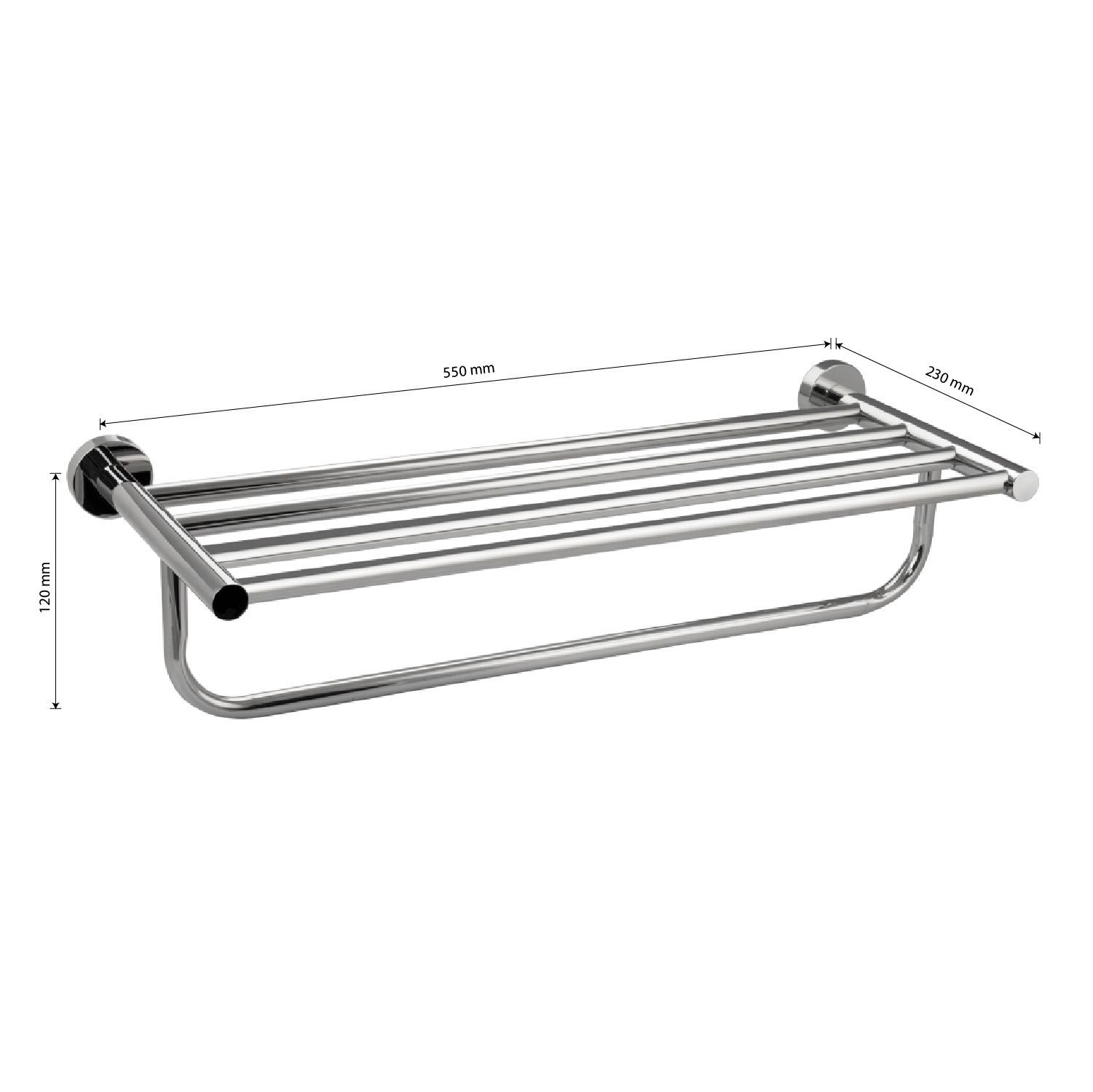 Полка для полотенца с опорой, большая, для ванной, привлекает своим современным дизайном, многофункциональностью и надежностью конструкции. Кухня, ванная, прихожая, кладовка или гардеробная - эта полка идеально подойдет везде. Металлическая полка оснащена дополнительной перекладиной. Безупречно отшлифованная нержавеющая сталь делает её устойчивой к влаге и исключает появление ржавчины. Полка для ванной функциональное и практичное решение для любого интерьера. Материал изготовления — нержавеющая сталь марки 304. Хромированное покрытие очень стойко переносит истирания и обеспечивает зеркальный блеск изделия. Идеально подойдет не только для ванной, но и для кухни. Изделие крепится к стене с помощью дюбелей и саморезов (входят в комплект). Габаритные размеры: ширина 550 мм, глубина 230 мм, высота 120 мм. Вес - 1,350 кг, объём - 0,03000 м3