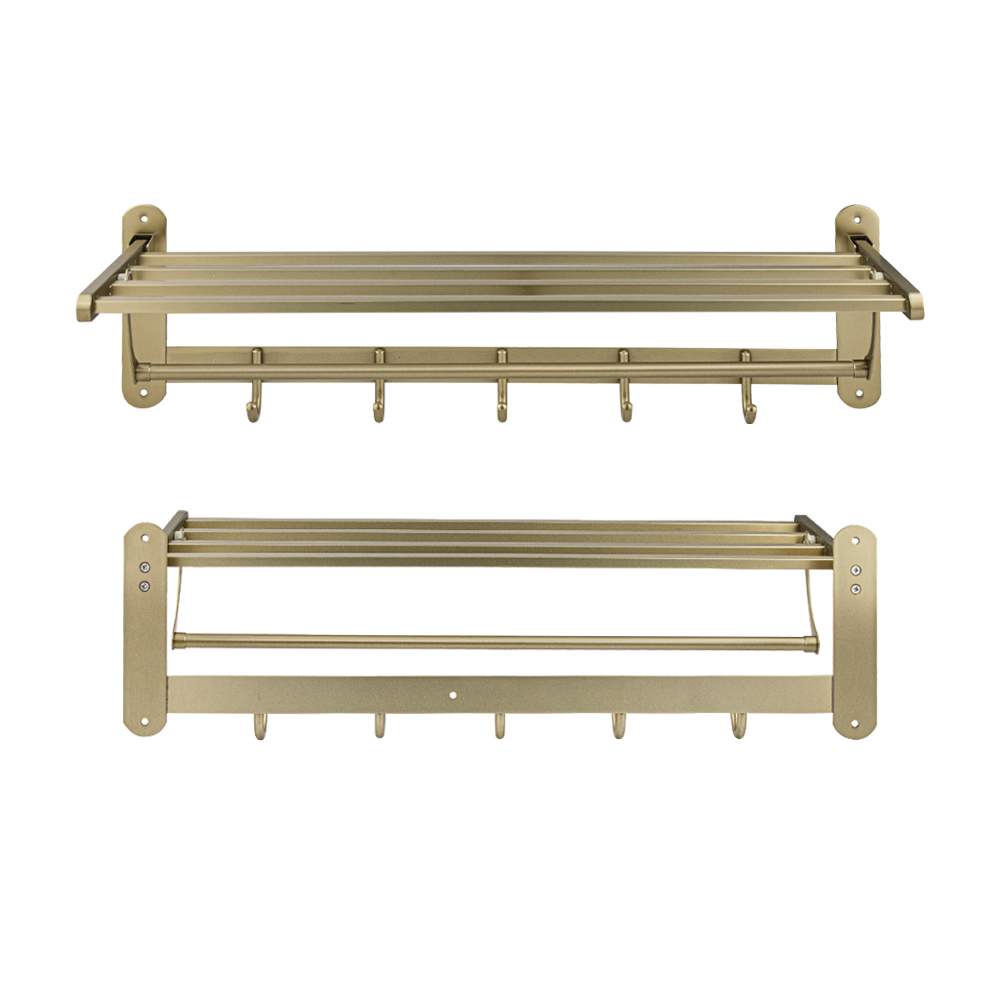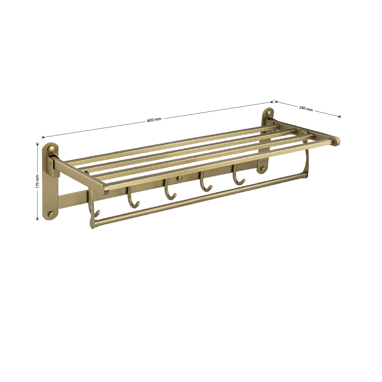 Полка для полотенца с опорой, большая, для ванной, привлекает своим современным дизайном, многофункциональностью и надежностью конструкции. Откидывающаяся на 90° верхняя часть полки в позволяет размещать её даже в самых тесных помещениях. Кухня, ванная, прихожая или гардеробная - эта полка идеально подойдет везде. Металлическая полка оснащена дополнительной перекладиной и крючками. Нержавеющая сталь делает её устойчивой к влаге и исключает появление ржавчины. Полка для ванной функциональное и практичное решение для любого интерьера. Материал изготовления — нержавеющая сталь. Матовое золотое покрытие очень стойко переносит истирания и обеспечивает безупречный вид изделия. Идеально подойдет не только для ванной, но и для кухни. Изделие крепится к стене с помощью дюбелей и саморезов (входят в комплект). Габаритные размеры: ширина 600 мм, высота 170 мм, глубина 240 мм. Вес - 1.73 кг, объём - 0.01623 м3.