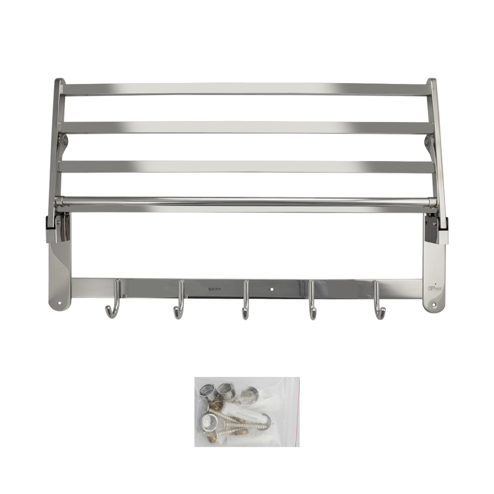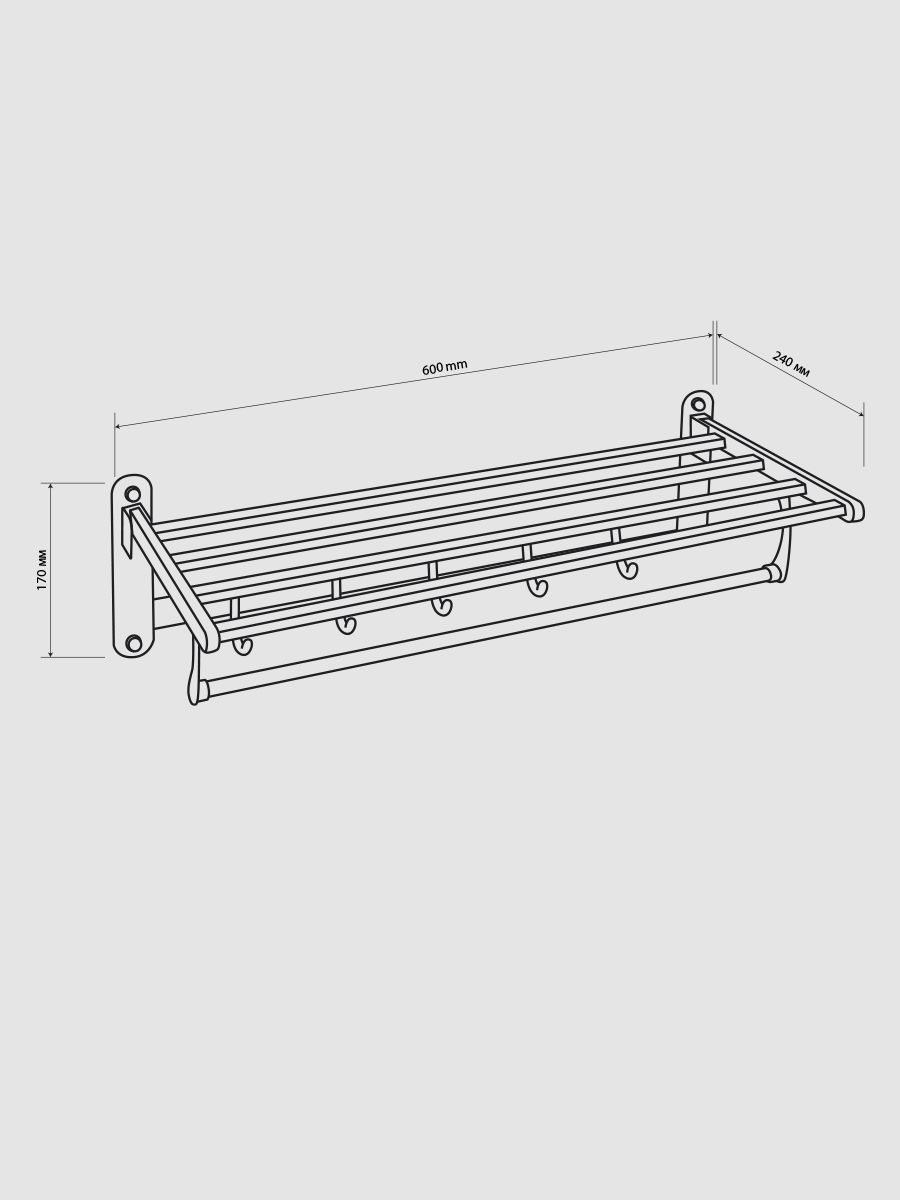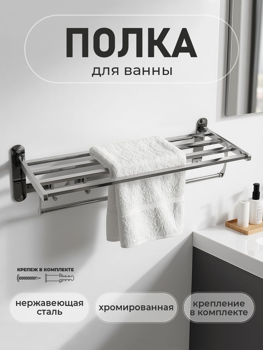Полка для полотенца с опорой, большая, для ванной, привлекает своим современным дизайном, многофункциональностью и надежностью конструкции. Откидывающаяся на 90° верхняя часть полки в позволяет размещать её даже в самых тесных помещениях. Кухня, ванная, прихожая или гардеробная - эта полка идеально подойдет везде. Металлическая полка оснащена дополнительной перекладиной и крючками. Нержавеющая сталь делает её устойчивой к влаге и исключает появление ржавчины. Полка для ванной функциональное и практичное решение для любого интерьера. Материал изготовления — нержавеющая сталь 304. Хромированное покрытие очень стойко переносит истирания и обеспечивает безупречный вид изделия. Идеально подойдет не только для ванной, но и для кухни. Изделие крепится к стене с помощью дюбелей и саморезов (входят в комплект). Габаритные размеры: ширина 600 мм, высота 170 мм, глубина 240 мм. Вес - 1.65 кг, объём - 0.0175 м3.