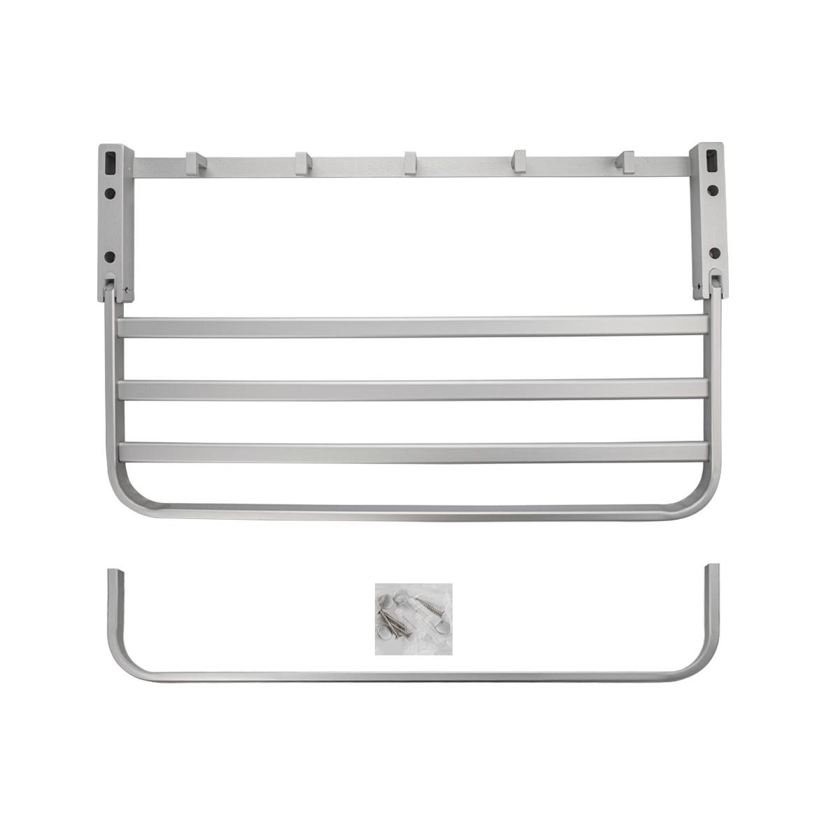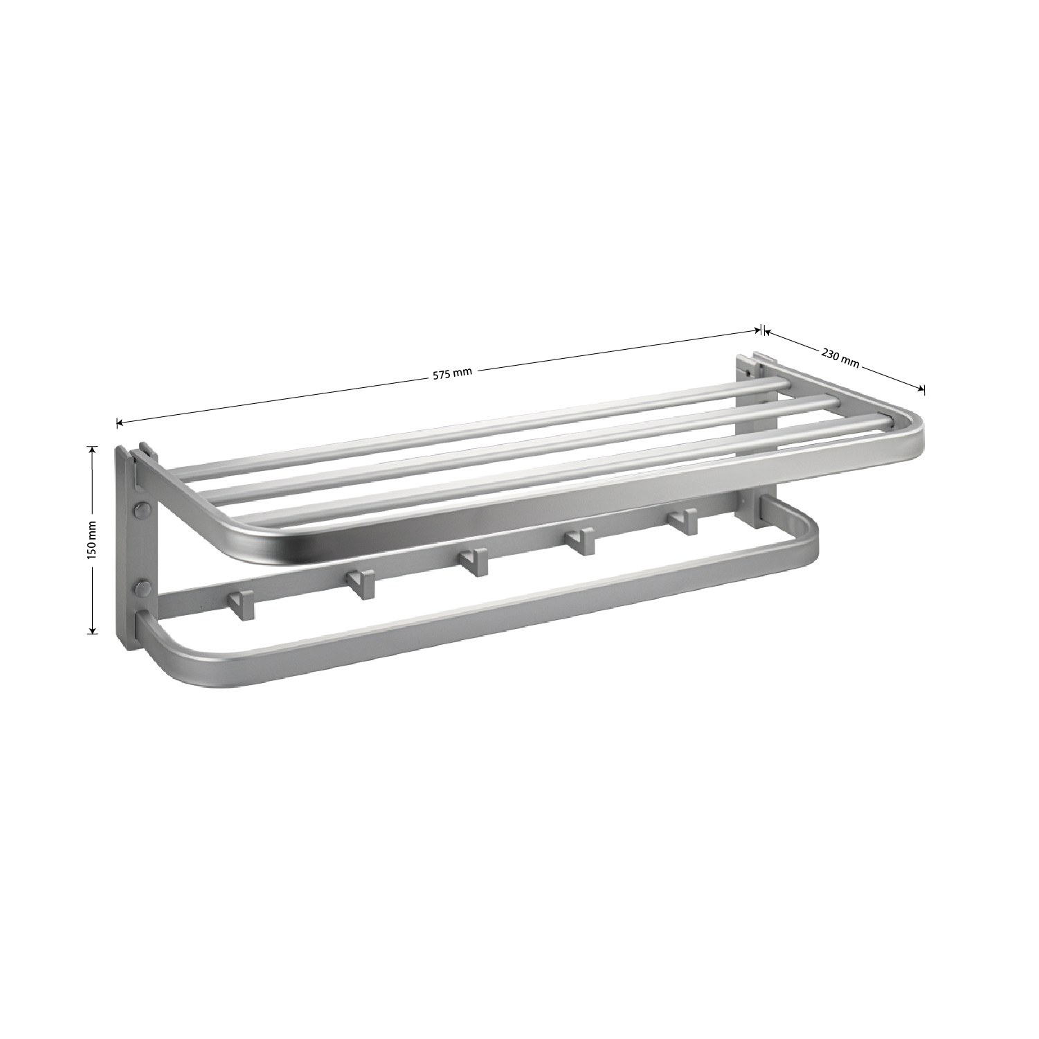 Полка для полотенца с опорой, большая, для ванной, привлекает своим современным дизайном, многофункциональностью и надежностью конструкции. Кухня, ванная, прихожая, кладовка или гардеробная - эта полка идеально подойдет везде. Металлическая полка оснащена дополнительной перекладиной. Безупречно отшлифованный алюминий с матовым покрытием делает её устойчивой к влаге и исключает появление ржавчины. Полка для ванной функциональное и практичное решение для любого интерьера. Материал изготовления — алюминий. Матовое покрытие очень стойко переносит истирания и обеспечивает идеальный вид изделия изделия. Идеально подойдет не только для ванной, но и для кухни. Изделие крепится к стене с помощью дюбелей и саморезов (входят в комплект). Габаритные размеры: длина 575 мм, глубина 230 мм, высота 150 мм. Вес - 1.4 кг, объём - 0,013 м3.