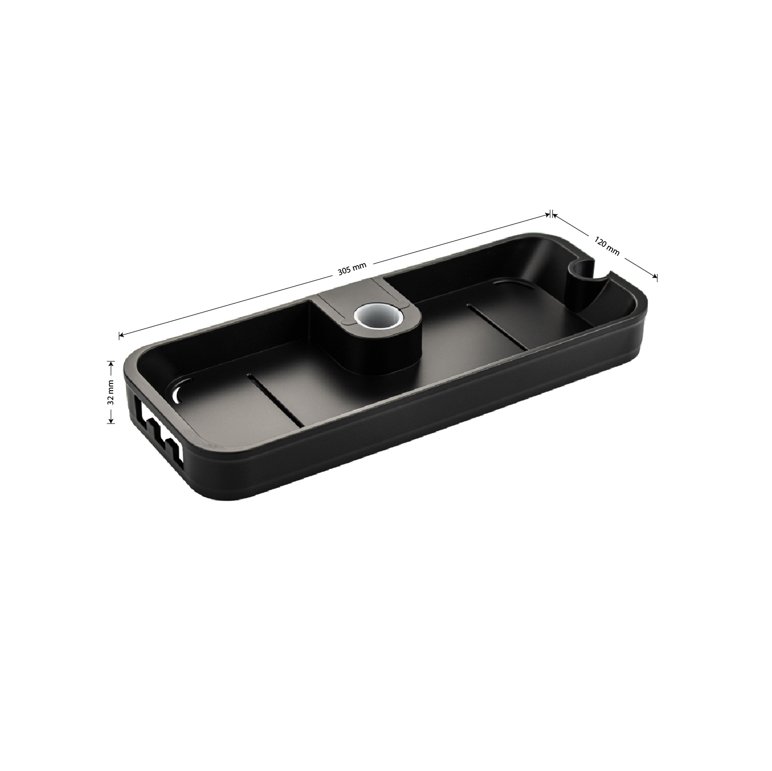 Полка для душевых стоек и стоек тропический душ, глубокая с держателем для лейки, черного цвета, произведена из долговечного и прочного ABS-пластика, благодаря чему она прослужит дольше во влажном помещении ванной комнаты, не желтеет, не ржавеет и не деформируется, не впитывает запахи. Габаритные размеры: длина 305 мм, ширина 120 мм, высота 32 мм, диаметр втулки 20 мм. Вес - 0,33 кг, объём - 0,0026 м3.
