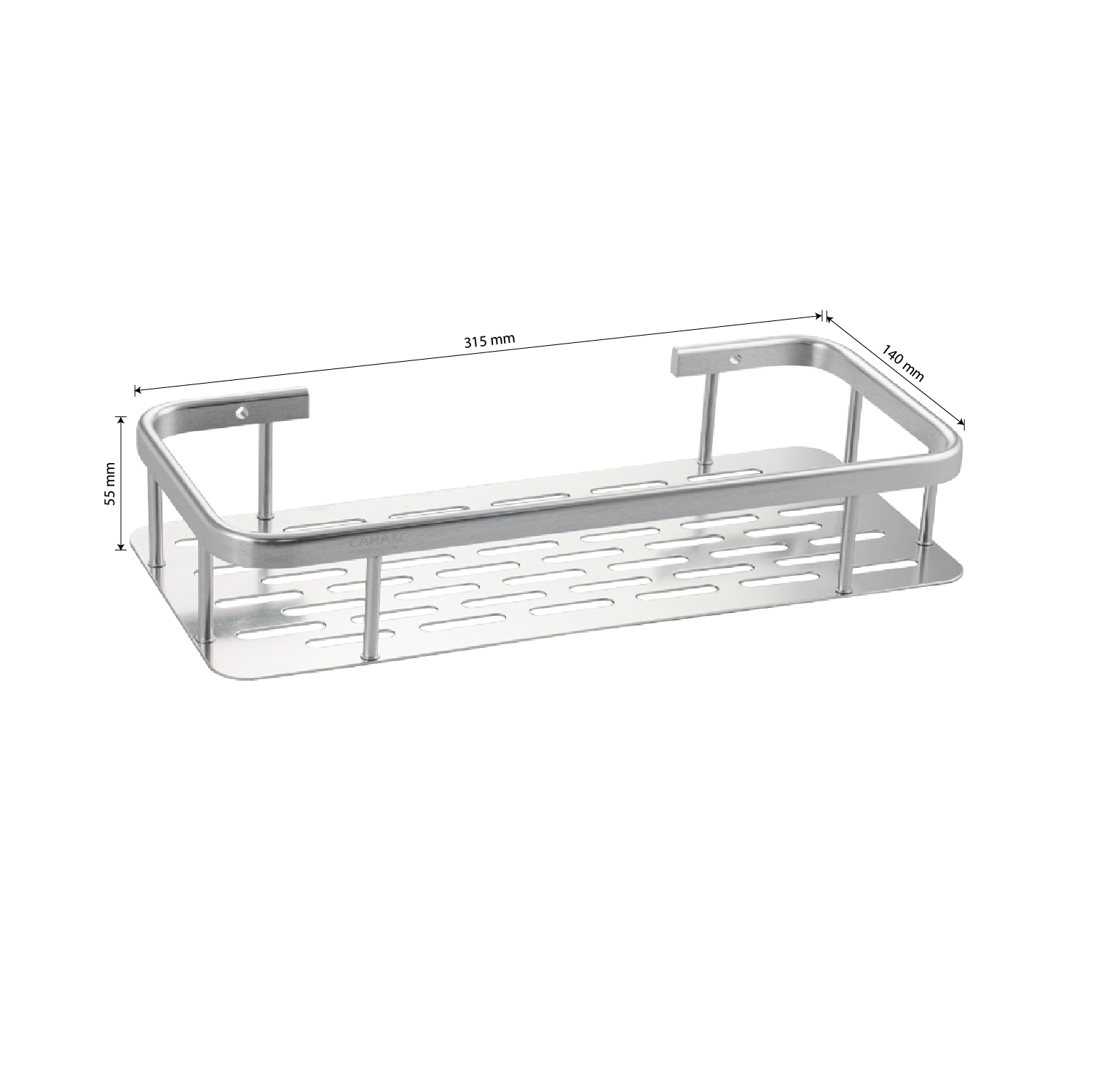 Полочка для принадлежностей прямоугольная, с литым дном, однаэтажная, обладает высокими эксплуатационными характеристиками и подходит для использования дома, в общественных местах: отелях, ресторанах и пр. Изготовлена из прочного алюминия с матовым покрытием, которое придает безупречный вид и долговечность. Аксессуар не занимает много места, надежно фиксируется к стене при помощи набора креплений (входят в комплект) и служит удобным местом для хранения бытовых и косметических средств. Габаритные размеры: длина 315 мм, высота 55 мм, глубина 140 мм. Вес - 0,300 кг, объём - 0,00304 м3.