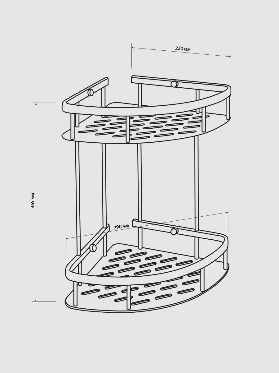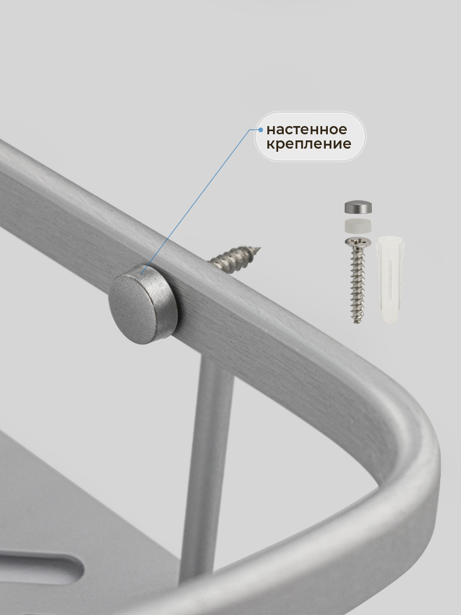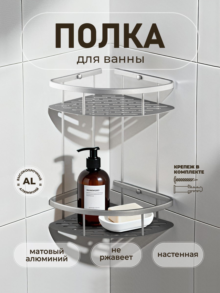 Полочка для принадлежностей угловая, двойная, с литым дном, обладает высокими эксплуатационными характеристиками и подходит для использования дома, в общественных местах: отелях, ресторанах и пр. Изготовлена из высокопрочного алюминия с матовым покрытием, которое придает безупречный вид и долговечность. Аксессуар не занимает много места, надежно фиксируется к стене при помощи набора креплений и служит удобным местом для хранения бытовых и косметических средств. Габаритные размеры: высота 365 мм, ширина 290 мм, глубина 220 мм, высота полки 55 мм, расстояние между полками 255 мм. Вес - 0,600 кг, объём - 0,01594 м3.