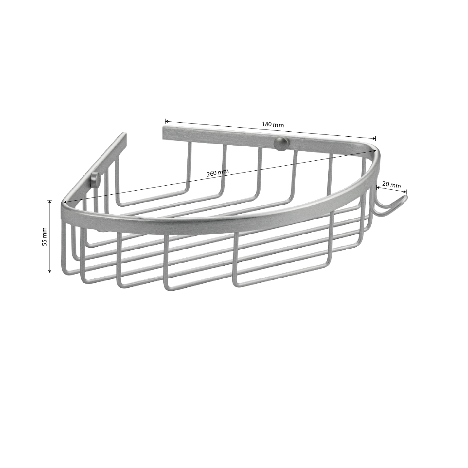 Полочка для принадлежностей угловая, решётка, однаэтажная, с крючком, обладает высокими эксплуатационными характеристиками и подходит для использования дома, в общественных местах: отелях, ресторанах и пр. Изготовлена из прочного алюминия с матовым покрытием, которое придает безупречный вид и долговечность. Аксессуар не занимает много места, надежно фиксируется к стене при помощи набора креплений (входят в комплект) и служит удобным местом для хранения бытовых и косметических средств. Габаритные размеры: глубина 180 мм, ширина 260 мм, высота 55 мм. Вес - 0,200 кг, объём - 0,00239 м3.