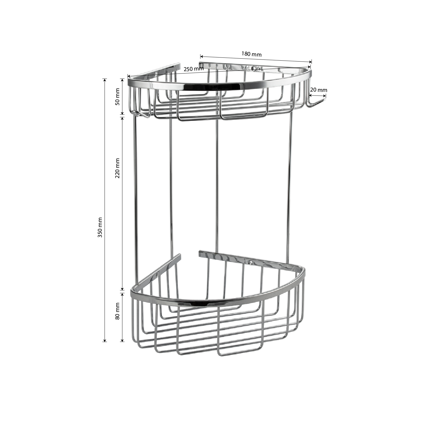 Полочка угловая, овальная, двухэтажная, для принадлежностей, решётка обладает высокими эксплуатационными характеристиками и подходит для использования дома, в общественных местах: отелях, ресторанах и пр. Изготовлена из прочной нержавеющей стали с хромоникелевым покрытием, которое придает безупречный глянцевый блеск и долговечность. Металлическая полка оснащена крючкоми. Аксессуар не занимает много места, надежно фиксируется к стене при помощи набора креплений (входят в комплект) и служит удобным местом для хранения бытовых и косметических средств. Габаритные размеры: высота 350 мм, ширина 250 мм, глубина 180 мм, расстояние между полками 220 мм, высота верхей полки 50 мм, высота нижней полки 80 мм. Вес - 1,0 кг, объём - 0,00990 м3.