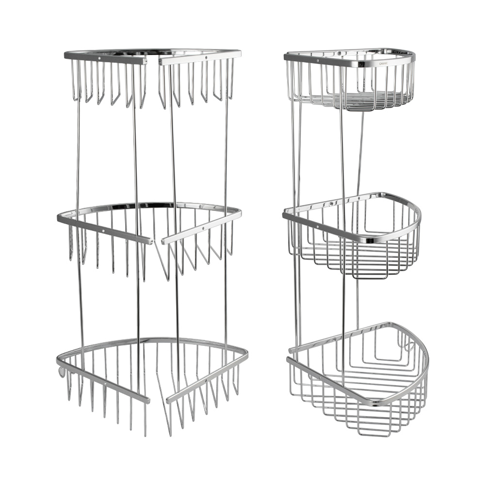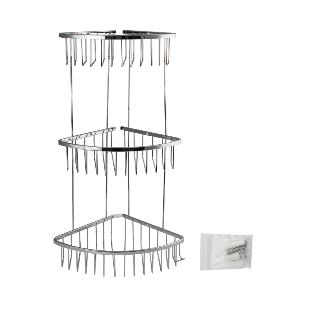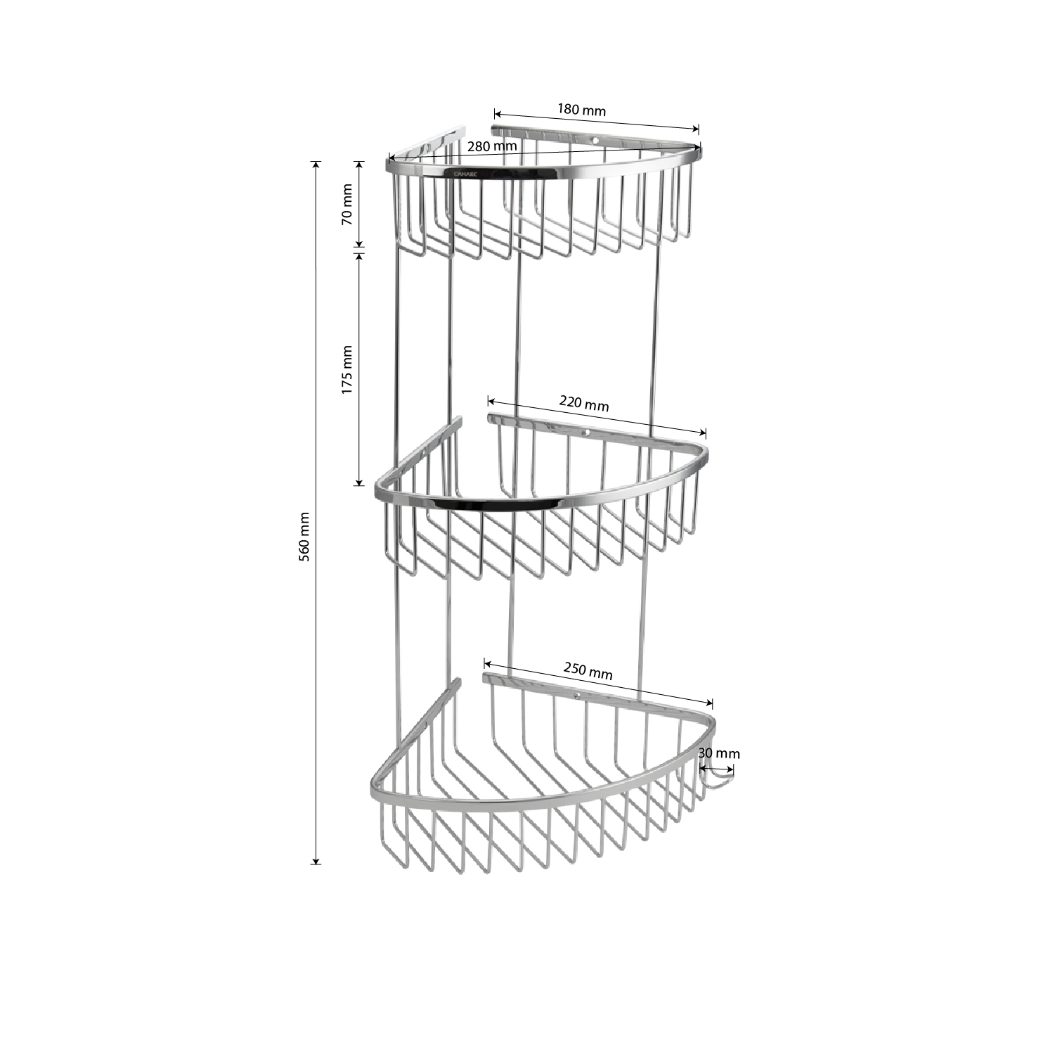Полочка угловая, овальная, трёхэтажная, для принадлежностей, решётка обладает высокими эксплуатационными характеристиками и подходит для использования дома, в общественных местах: отелях, ресторанах и пр. Изготовлена из прочной нержавеющей стали с хромоникелевым покрытием, которое придает безупречный глянцевый блеск и долговечность. Металлическая полка оснащена крючком. Аксессуар не занимает много места, надежно фиксируется к стене при помощи набора креплений (входят в комплект) и служит удобным местом для хранения бытовых и косметических средств. Габаритные размеры: высота 560 мм, глубина верхней полки 180 мм, глубина средней полки 220 мм, глубина нижней полки 250 мм, расстояние между полками 175 мм. Вес - 1,700 кг, объём - 0,04500 м3.