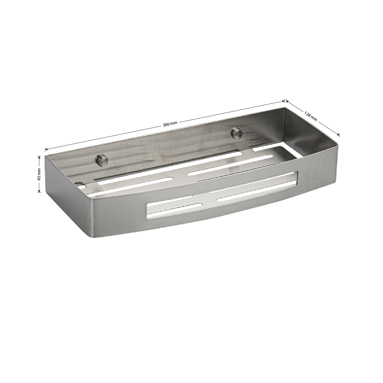 Полочка для принадлежностей, прямоугольная, с литым дном, одноэтажная, обладает высокими эксплуатационными характеристиками и подходит для использования дома, в общественных местах: отелях, ресторанах и пр. Изготовлена из прочной нержавеющей стали с матовым покрытием, которое придает безупречный внешний вид и долговечность. Аксессуар не занимает много места, надежно фиксируется к стене при помощи набора креплений (входят в комплект) и служит удобным местом для хранения бытовых и косметических средств. Габаритные размеры: длина 300 мм, ширина 128 мм, высота 45 мм. Вес - 0,73 кг, объём - 0,0035 м3.