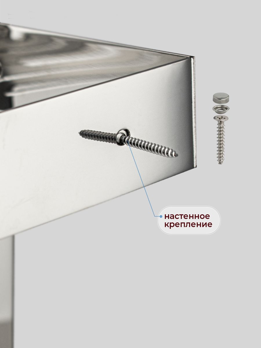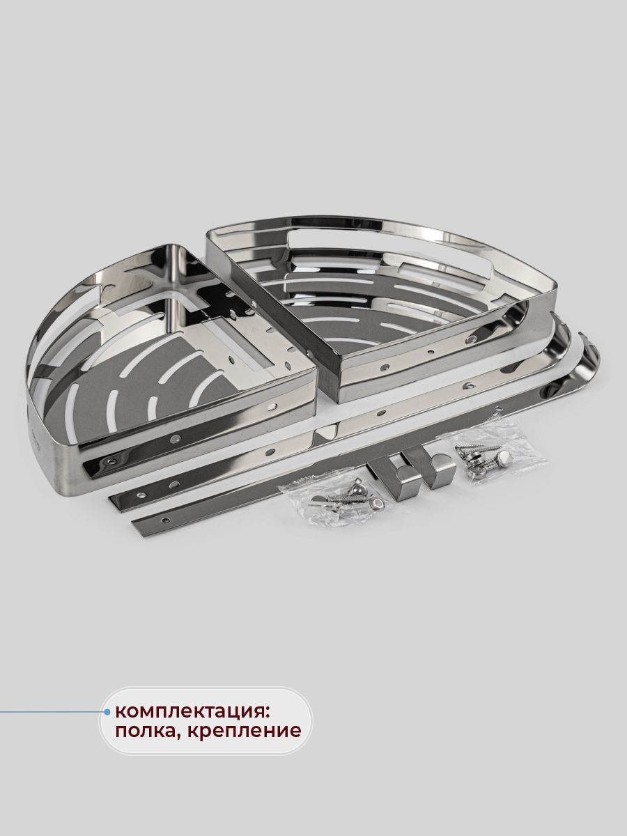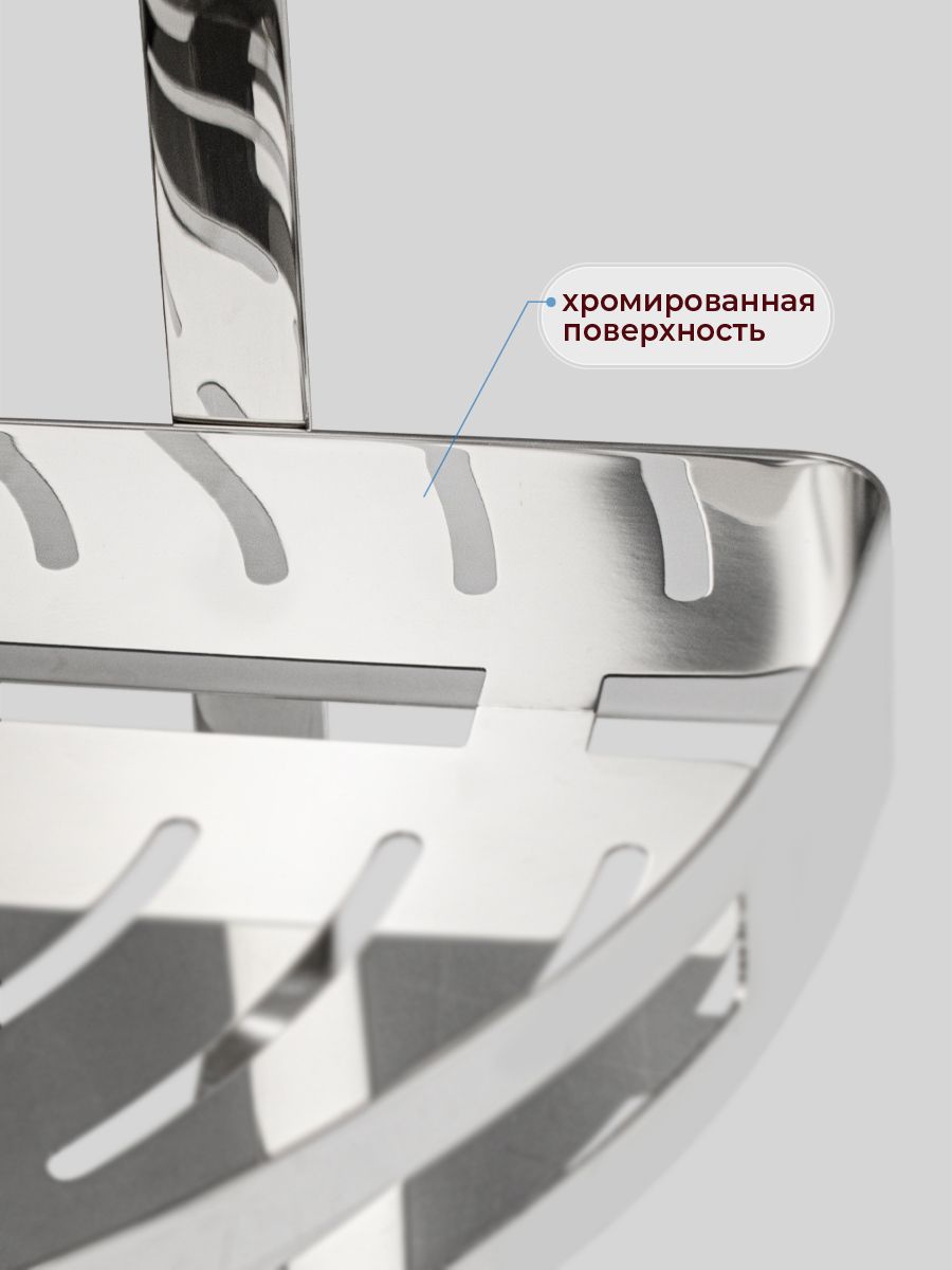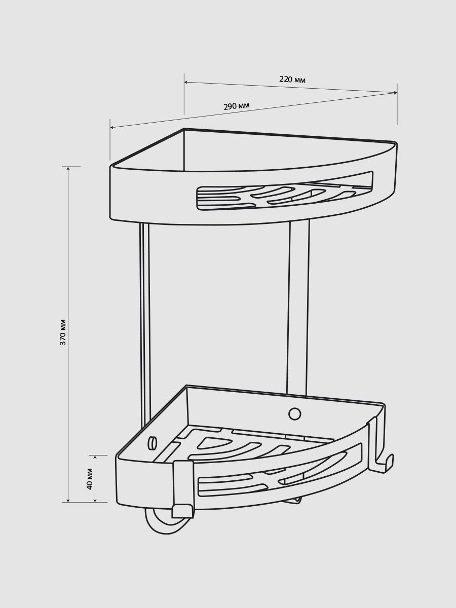 Полочка для принадлежностей, треугольная, угловая, с литым дном, двухэтажная, с двумя крючками, обладает высокими эксплуатационными характеристиками и подходит для использования дома, в общественных местах: отелях, ресторанах и пр. Изготовлена из прочной нержавеющей стали с хромоникелевым покрытием, которое придает безупречный глянцевый блеск и долговечность. Аксессуар не занимает много места, надежно фиксируется к стене при помощи набора креплений (входят в комплект) и служит удобным местом для хранения бытовых и косметических средств. Габаритные размеры: высота 370 мм, ширина 290 мм, глубина 220 мм, расстояние между полками 220 мм. Вес - 1,600 кг, объём - 0,00770 м3.