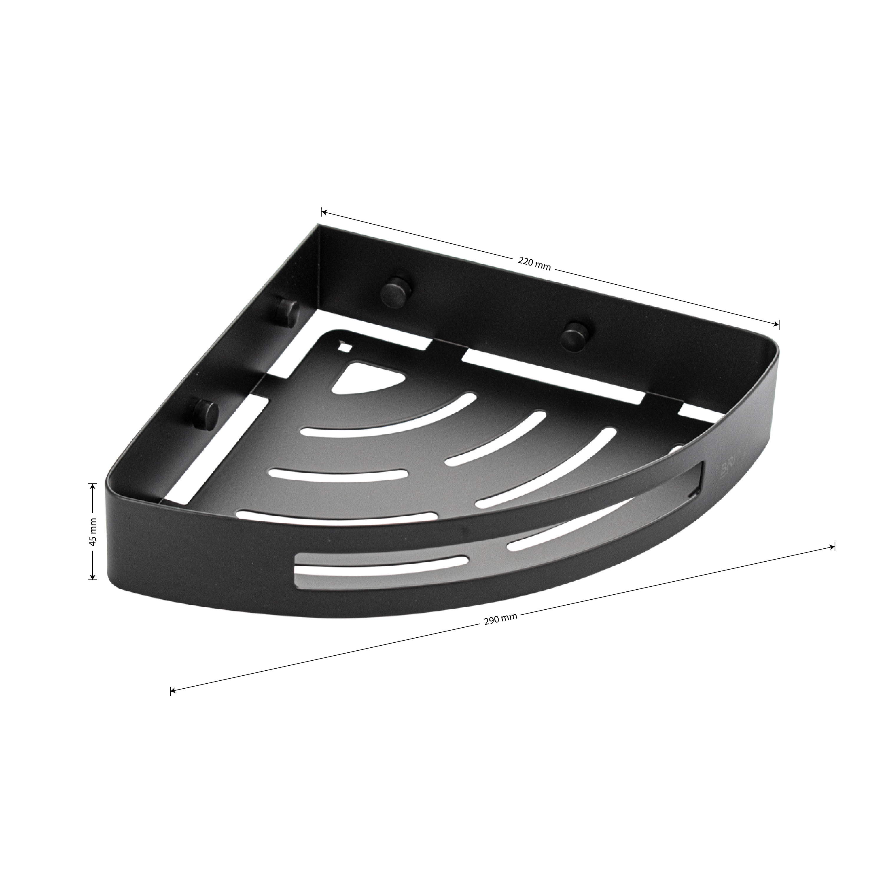 Полочка для принадлежностей, угловая, с литым дном, одноэтажная, обладает высокими эксплуатационными характеристиками и подходит для использования дома, в общественных местах: отелях, ресторанах и пр. Изготовлена из прочной нержавеющей стали с черным покрытием, которое придает безупречный вид и долговечность. Аксессуар не занимает много места, надежно фиксируется к стене при помощи набора креплений (входят в комплект) и служит удобным местом для хранения бытовых и косметических средств. Габаритные размеры: высота 45 мм, ширина 290 мм, глубина 220 мм. Вес - 0.70 кг, объём - 0.00283 м3.