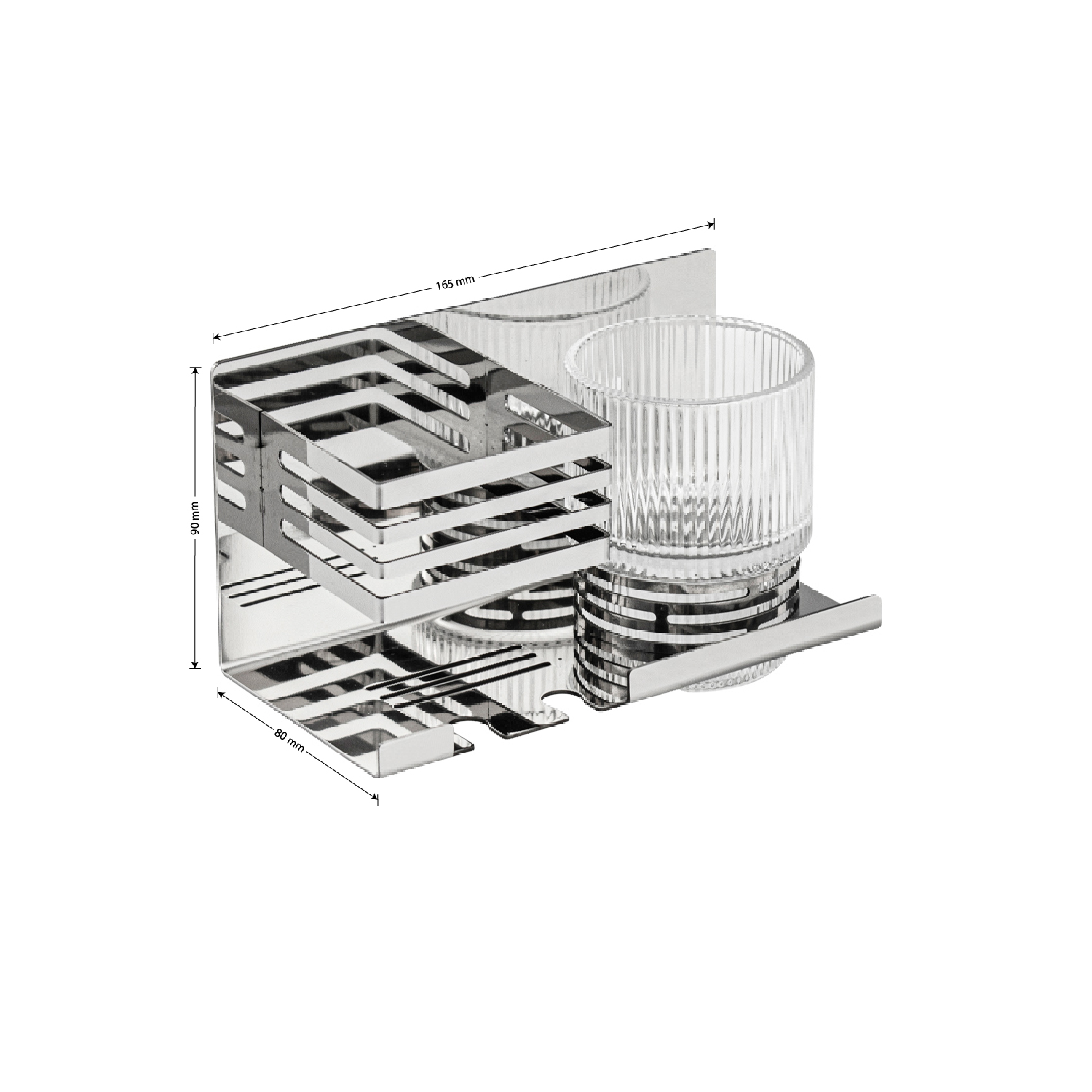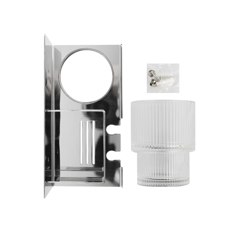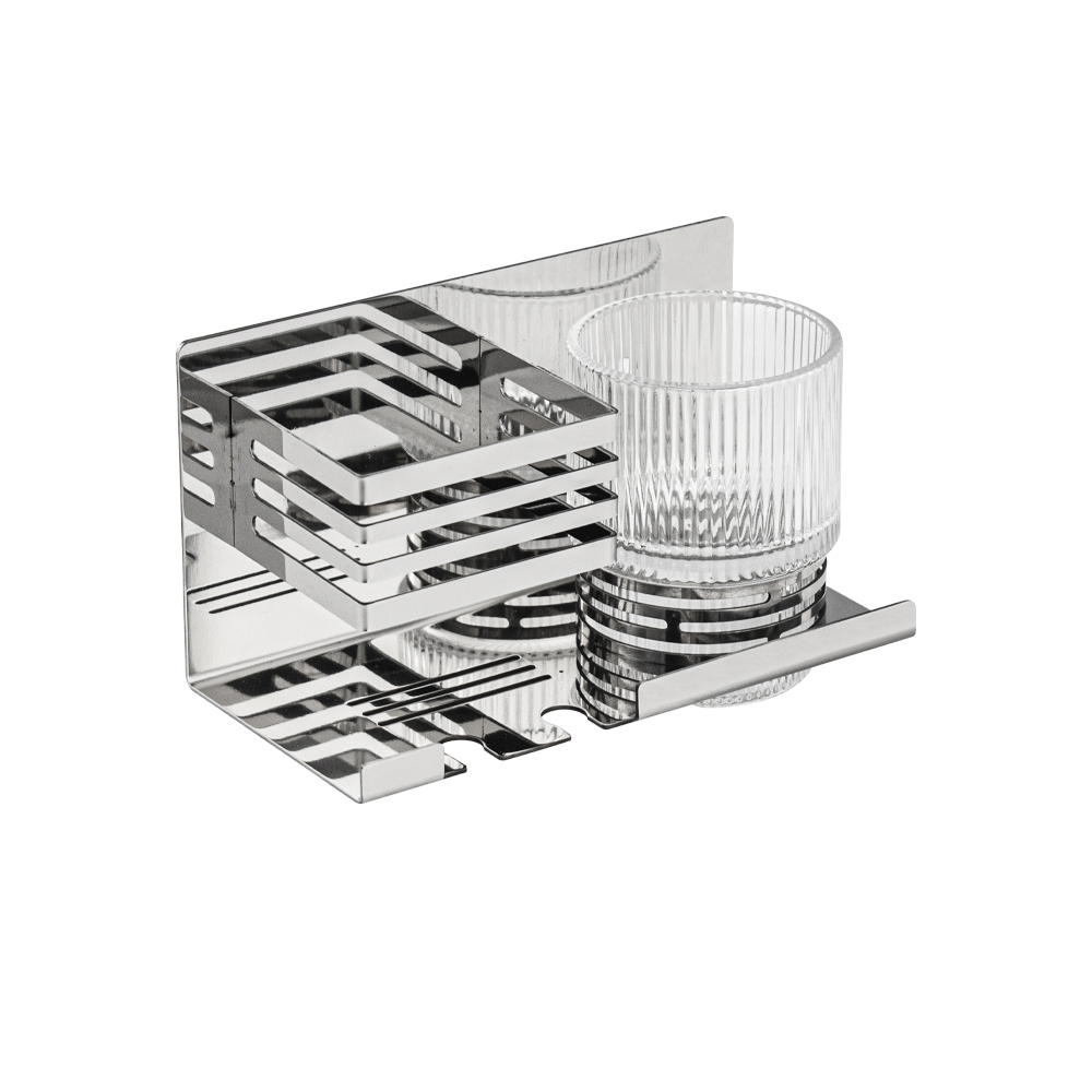Полочка со стеклянным стаканом и подставкой для зубных щёток, с креплением к стене. Изделие выполнено из стекла и полированной нержавеющей стали марки SUS 304, которые придает безупречный стильный вид и долговечность. Идеально подойдет не только для ванной, но и для кухни. Изделие крепится к стене с помощью дюбелей и саморезов (входят в комплект). Габаритные размеры: высота стакана 90 мм, диаметр 68 мм, ширина 165 мм, глубина 80 мм, высота 90 мм. Вес - 0,602 кг, объём - 0,0021 м3.