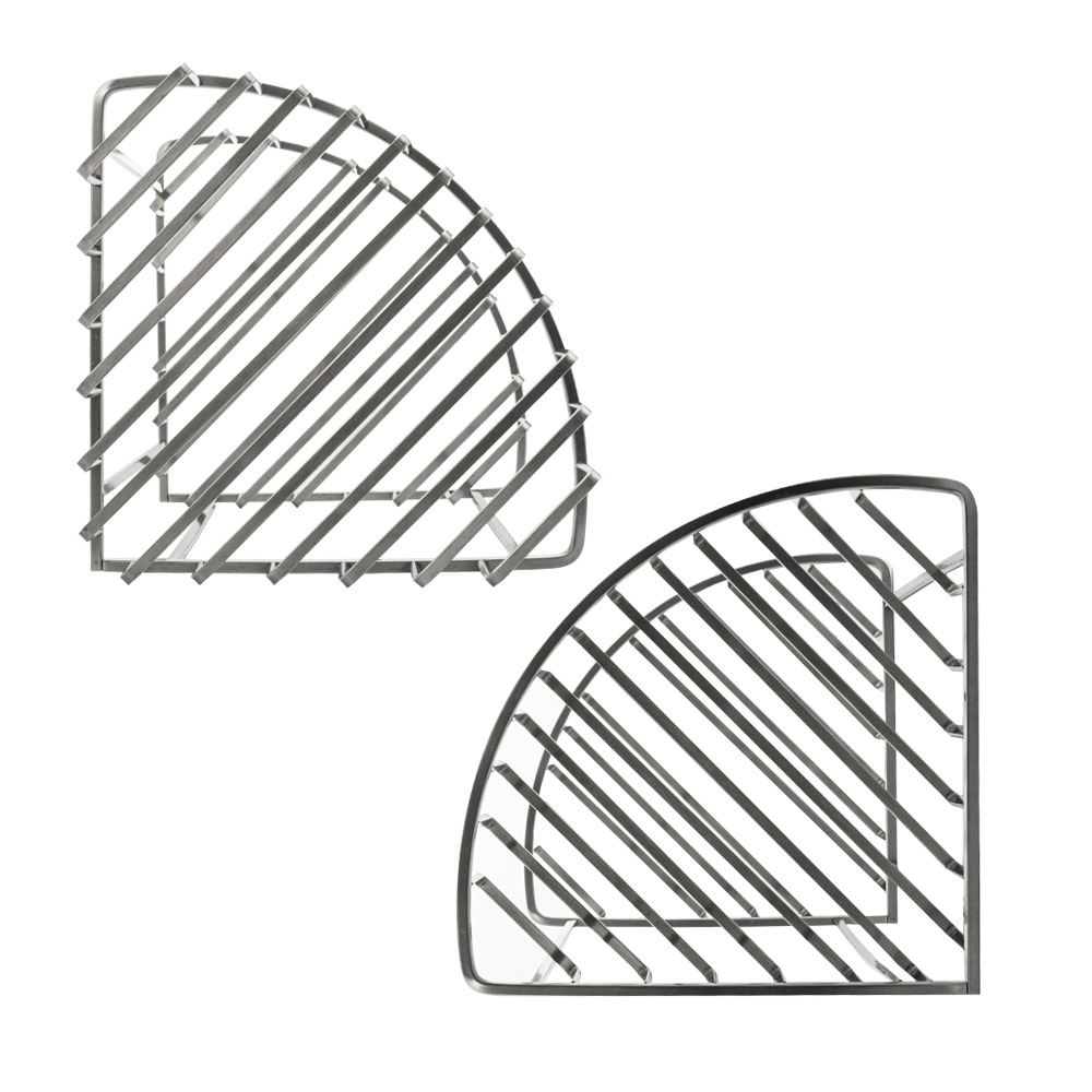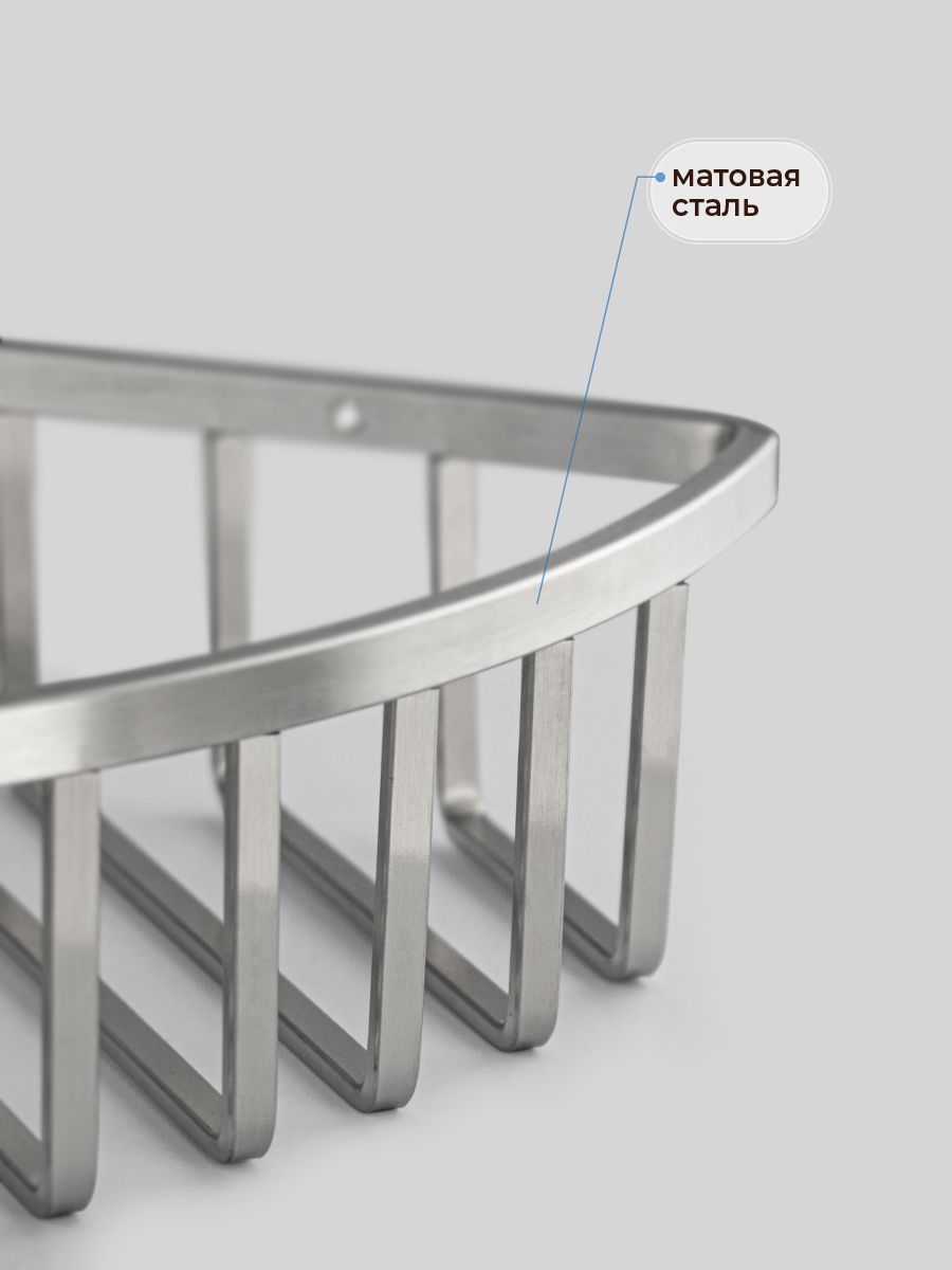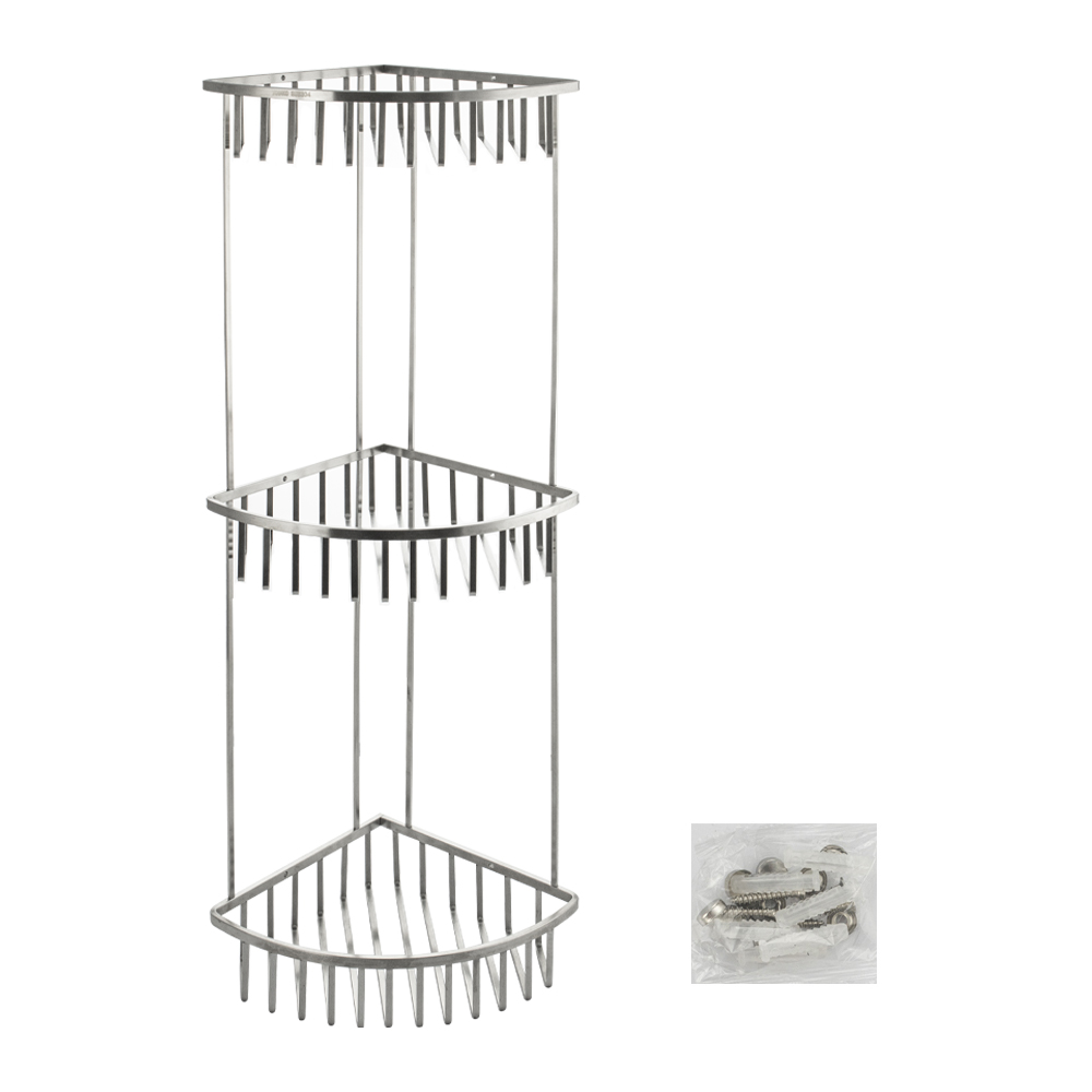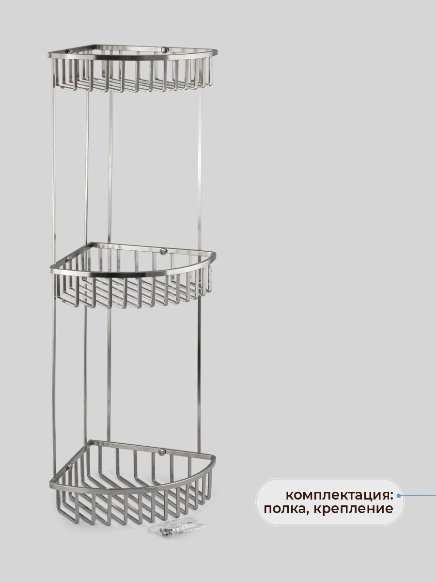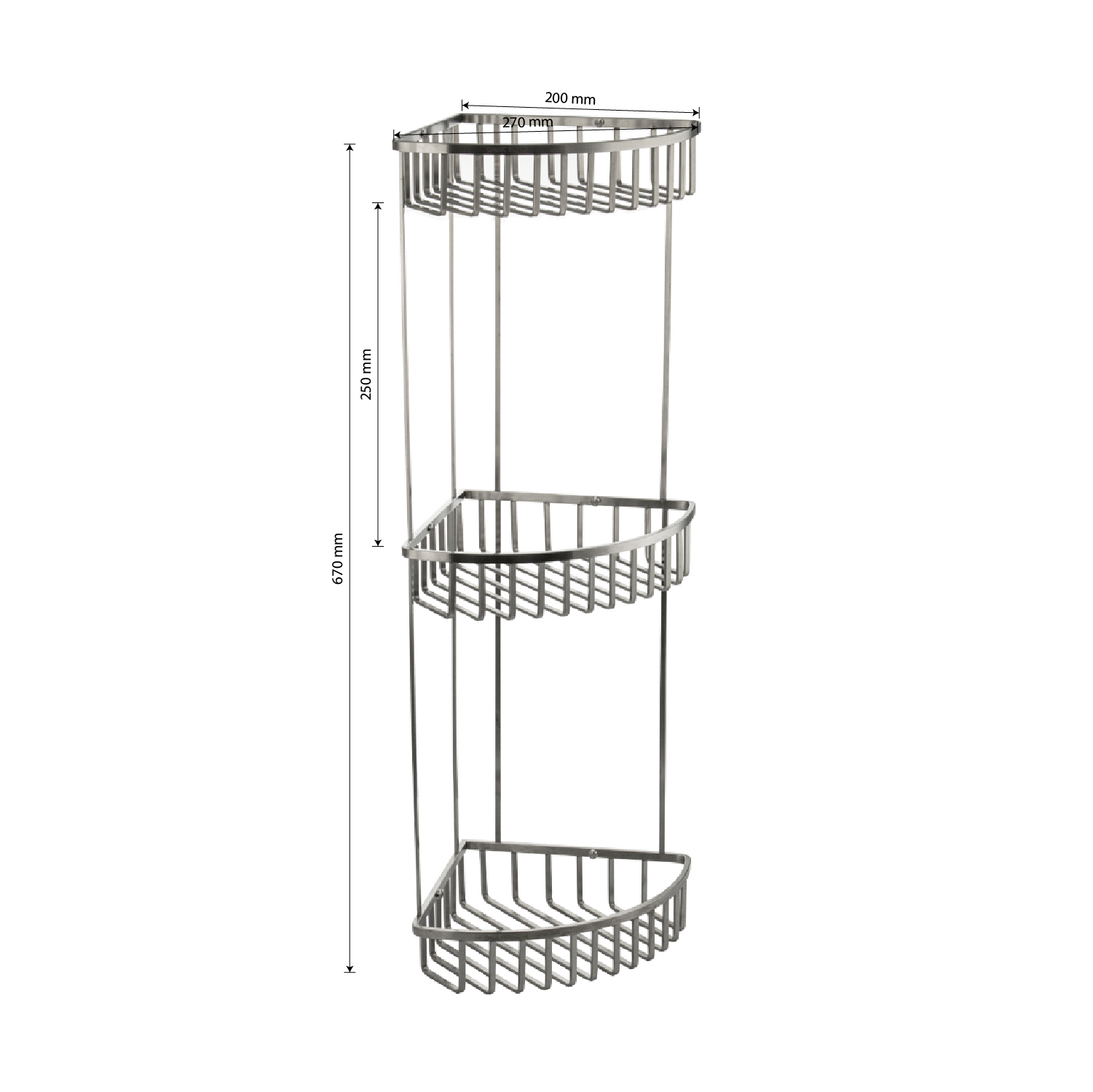 Полочка угловая, овальная, трёхэтажная, для принадлежностей, решётка с плоскими толстыми прутьями, обладает высокими эксплуатационными характеристиками и подходит для использования дома, в общественных местах: отелях, ресторанах и пр. Изготовлена из прочной нержавеющей стали с матовым покрытием, которое придает безупречный внешний вид и долговечность. Аксессуар не занимает много места, надежно фиксируется к стене при помощи набора креплений (входят в комплект) и служит удобным местом для хранения бытовых и косметических средств. Габаритные размеры: высота 670 мм, ширина 270 мм, глубина 200 мм, расстояние между полками 250 мм. Вес - 1,900 кг, объём - 0,01600 м3.