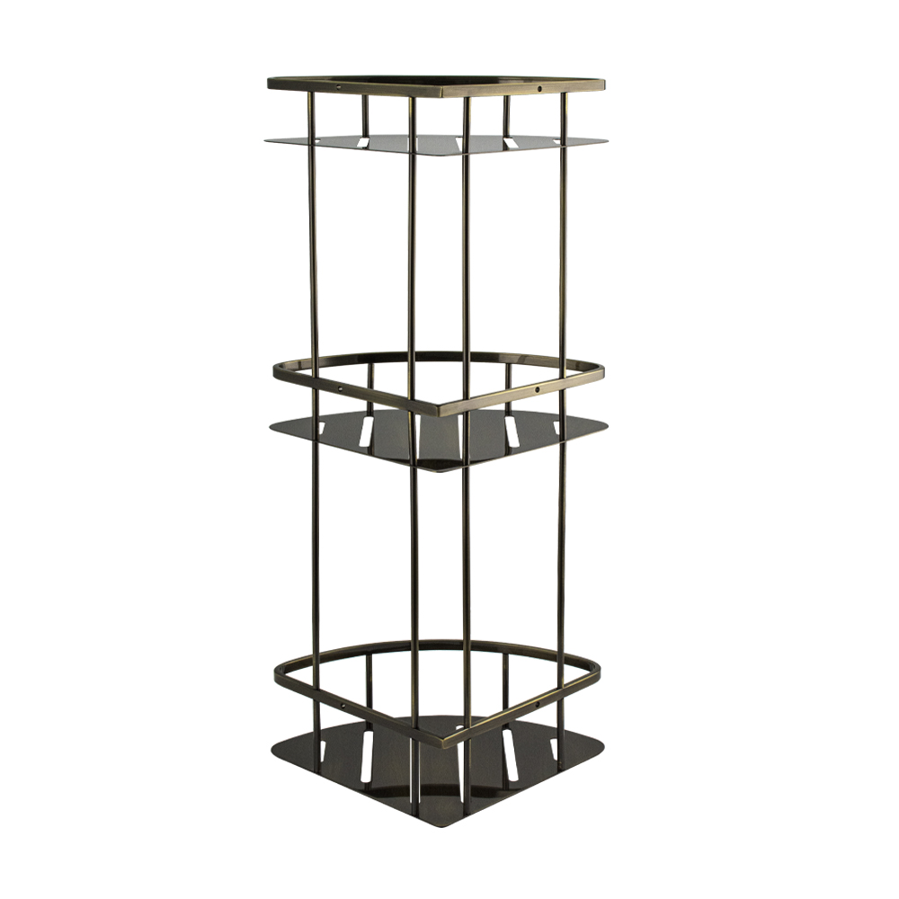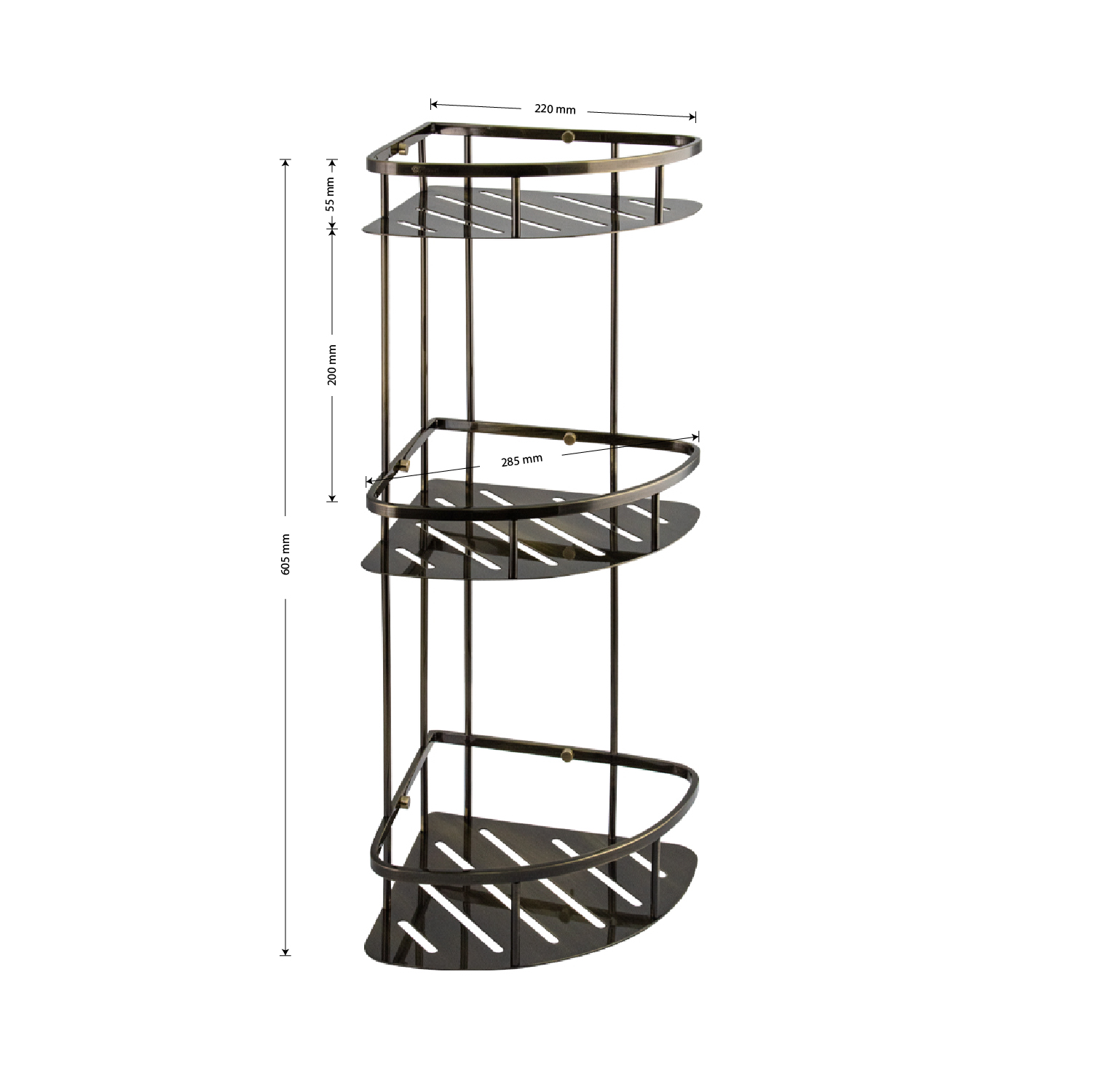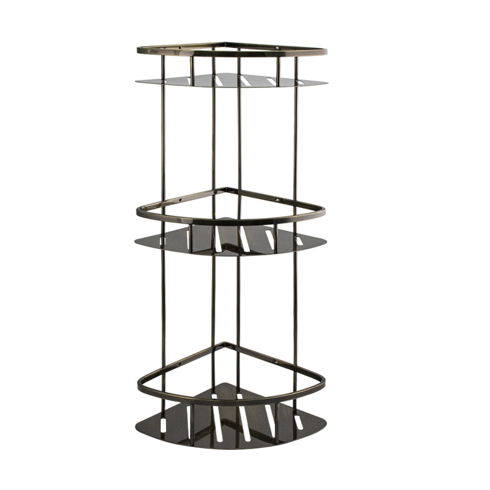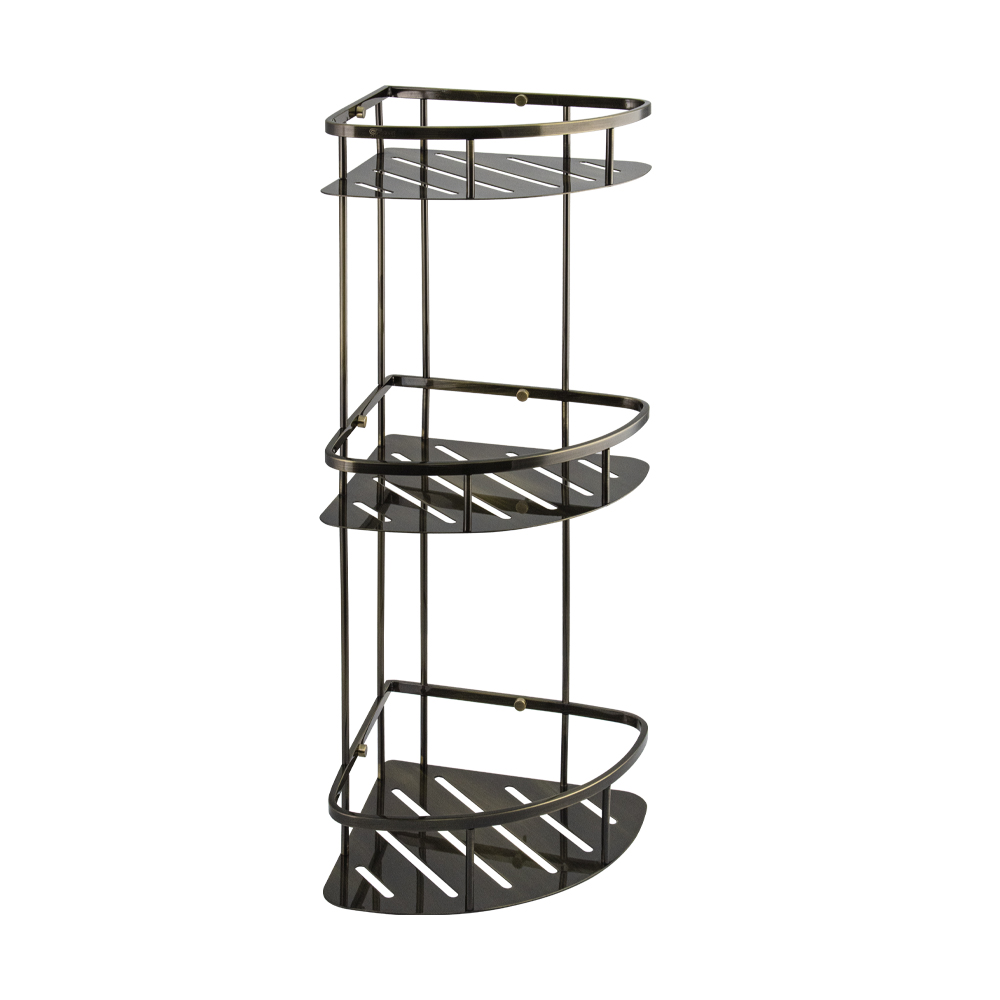 Полочка угловая, овальная, трёхэтажная, для принадлежностей, с литым дном, обладает высокими эксплуатационными характеристиками и подходит для использования дома, в общественных местах: отелях, ресторанах и пр. Изготовлена из прочной нержавеющей стали с гальваническим покрытием под бронзу, которое придает безупречный глянцевый блеск и долговечность. Аксессуар не занимает много места, надежно фиксируется к стене при помощи набора креплений (входят в комплект) и служит удобным местом для хранения бытовых и косметических средств. Габаритные размеры: высота 605 мм, ширина 285 мм, глубина 220 мм, расстояние между полками 200 и 220 мм. Вес - 3,000 кг, объём - 0,03491 м3.
