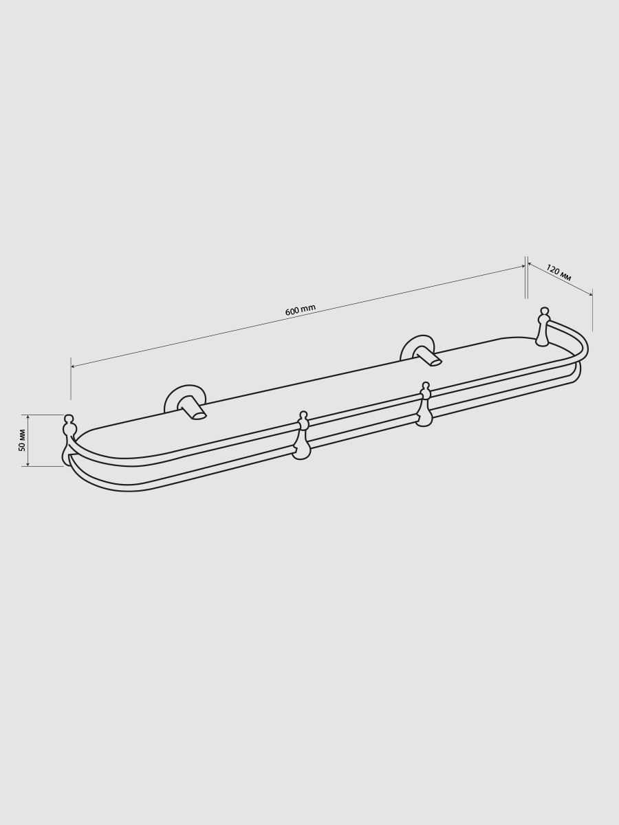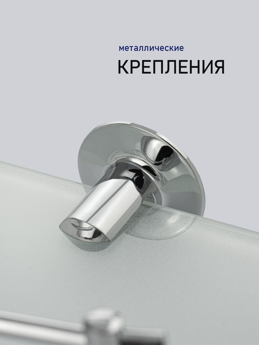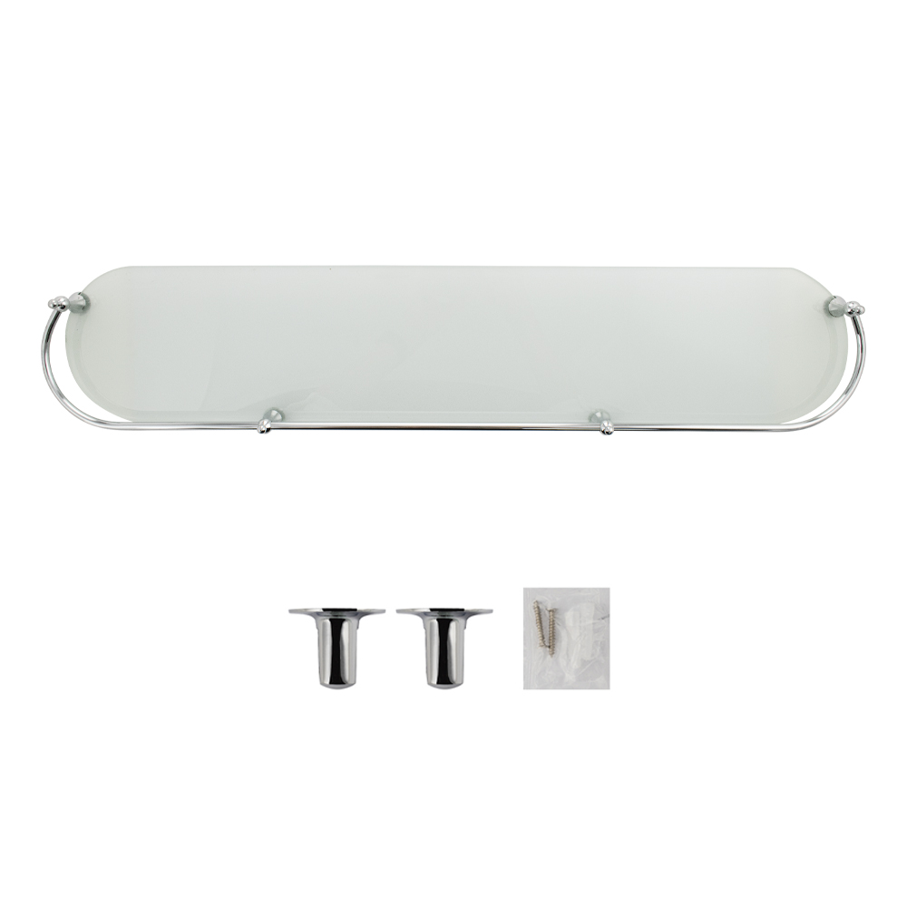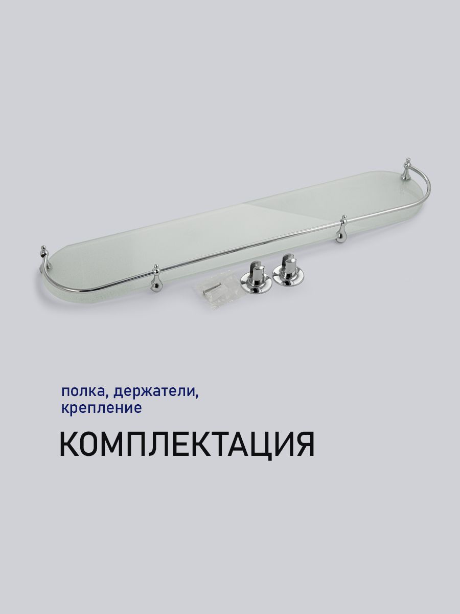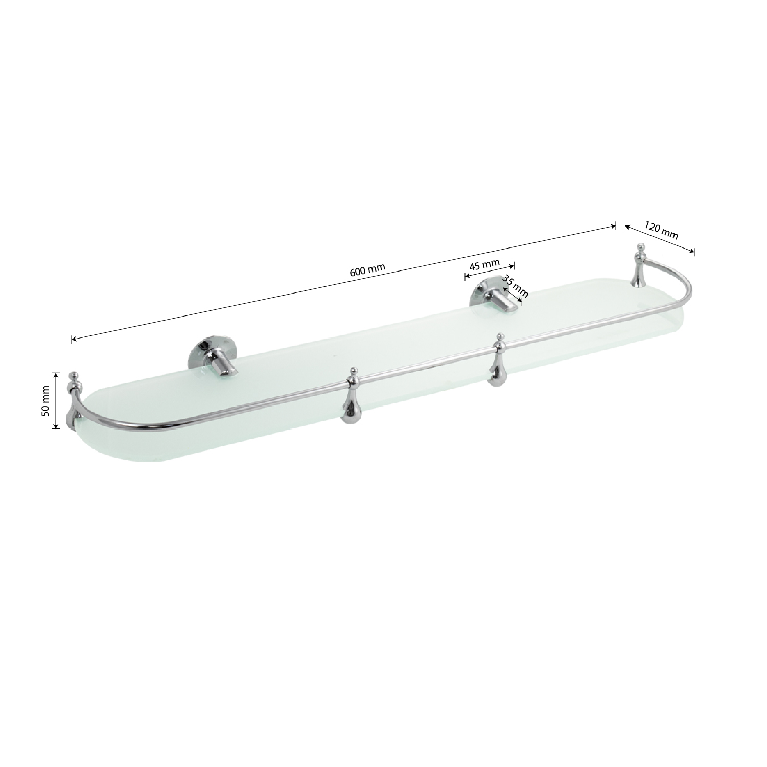 Прямоугольная полка из матового стекла толщиной 5 мм с полированными краями о которые невозможно порезаться, с надежной фиксацией к стене с помощью крепления из металла, с хромированным покрытием, идеально подходит для хранения различных ванных принадлежностей. Полочка изготовлена из качественного матового стекла и имеет бортик, предотвращающий падение ванных принадлежностей. Полка для ванной функциональное и практичное решение для любого интерьера. Хромированное покрытие креплений очень стойко переносит истирания и обеспечивает зеркальный блеск изделия. Идеально подойдет не только для ванной, но и для кухни. Изделие крепится к стене с помощью дюбелей и саморезов (входят в комплект). Габаритные размеры: ширина 600 мм, глубина 120 мм, высота 50 мм, диаметр посадочного седла 50 мм. Вес - 1,400 кг, объём - 0,00590 м3.