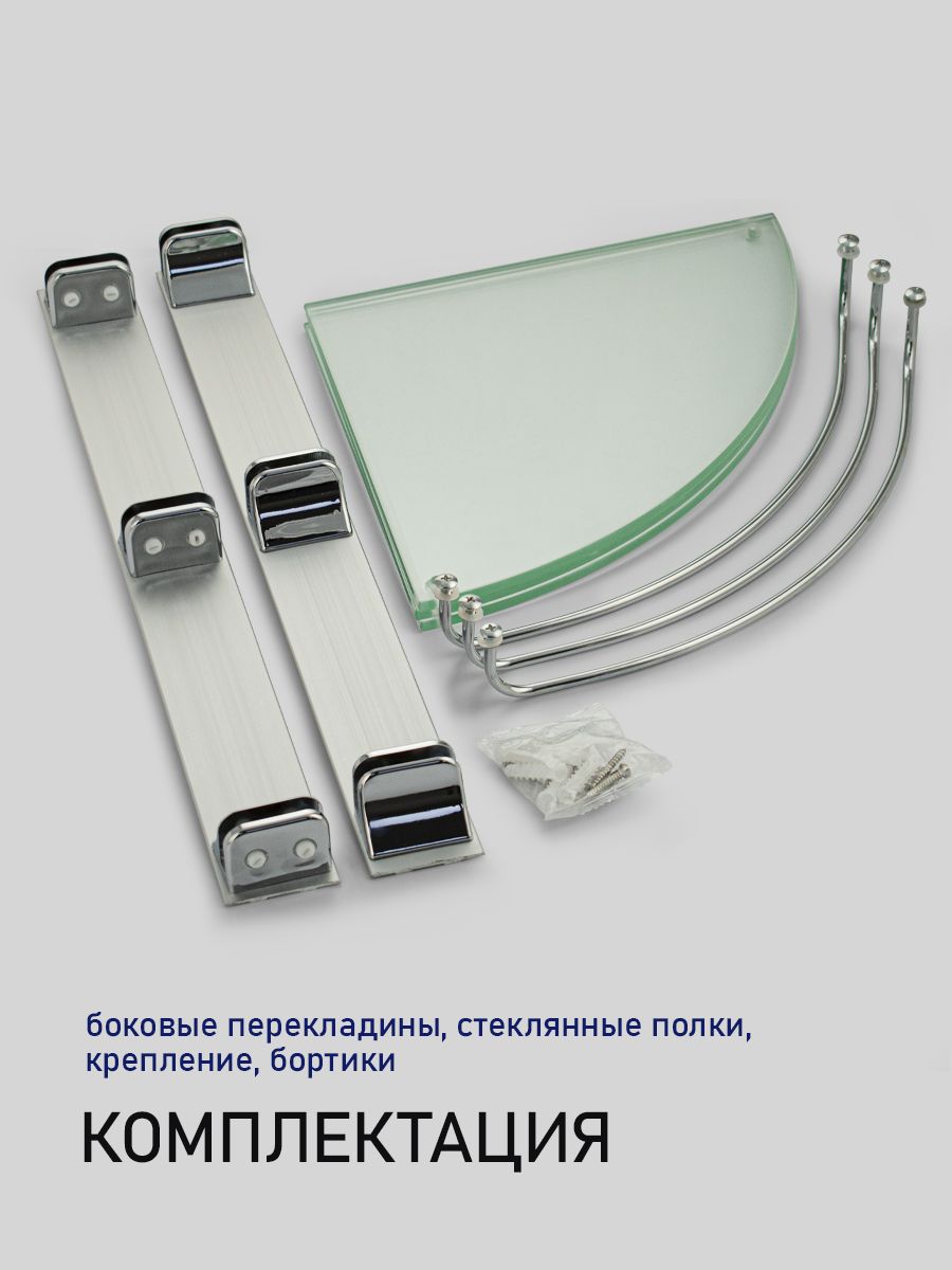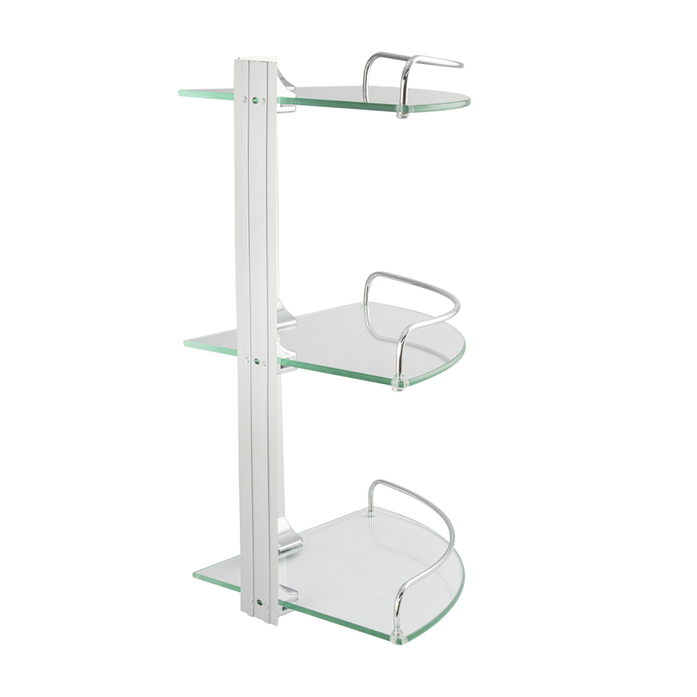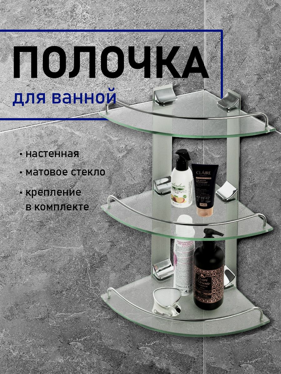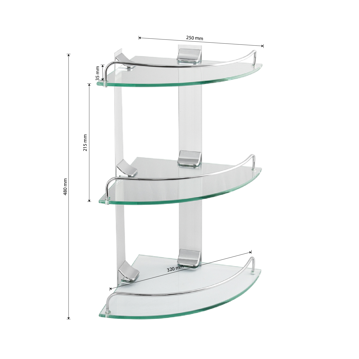 Подвесная трёхэтажная угловая полка для ванной из прочного стекла, толщиной 5 мм с полированными краями о которые невозможно порезаться, с надежной фиксацией к стене с помощью крепления из металла с хромированным покрытием, идеально подходит для хранения различных ванных принадлежностей. Полочка изготовлена из качественного стекла и имеет бортик, предотвращающий падение ванных принадлежностей. Полка для ванной функциональное и практичное решение для любого интерьера. Хромированное покрытие креплений очень стойко переносит истирания и обеспечивает зеркальный блеск изделия. Идеально подойдет не только для ванной, но и для кухни. Изделие крепится к стене с помощью дюбелей и саморезов (входят в комплект). Габаритные размеры: высота 480 мм, длина стороны 250 мм, ширина 320 мм, расстояние между полками 215 мм. Вес - 2,700 кг, объём - 0,00600 м3.