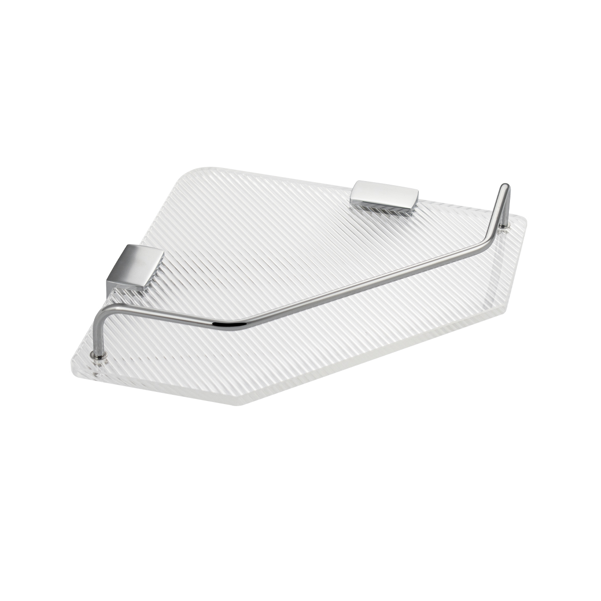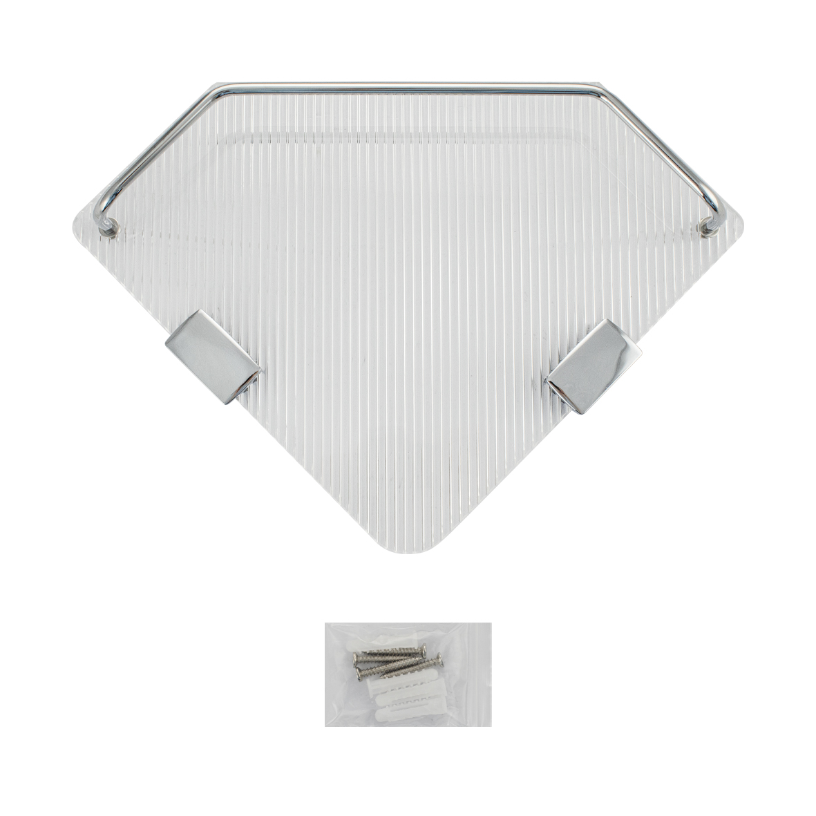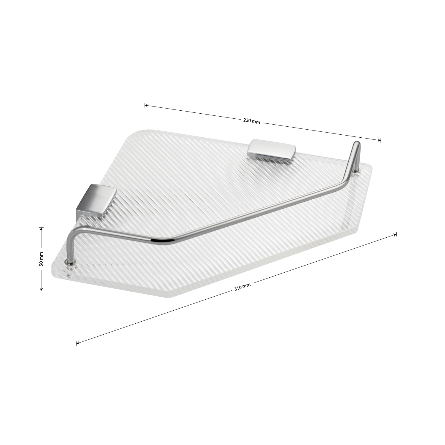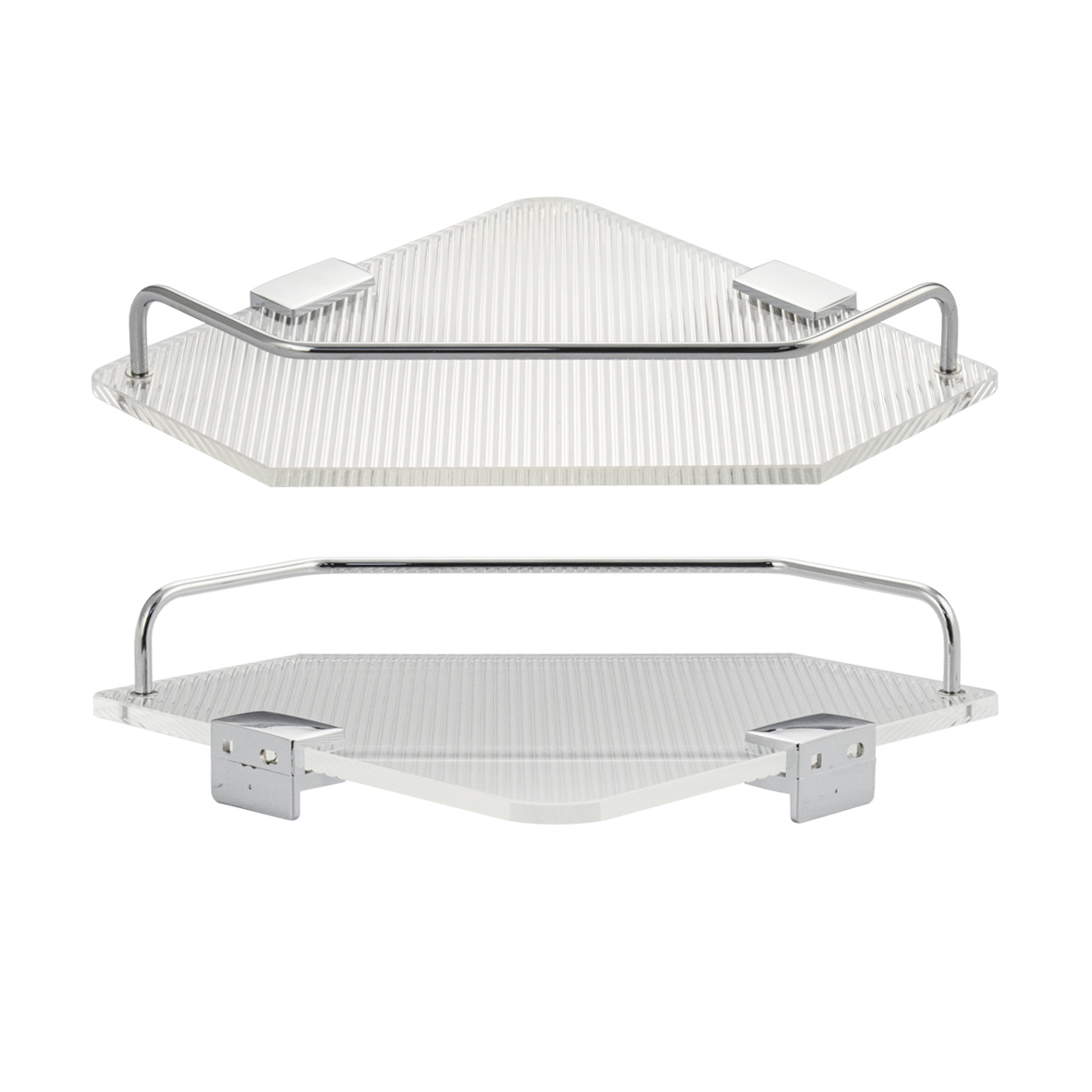 Подвесная однаэтажная угловая полка пятиугольная для ванной из прочного оргстекла с полированными краями о которые невозможно порезаться, с надежной фиксацией к стене с помощью крепления с хромированным покрытием, идеально подходит для хранения различных ванных принадлежностей. Полочка изготовлена из качественного оргстекла и имеет бортик, предотвращающий падение ванных принадлежностей. Полка для ванной ункциональное и практичное решение для любого интерьера, Хромированное покрытие креплений очень стойко переносит истирания и обеспечивает зеркальный блеск изделия. Идеально подойдет не только для ванной, но и для кухни. Изделие крепится к стене с помощью дюбелей и саморезов (входят в комплект). Размеры: ширина 310 мм, длина стороны 230 мм. Вес - 0,600 кг, объём - 0,00395 м3