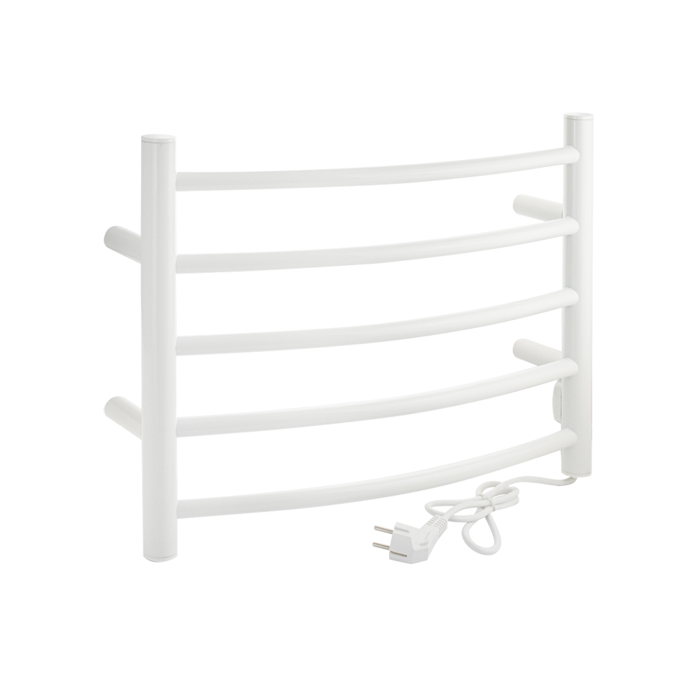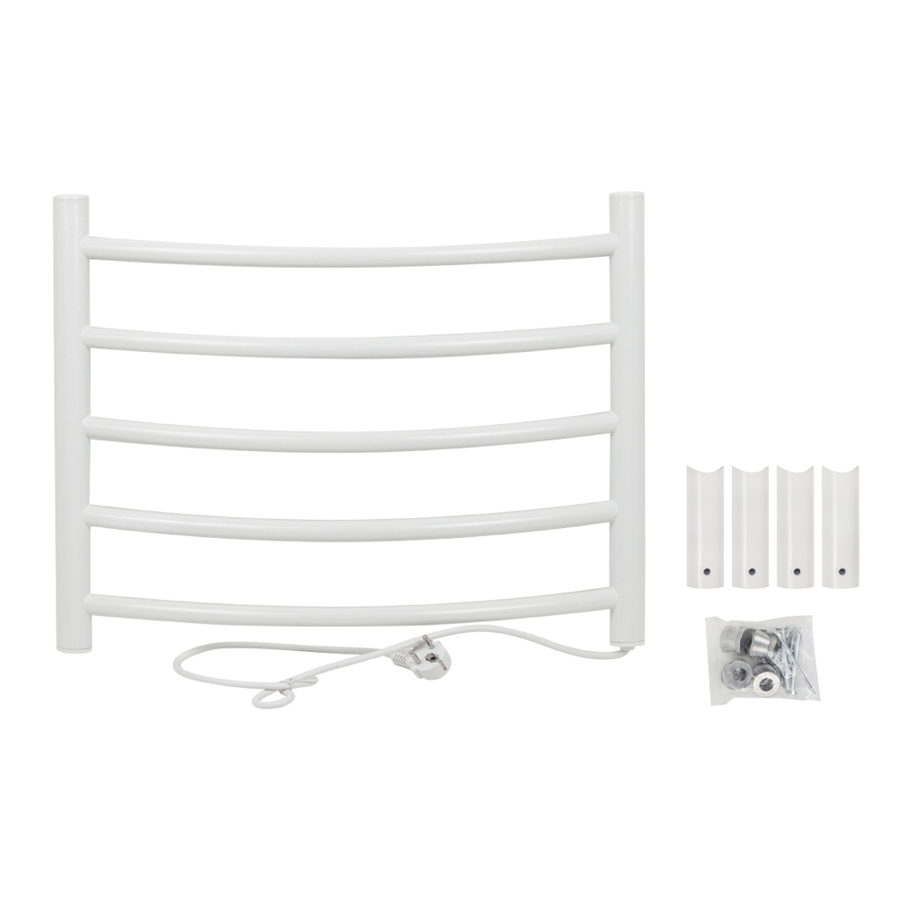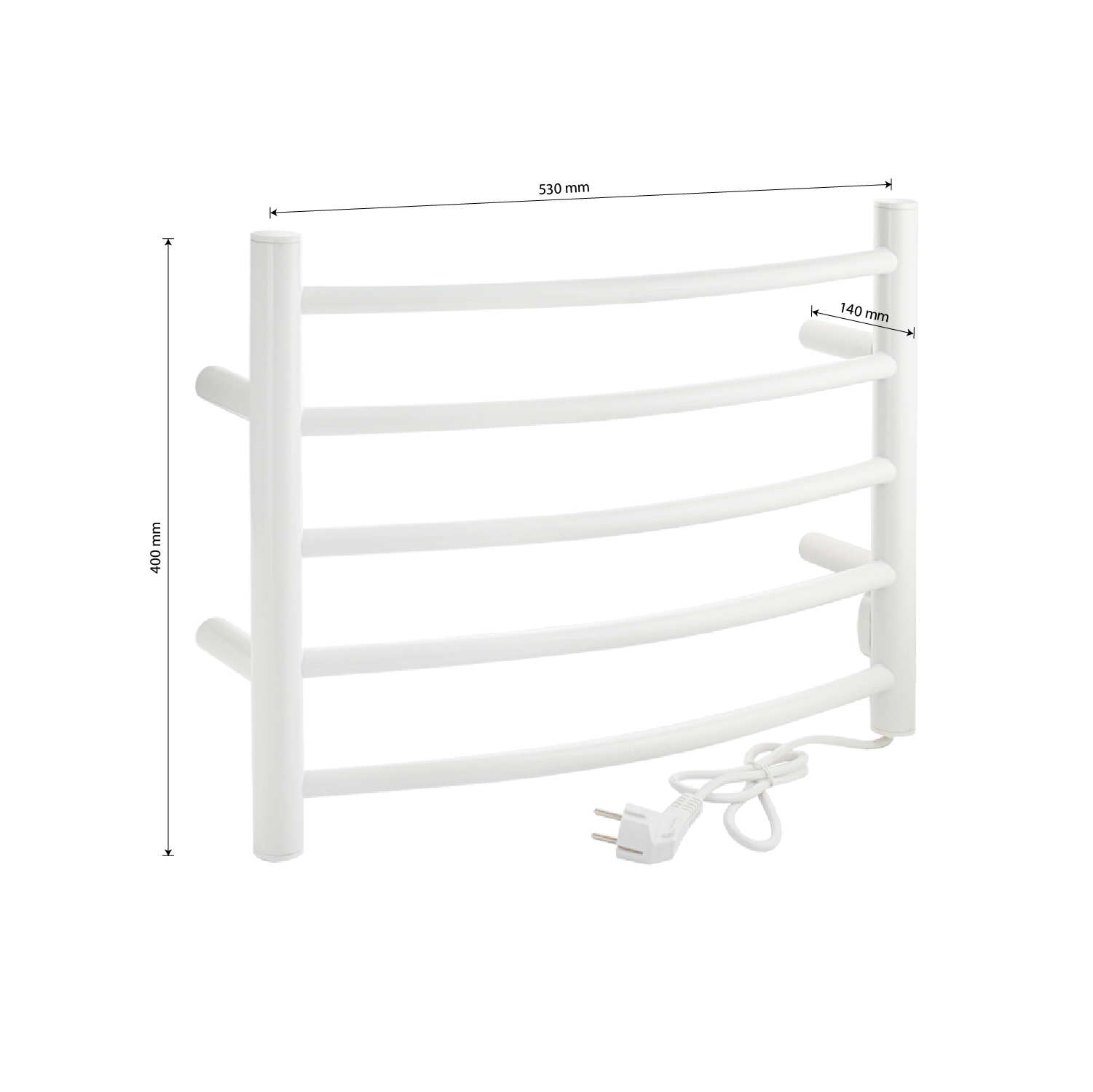 Полотенцесушитель электрический белый, классик, премиум, дуга, гармонично впишется в современный интерьер и поможет поддержать комфортную атмосферу в ванной комнате, работает вне зависимости от отопительного сезона, и его можно разместить в любом месте ванной или даже на стене в комнате. Сверху нанесено белое полимерное покрытие, устойчивое к высоким температурам, основной материал изделия - высокоуглеродистая сталь. Благодаря продуманному расположению труб можно размещать объемный текстиль, сократив время просушки. Установка и ремонт не требуют работы сантехников. Габаритные размеры: высота 415 мм, ширина 540 мм, глубина 80 мм. 5 перекладин с сухим ТЭНом, 65 W, 220-240 V, 50 Hz, t - 50°С, IP 44. Комплект: полотенцесушитель, крепёж, провод с евровилкой для подключения. Вес - 2,500 кг, объём - 0,02000 м3.