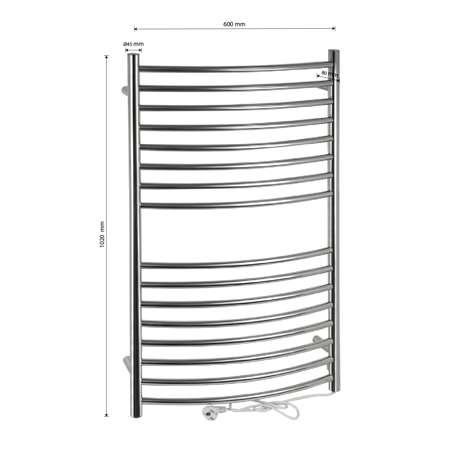 Полотенцесушитель электрический классик, премиум, дуга, лесенка, из нержавеющей стали 304, тэн из углеродного волокна, гармонично впишется в современный интерьер и поможет поддержать комфортную атмосферу в ванной комнате, работает вне зависимости от отопительного сезона, и его можно разместить в любом месте ванной или даже на стене в комнате. Хромированная поверхность устойчива к высоким температурам. Благодаря продуманному расположению труб можно размещать объемный текстиль, сократив время просушки. Установка и ремонт не требуют работы сантехников. Габаритные размеры: высота 1020 мм, ширина 600 мм, глубина 80 мм. 16 перекладин, с сухим ТЭНом, 200 W, 220-230 V, 50-60 Гц, t - 50°С, IP 44. Комплект: полотенцесушитель, крепёж, провод с евровилкой для подключения. Вес - 5,800 кг, объём - 0,08000 м3.