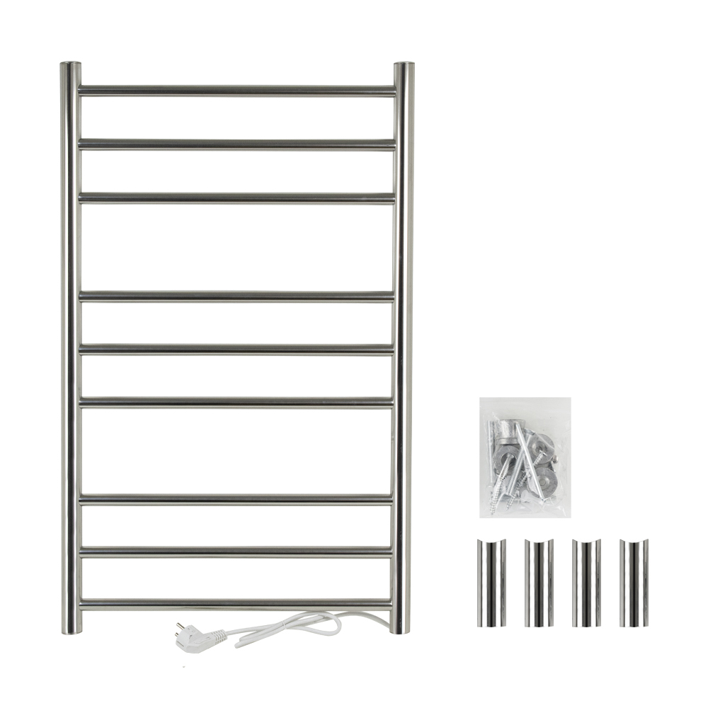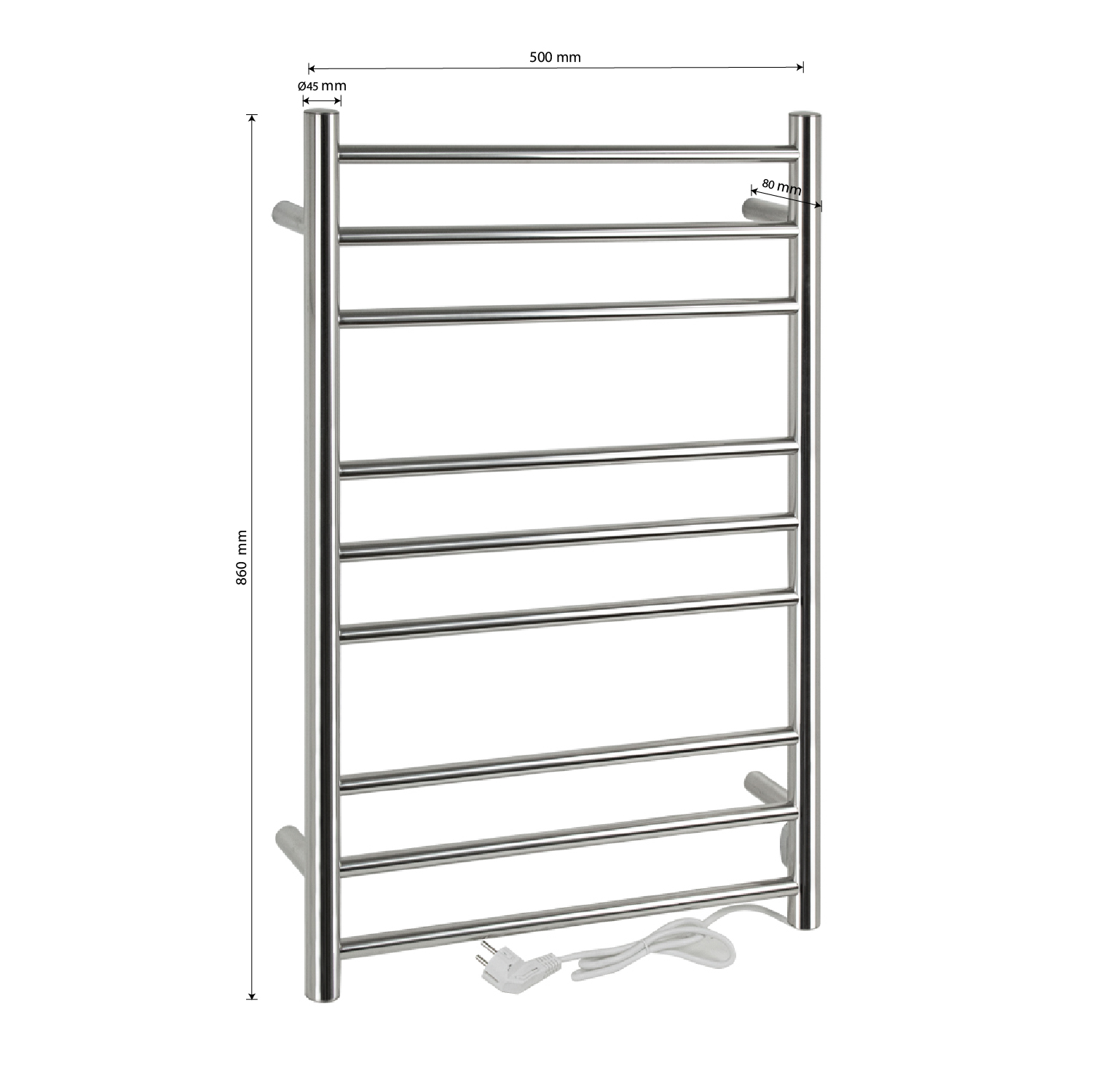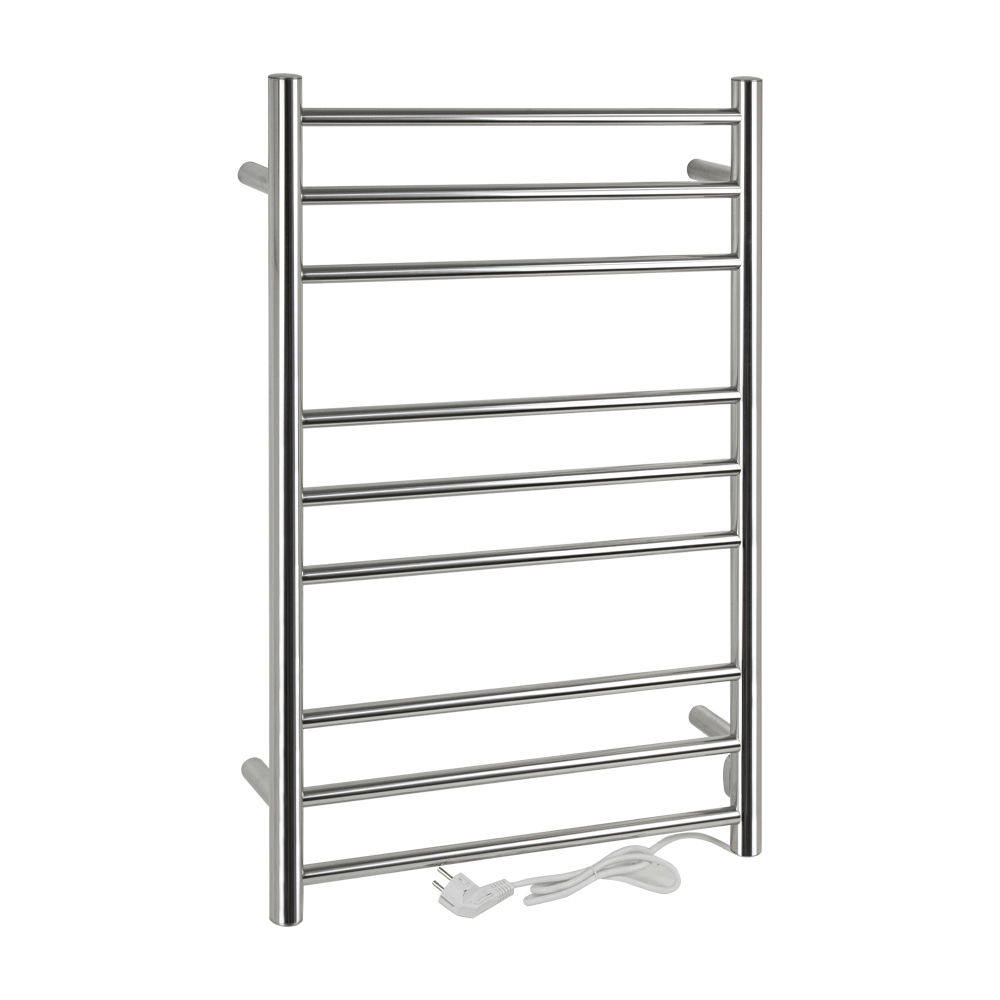 Полотенцесушитель электрический классик, премиум, прямой, лесенка, из нержавеющей стали марки 304, тэн из углеродного волокна, гармонично впишется в современный интерьер и поможет поддержать комфортную атмосферу в ванной комнате, работает вне зависимости от отопительного сезона, и его можно разместить в любом месте ванной или даже на стене в комнате. Хромированная поверхность устойчива к высоким температурам. Благодаря продуманному расположению труб можно размещать объемный текстиль, сократив время просушки. Установка и ремонт не требуют работы сантехников. Габариты и параметры: высота 860 мм, ширина 530 мм, глубина 80 мм. 9 перекладин с сухим ТЭНом, 100 W, 220-230 V, 50-60 Гц, t - 50°С, IP 44. Комплект: полотенцесушитель, крепёж, провод с евровилкой для подключения. Вес - 3,700 кг, объём - 0,02700 м3.