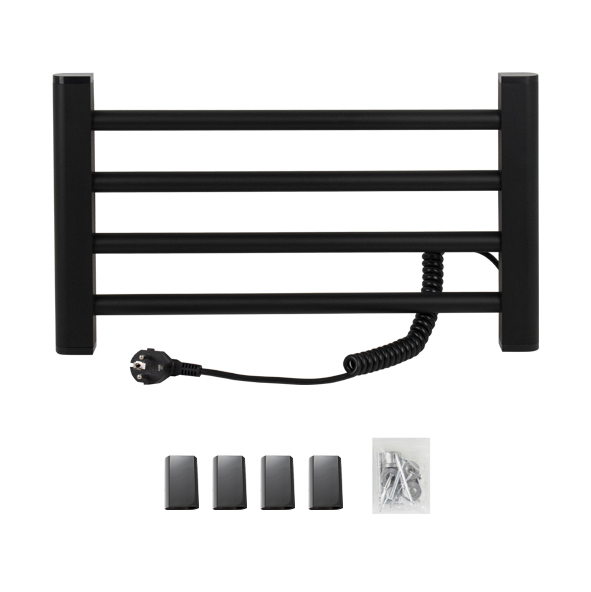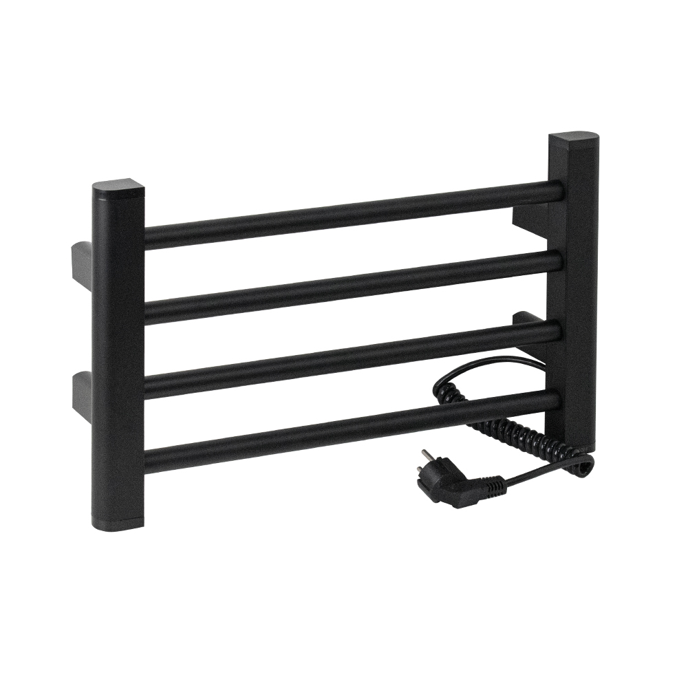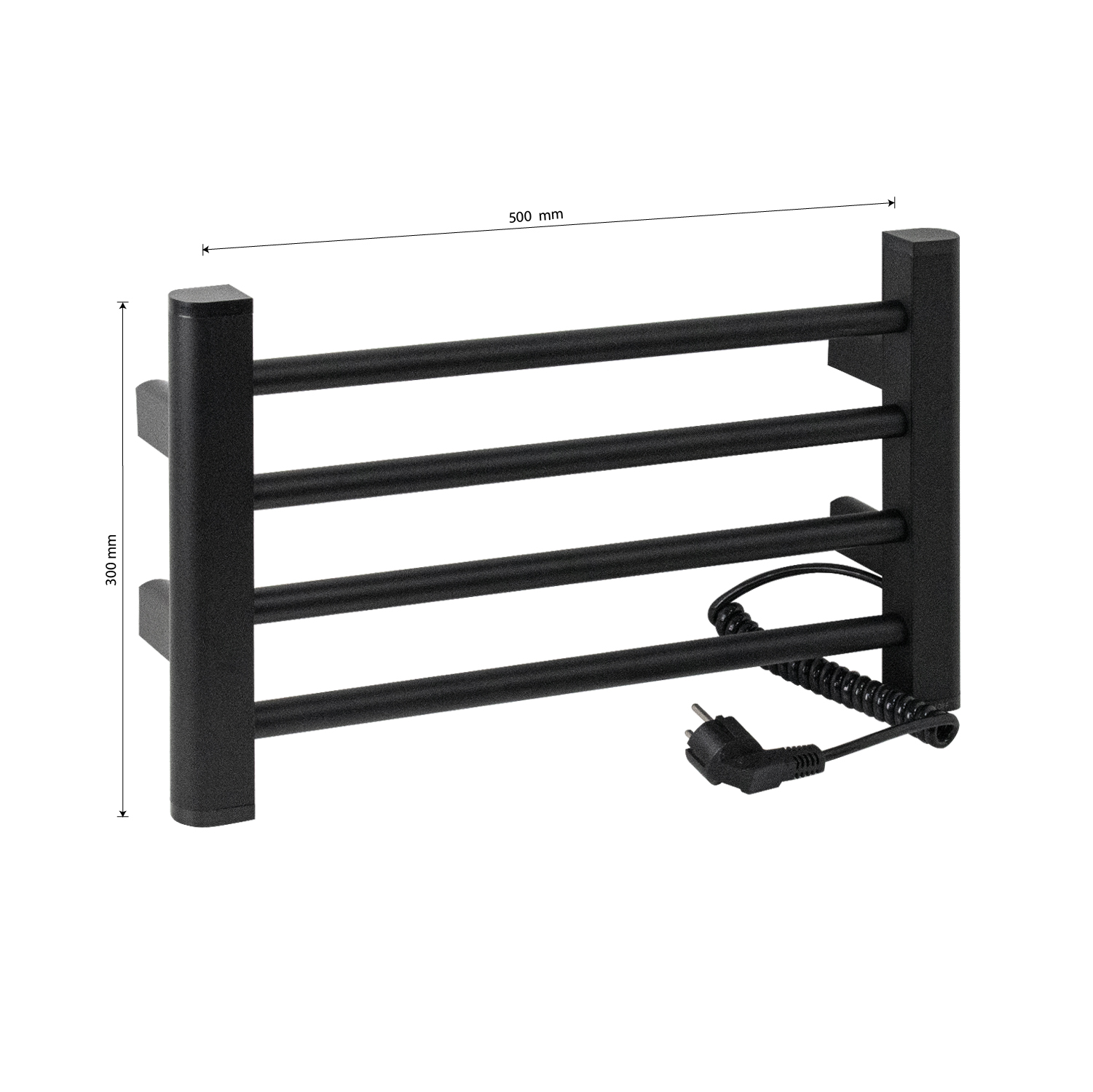 Полотенцесушитель электрический, чёрный, лесенка, из алюминия, тэн из углеродного волокна. Гармонично впишется в современный интерьер и поможет поддержать комфортную атмосферу в ванной комнате, работает вне зависимости от отопительного сезона, и его можно разместить в любом месте ванной или даже на стене в комнате. Сверху нанесено чёрное полимерное покрытие, устойчивое к высоким температурам. Благодаря продуманному расположению труб можно размещать объемный текстиль, сократив время просушки. Установка и ремонт не требуют работы сантехников. Габаритные размеры: высота 300 мм, ширина 500 мм, глубина 85 мм. 4 перекладины, с сухим ТЭНом, 68 W, 220-230 V, 50-60 Гц, t - 55°С, IP 44. Комплект: полотенцесушитель, крепёж, провод с евровилкой для подключения. Вес - 2,000 кг, объём - 0,01800 м3.