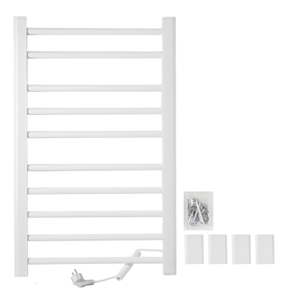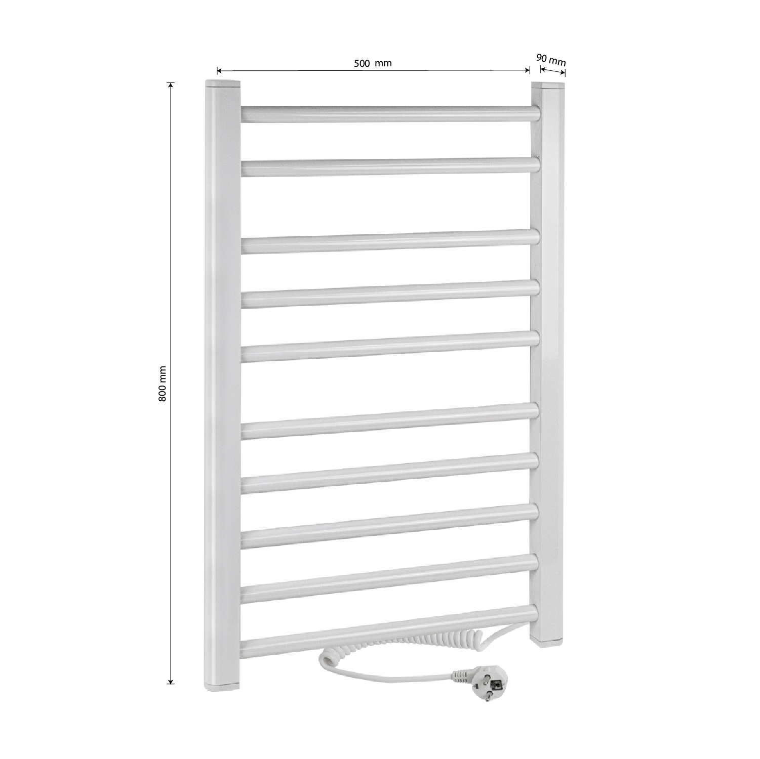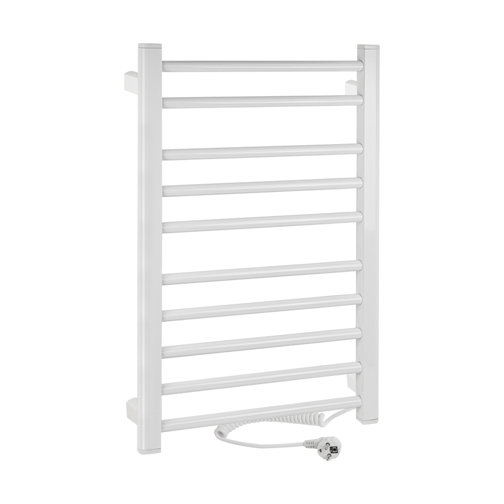 Полотенцесушитель электрический, белый, лесенка, из алюминия, тэн из углеродного волокна гармонично впишется в современный интерьер и поможет поддержать комфортную атмосферу в ванной комнате, работает вне зависимости от отопительного сезона, и его можно разместить в любом месте ванной или даже на стене в комнате. Сверху нанесено белое полимерное покрытие, устойчивое к высоким температурам. Благодаря продуманному расположению труб можно размещать объемный текстиль, сократив время просушки. Установка и ремонт не требуют работы сантехников. Габаритные размеры: высота 800 мм, ширина 500 мм, глубина 95 мм, 10 перекладин, с сухим ТЭНом, 150 W, 220-230 V, 50-60 Гц, t - 55°С, IP 44. Комплект: полотенцесушитель, крепёж, провод с евровилкой для подключения. Вес - 4,100 кг, объём - 0,03600 м3.