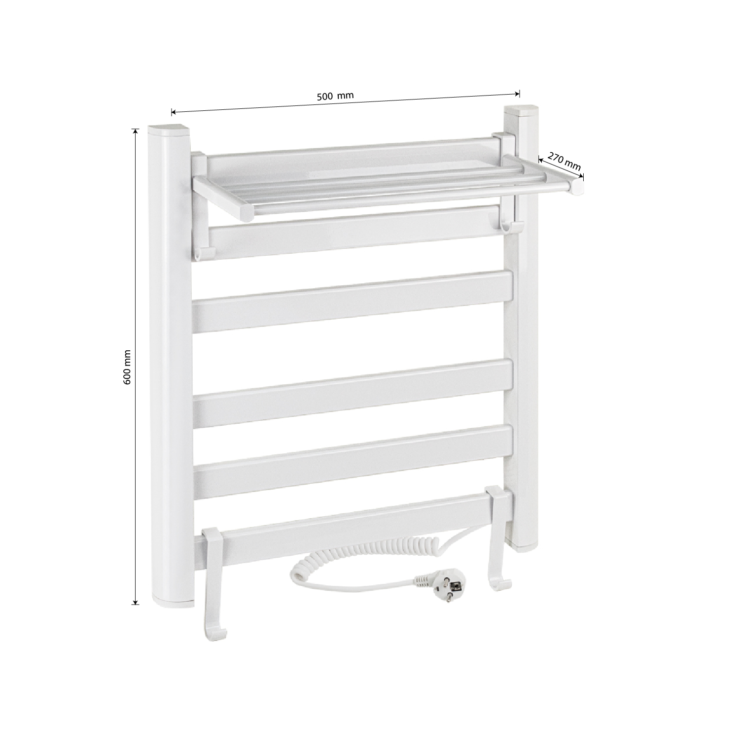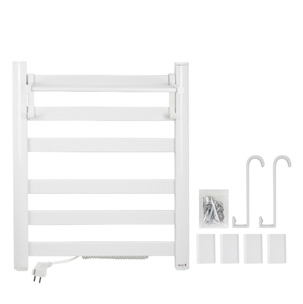 Полотенцесушитель электрический белый, лесенка с полкой и крючками, из алюминия, тэн из углеродного волокна гармонично впишется в современный интерьер и поможет поддержать комфортную атмосферу в ванной комнате, работает вне зависимости от отопительного сезона, и его можно разместить в любом месте ванной или даже на стене в комнате. Сверху нанесено белое полимерное покрытие, устойчивое к высоким температурам. Благодаря продуманному расположению труб можно размещать объемный текстиль, сократив время просушки. Установка и ремонт не требуют работы сантехников. Габаритные размеры: высота 600 мм, ширина 500 мм, полка 270 мм. 6 плоских перекладин, с сухим ТЭНом, 160 W, 220-230 V, 50-60 Гц, t - 55°С, IP 44. Комплект: полотенцесушитель, крепёж, провод с евровилкой для подключения. Вес - 4,500 кг, объём - 0,03800 м3.