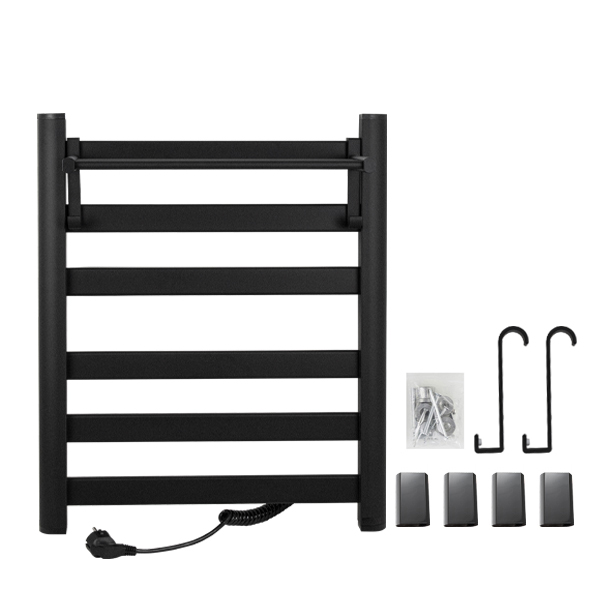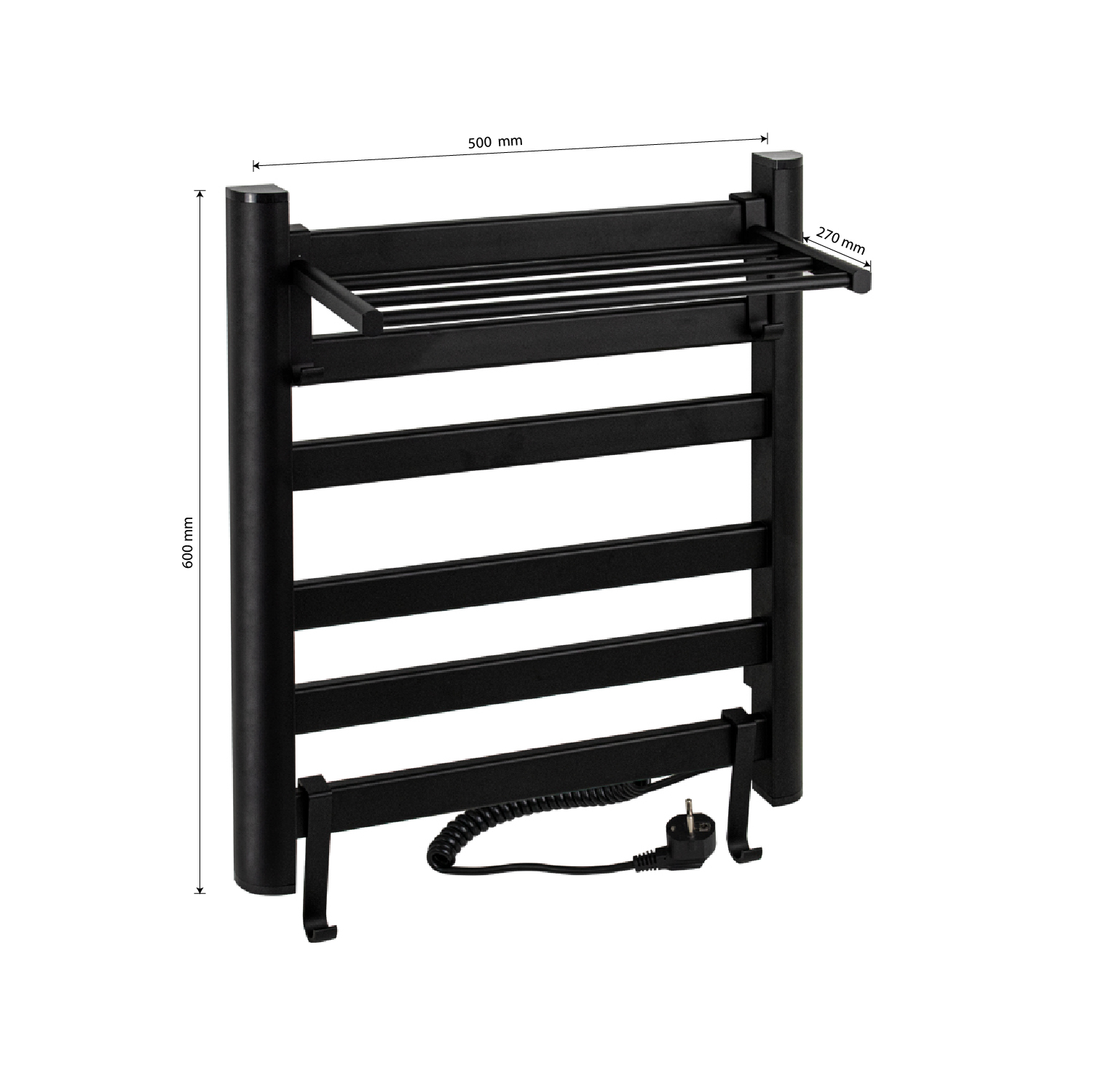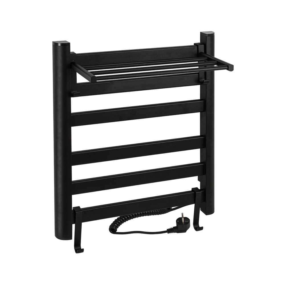 Полотенцесушитель электрический чёрный, лесенка с полкой, из алюминия, тэн из углеродного волокна. Гармонично впишется в современный интерьер и поможет поддержать комфортную атмосферу в ванной комнате, работает вне зависимости от отопительного сезона, и его можно разместить в любом месте ванной или даже на стене в комнате. Сверху нанесено чёрное полимерное покрытие, устойчивое к высоким температурам. Благодаря продуманному расположению труб можно размещать объемный текстиль, сократив время просушки. Установка и ремонт не требуют работы сантехников. Габаритные размеры: высота 600 мм, ширина 500 мм, полка 270 мм. 6 плоских перекладин, с сухим ТЭНом, 160 W, 220-230 V, 50-60 Гц, t - 55°С, IP 44. Комплект: полотенцесушитель, крепёж, провод с евровилкой для подключения. Вес - 4,500 кг, объём - 0,03800 м3.