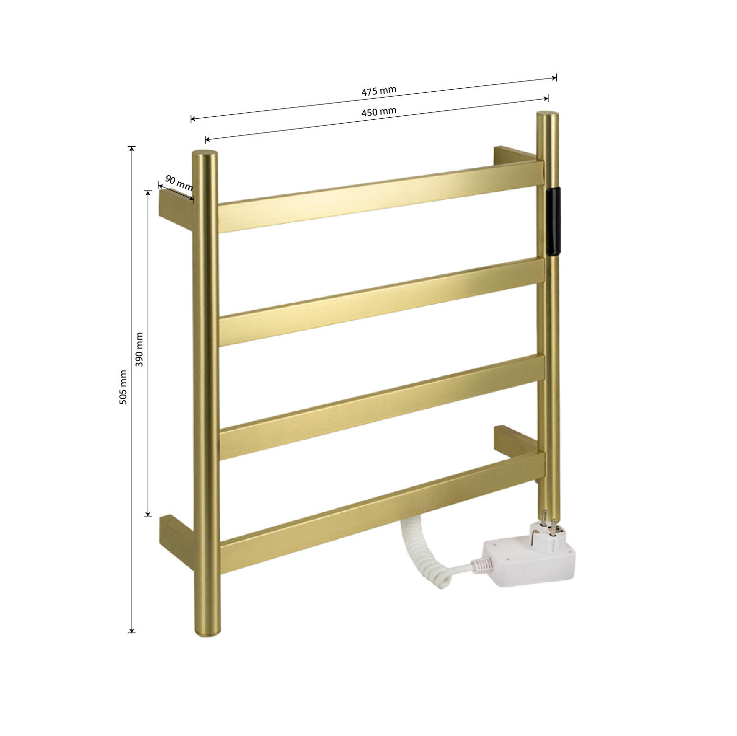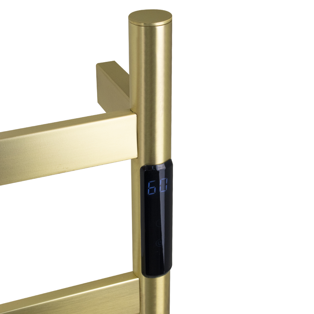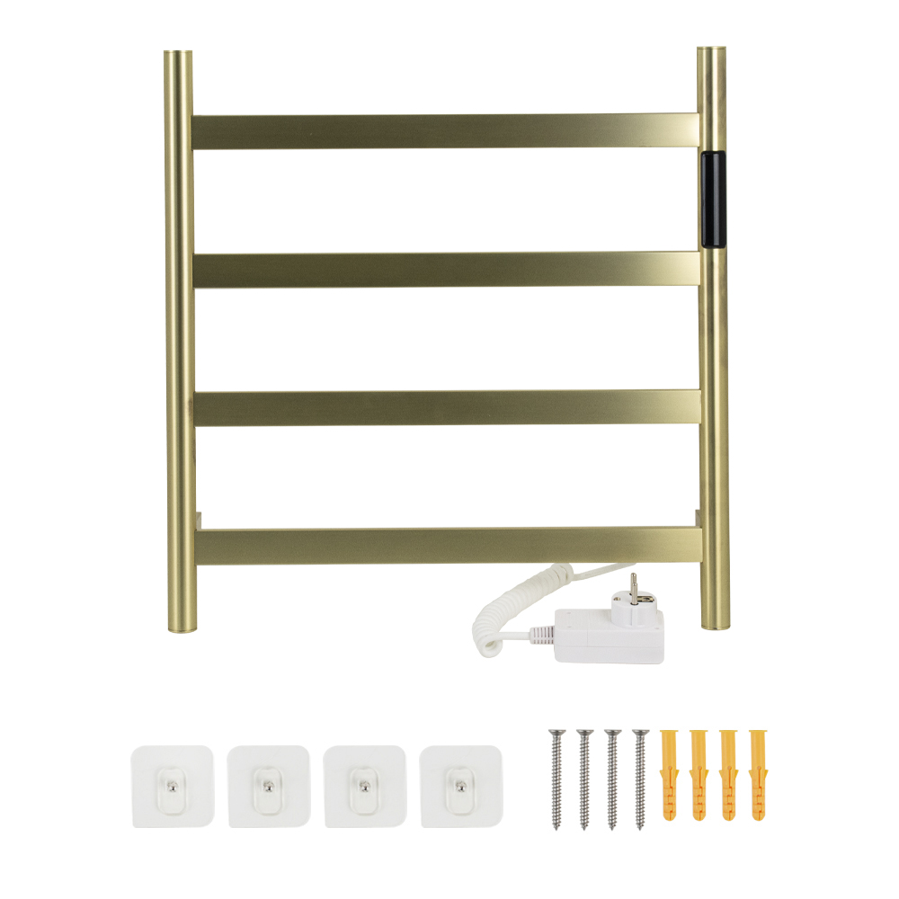 Полотенцесушитель электрический, цвет матовое золото, лесенка, из нержавеющей стали, сенсорное управление с таймером до 24 часов, регулировка температуры от 40°С до 60°С, тэн из углеродного волокна гармонично впишется в современный интерьер и поможет поддержать комфортную атмосферу в ванной комнате, работает вне зависимости от отопительного сезона, и его можно разместить в любом месте ванной или даже на стене в комнате. PVD покрытие цвет бронза, устойчивое к высоким температурам. Благодаря продуманному расположению труб можно размещать объемный текстиль, сократив время просушки. Установка и ремонт не требуют работы сантехников. Габаритные размеры: ширина 475 мм, высота 505 мм, глубина 90 мм. 4 перекладины. С сухим ТЭНом, 75 W, 220-230 V, 50-60 Гц, t 55°С, IP 44. Комплект: полотенцесушитель, крепёж, провод с евровилкой для подключения. Вес - 3,000 кг, объём - 0,04250 м3.