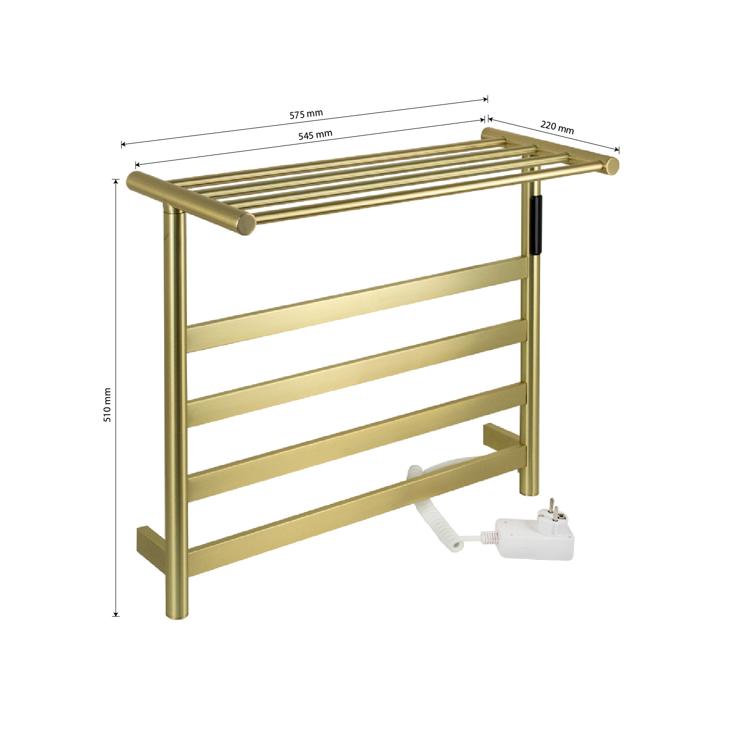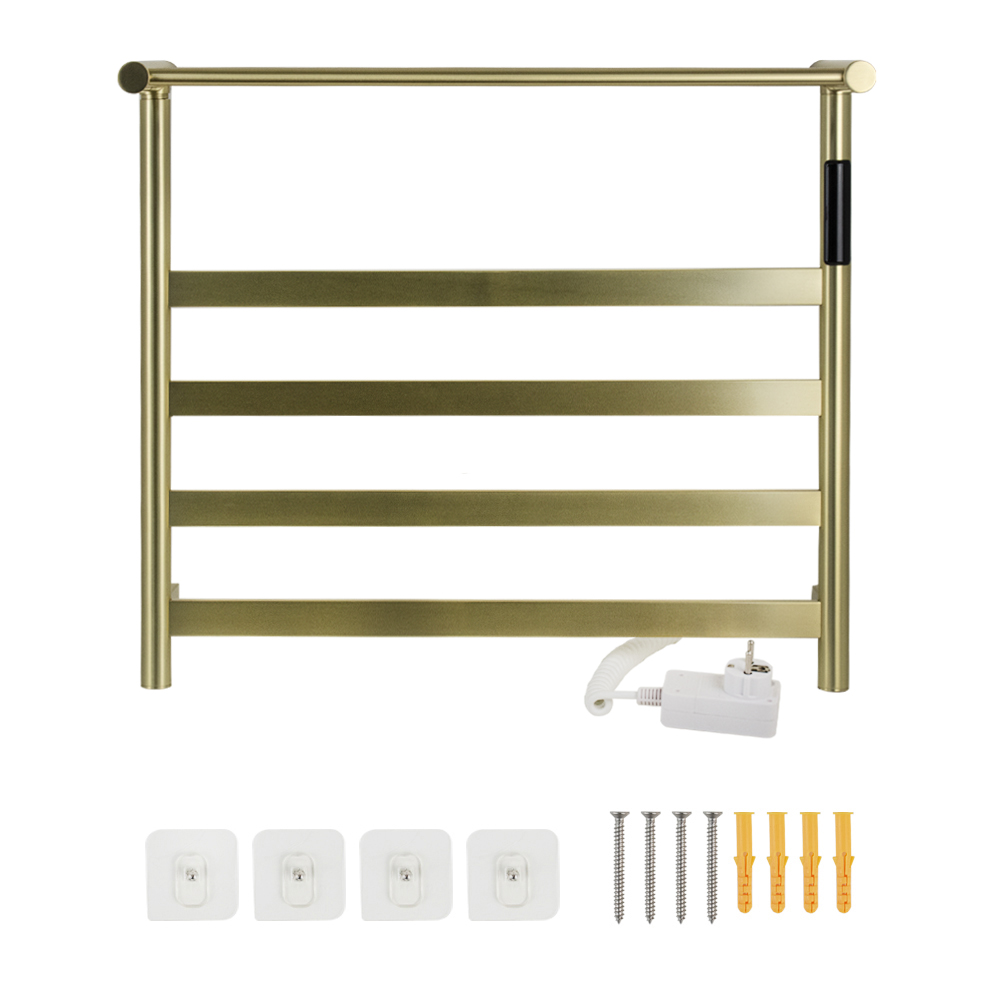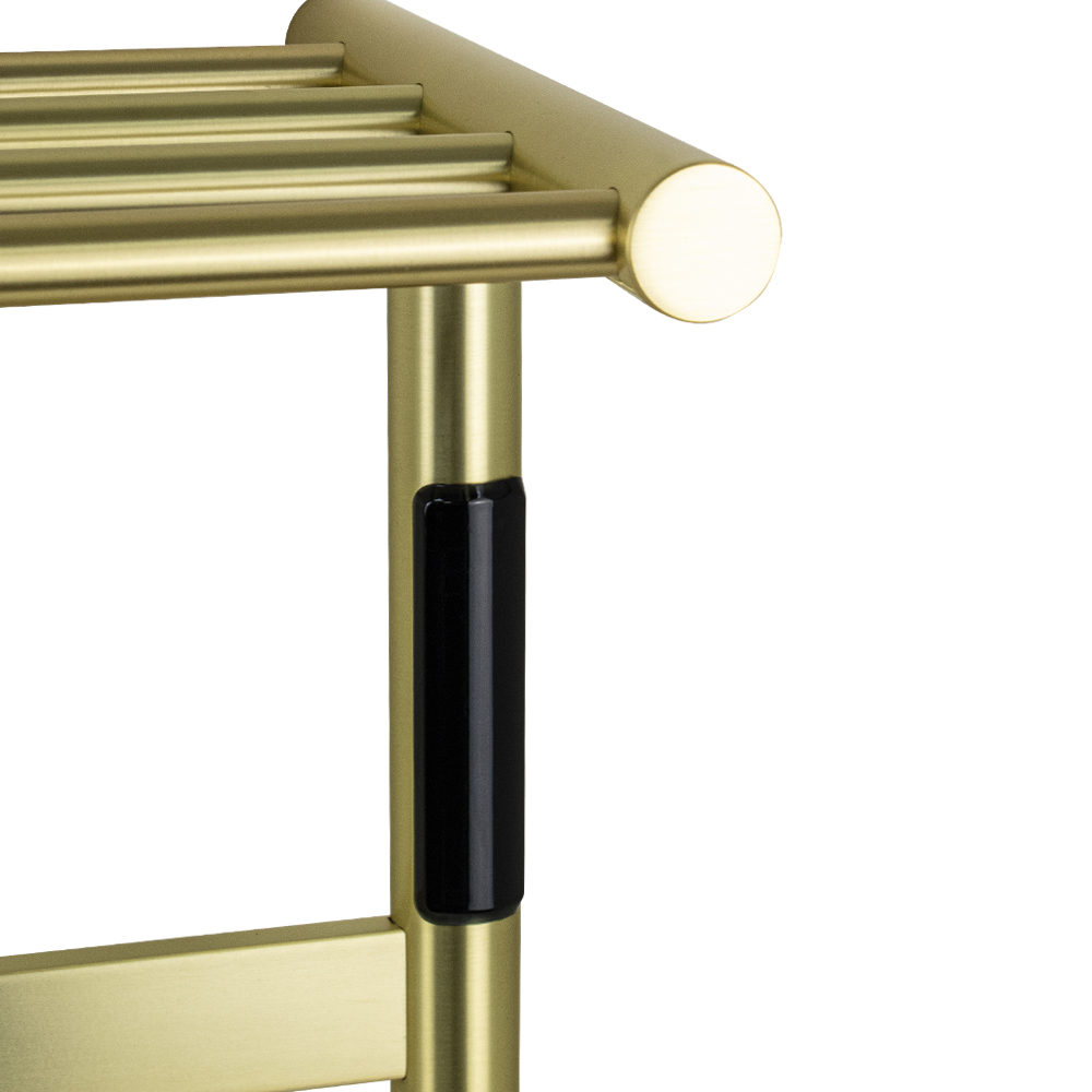 Полотенцесушитель электрический, цвет матовое золото, лесенка с полкой, из нержавеющей стали, сенсорное управление с таймером до 24 часов, регулировка температуры от 40°С до 60°С, тэн из углеродного волокна гармонично впишется в современный интерьер и поможет поддержать комфортную атмосферу в ванной комнате, работает вне зависимости от отопительного сезона, и его можно разместить в любом месте ванной или даже на стене в комнате. PVD покрытие цвета бронза, устойчивое к высоким температурам. Благодаря продуманному расположению труб можно размещать объемный текстиль, сократив время просушки. Установка и ремонт не требуют работы сантехников. Запуск - нажатием одной кнопки. Габаритные размеры: ширина 575 мм, высота 510 мм, полка 210 мм. 4 перекладины. С сухим ТЭНом, 75 W, 220-230 V, 50-60 Гц, t - 55°С, IP 44. Комплект: полотенцесушитель, крепёж, провод с евровилкой для подключения. Вес - 4,200 кг, объём - 0,05000 м3.