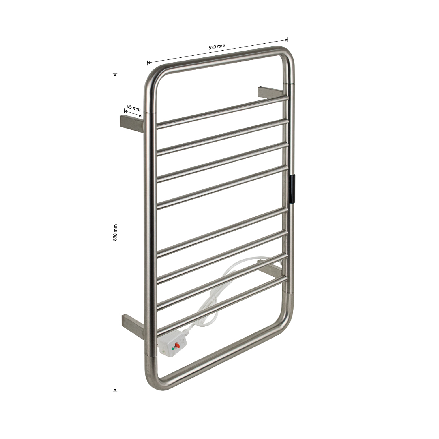 Полотенцесушитель электрический, с заоваленными углами, матовый, лесенка, из нержавеющей стали марки 304, тэн из углеродного волокна гармонично впишется в современный интерьер и поможет поддержать комфортную атмосферу в ванной комнате, работает вне зависимости от отопительного сезона, и его можно разместить в любом месте ванной или даже на стене в комнате. Матовая поверхность устойчива к высоким температурам. Благодаря продуманному расположению труб можно размещать объемный текстиль, сократив время просушки. Установка и ремонт не требуют работы сантехников. Габариты и параметры: высота 840 мм, ширина 530 мм, глубина 95 мм. 10 перекладин, с сухим ТЭНом, W, 220-230 V, 50-60 Гц, t - 35-70°С, IP 44. Комплект: полотенцесушитель, крепёж, провод с евровилкой для подключения. Вес - 5 кг, объём - 0,07666 м3.