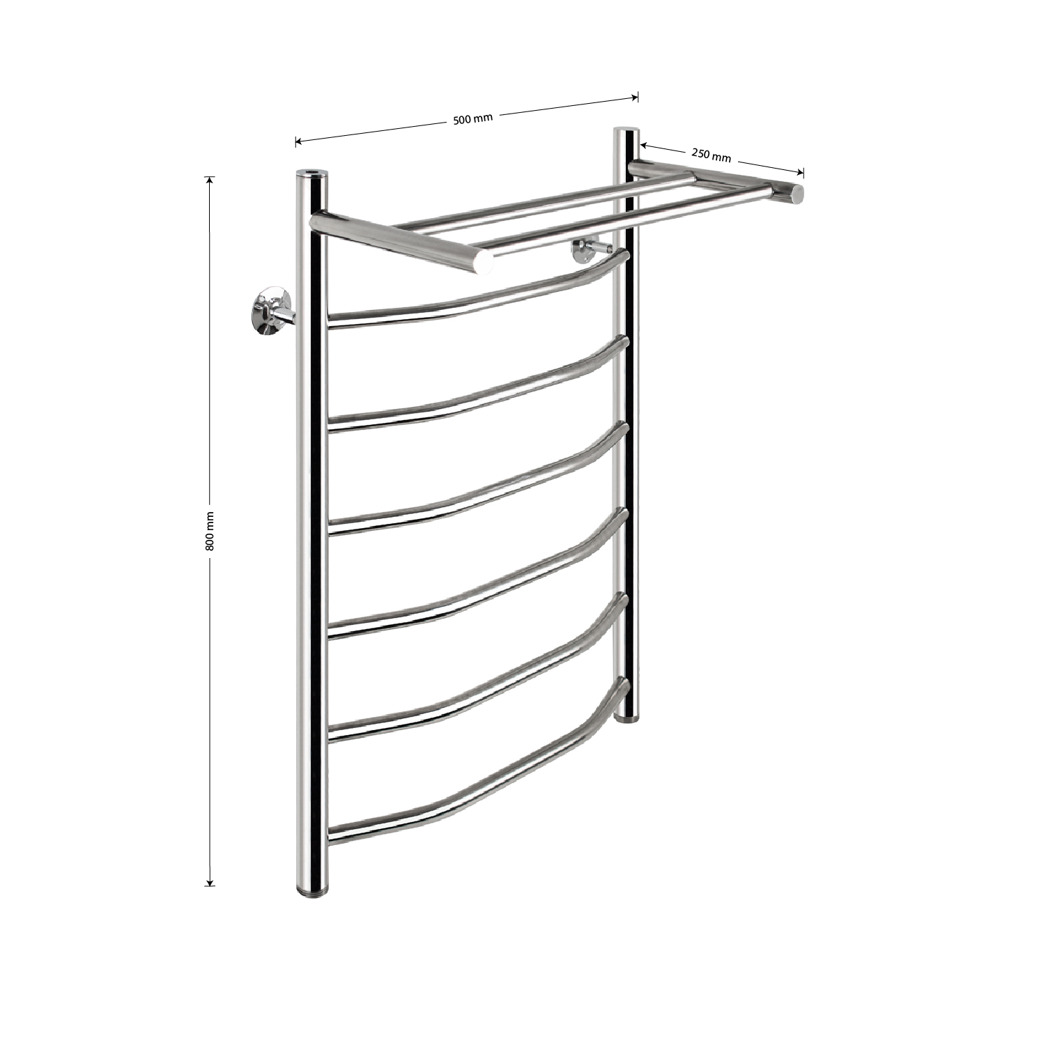 Водяной полотенцесушитель, хромированный, лесенка - трапеция с полкой, изготовлен из высокопрочной нержавеющей стали. Металл устойчив к коррозии и деформации, отлично выдерживает перепады температуры и давления в системе водоснабжения. После установки полотенцесушителя в помещении становится значительно комфортнее: уменьшается влажность, исчезает конденсат, снижается риск появления плесени. Изделие не только поддержит комфортную температуру в санузле, но и быстро просушит белье. Подключение 1". Подключается к системе горячего водоснабжения, функционирует круглый год. Габаритные размеры: высота 800 мм, ширина 500 мм, полка 220 мм, диаметр трубы 32 мм, толщина 2 мм. Комплект: полотенцесушитель, 4 крепления, кран Маевского поможет удалить воздух из системы, декоративные заглушки. Вес - 6,500 кг, объём - 0,07800 м3.