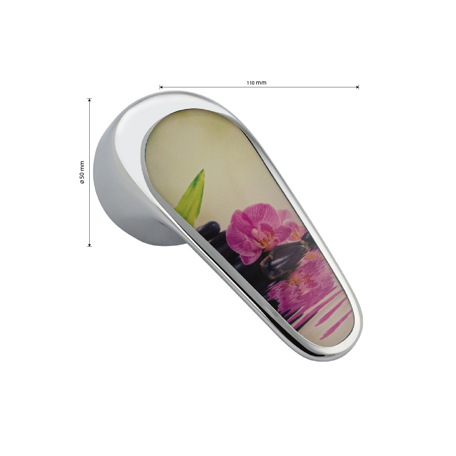 Ручка с фото - орхидея, для шарового смесителя, для корпуса 40 мм, металлическая, литая. Габаритные размеры: длина 110 мм, ширина 50 мм. Вес - 0,200 кг, объем 0,00051 м3.